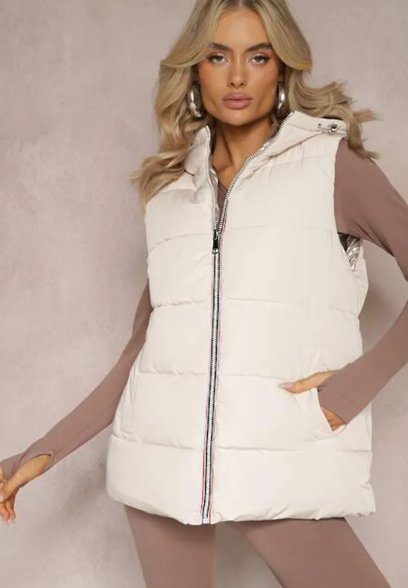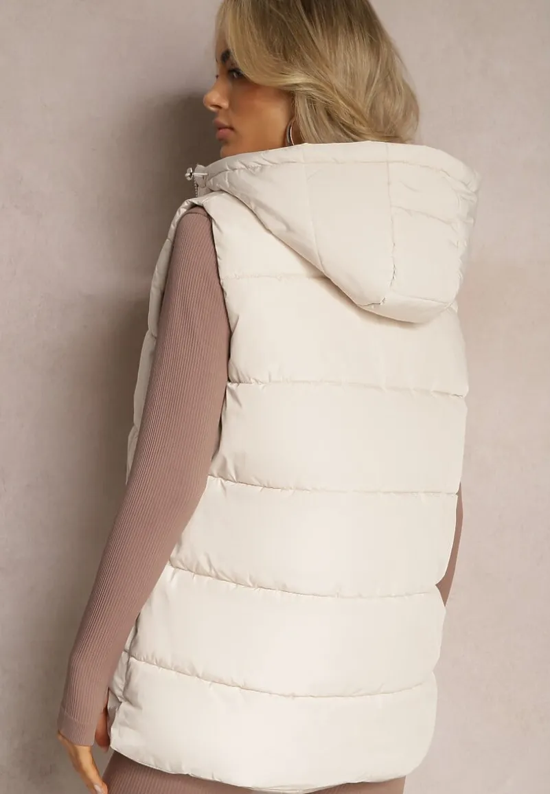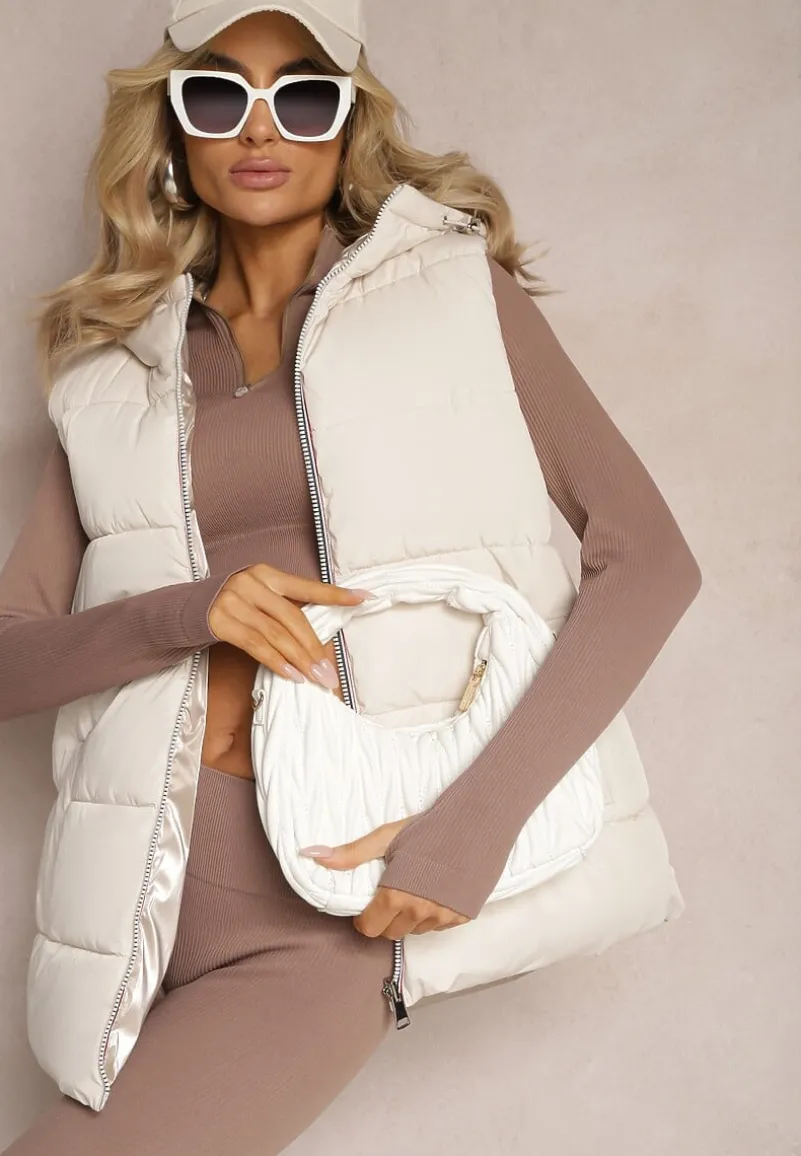 Kamizelka Zelini z kapturem, o dwustronnym fasonie. Z jednej strony pikowana. Przód z zapięciem na zamek błyskawiczny. Wsuwane kieszenie na wysokości bioder.