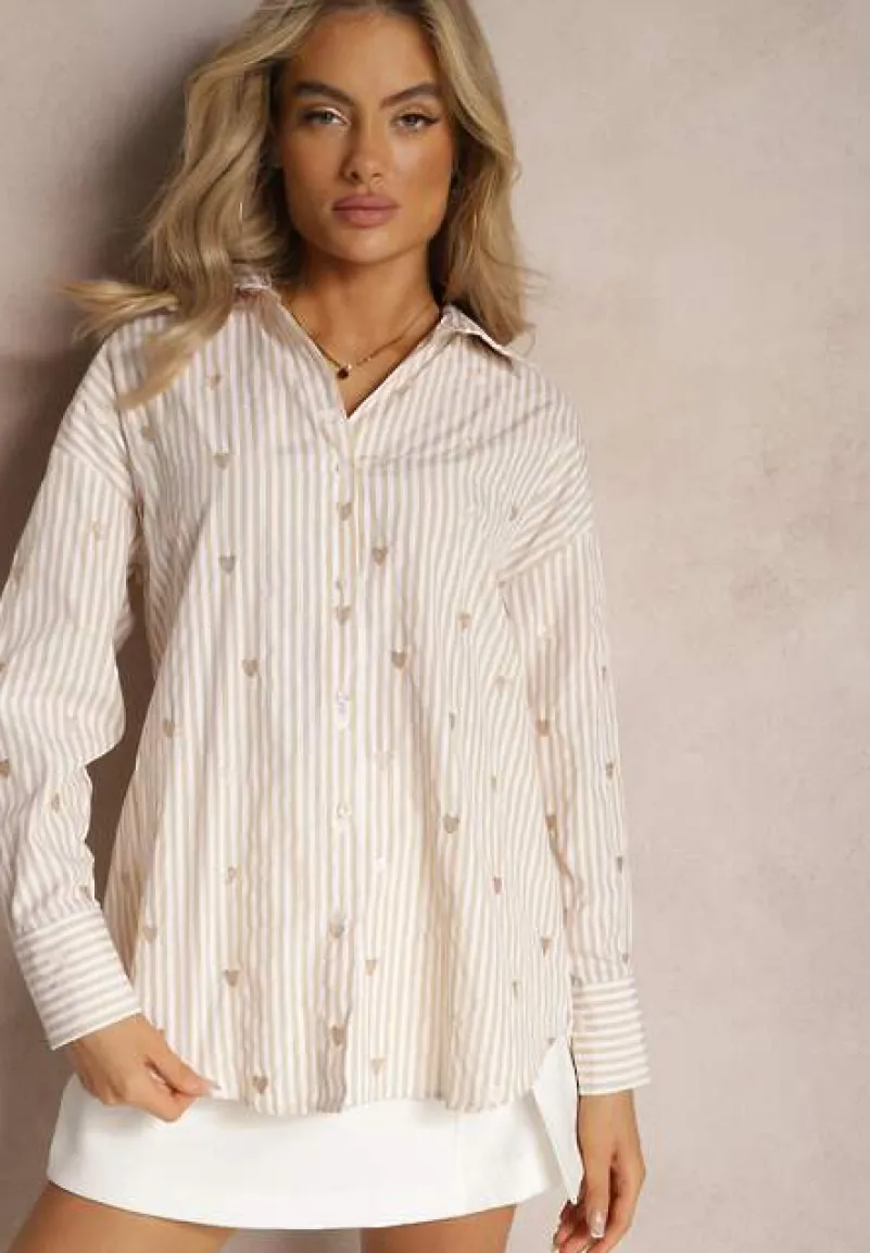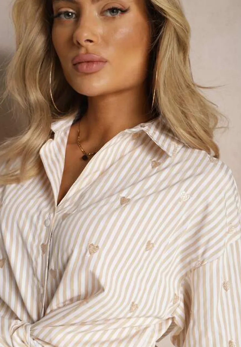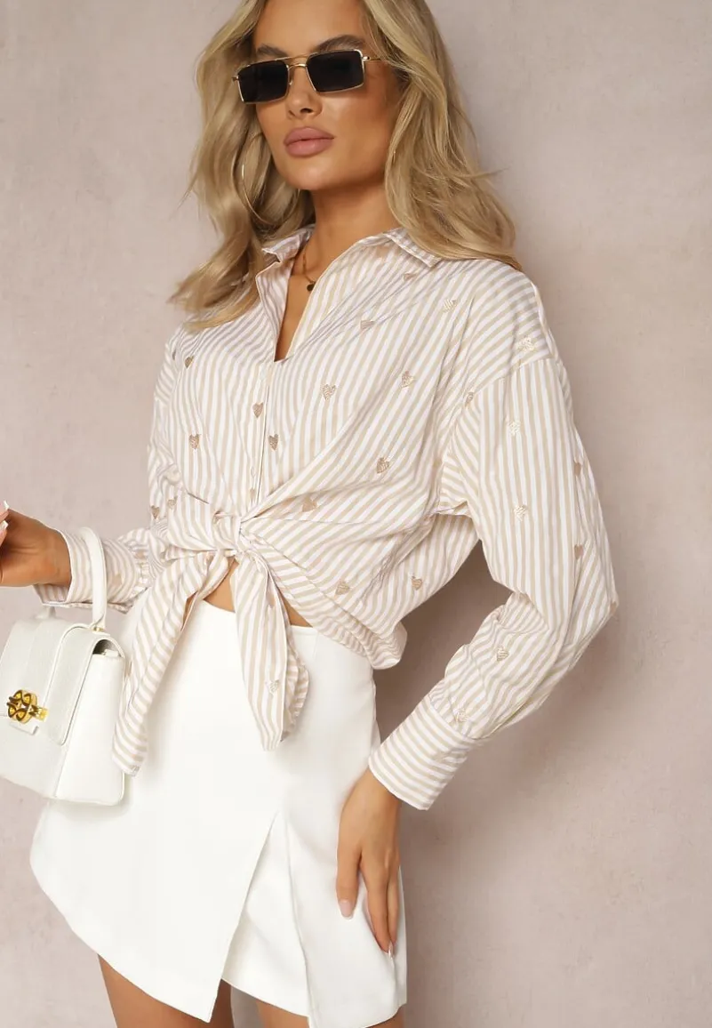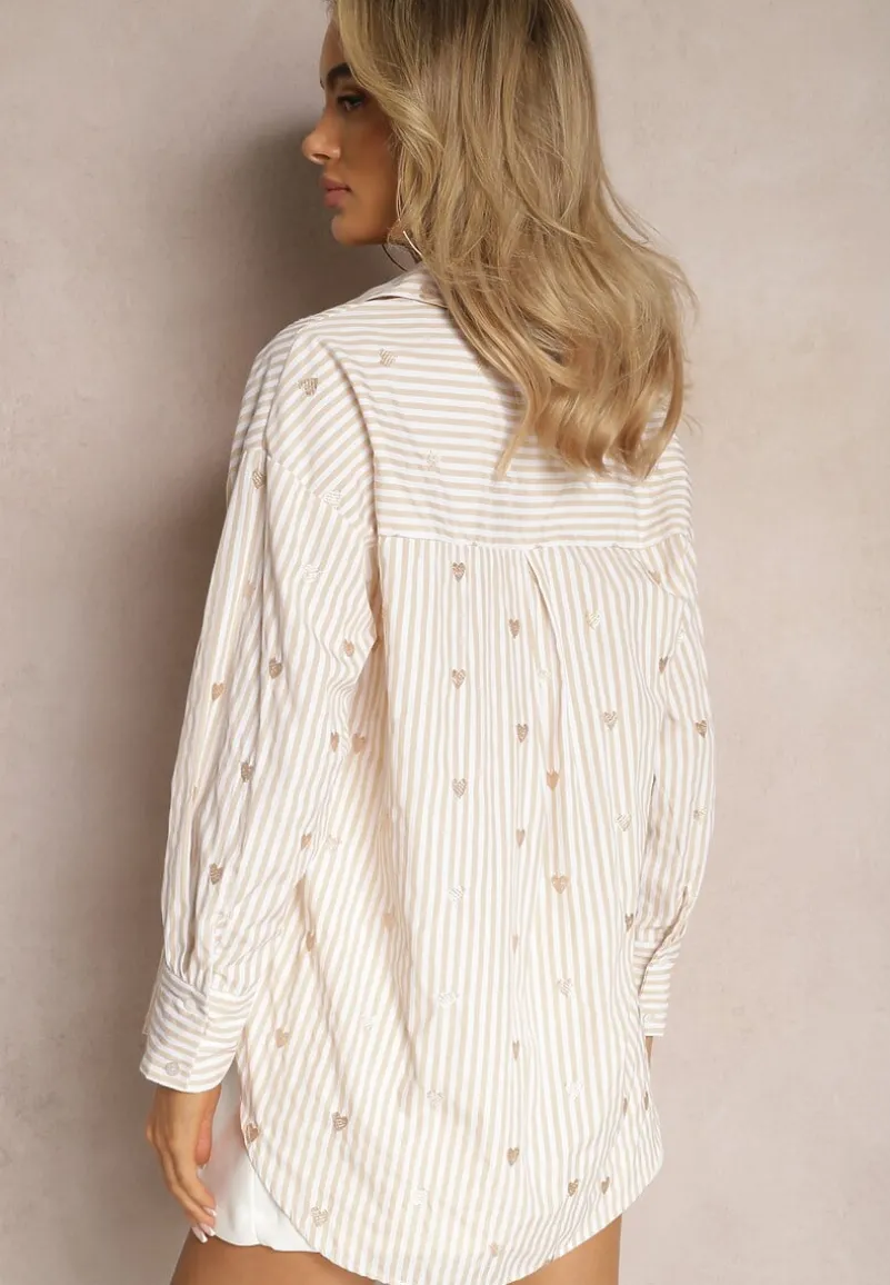 Paski dodają koszuli lekkości i świeżości, a haftowane serca stanowią subtelny, ale wyrazisty akcent, który nadaje całości wyjątkowego charakteru.