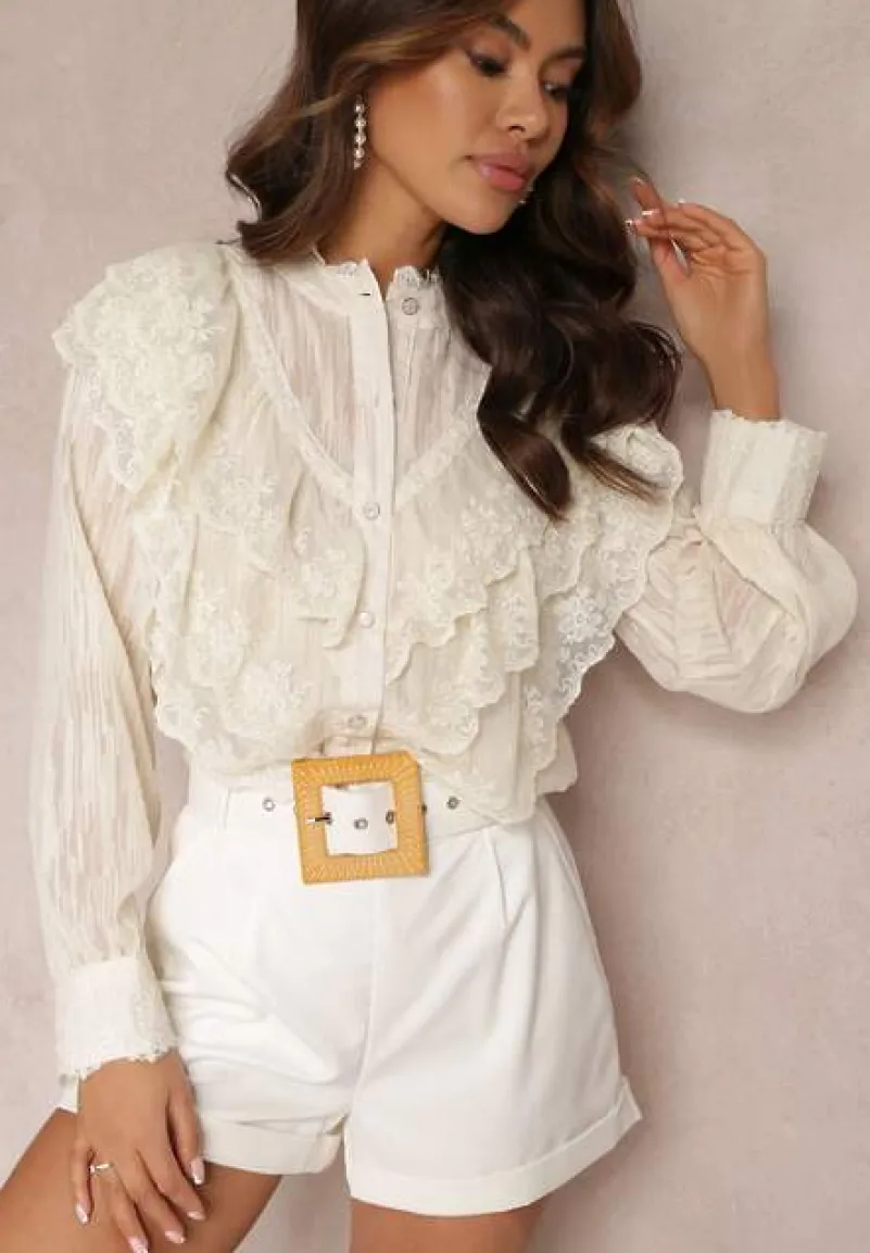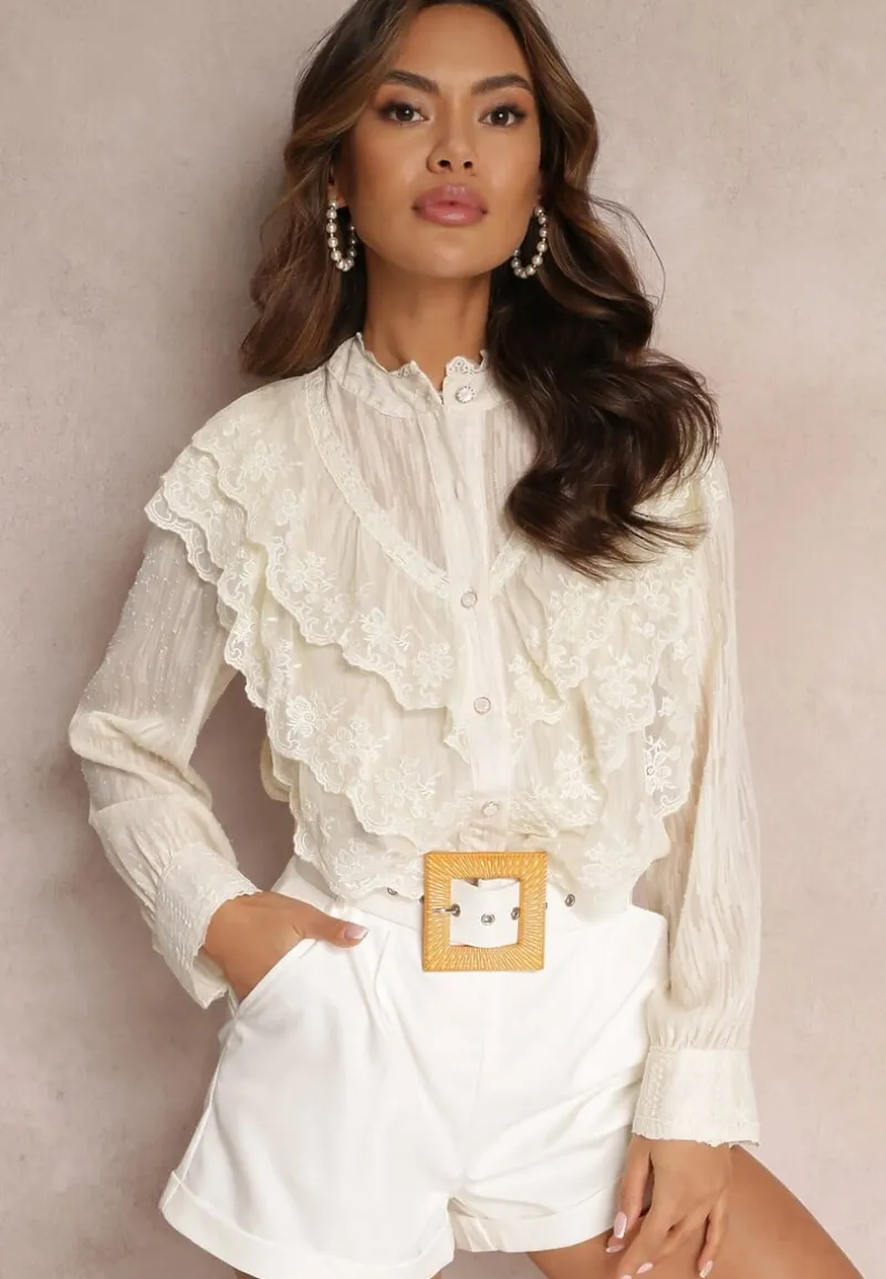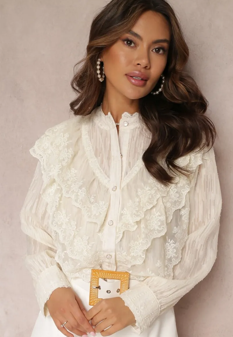 Elegancka koszula Daizee ze stójką i wstawkami z siateczki i hafowanej tkaniny. Zapinana na ozdobne guziki. Model z długimi rękawami zakończonymi szerokimi, ozdobnymi mankietami. Modna koszula Daizee sprawdzi się przez cały rok.