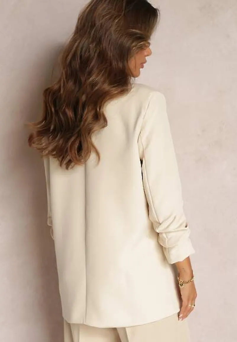 Marynarka Orolea wykonana z tkaniny o gładkiej i jednolitej strukturze. Elegancki i ponadczasowy design. Rękawy o długości 3/4, dekorowane subtelnym marszczeniem. Środek podszyty podszewką. Z głębokim, trójkątnym dekoltem oraz wykładanym kołnierzem. Po bokach ozdobne klapy. Marynarka Orolea wygląda zjawiskowo zestawiona zarówno z minimalistyczną, jak i wzorzystą stylizacją!