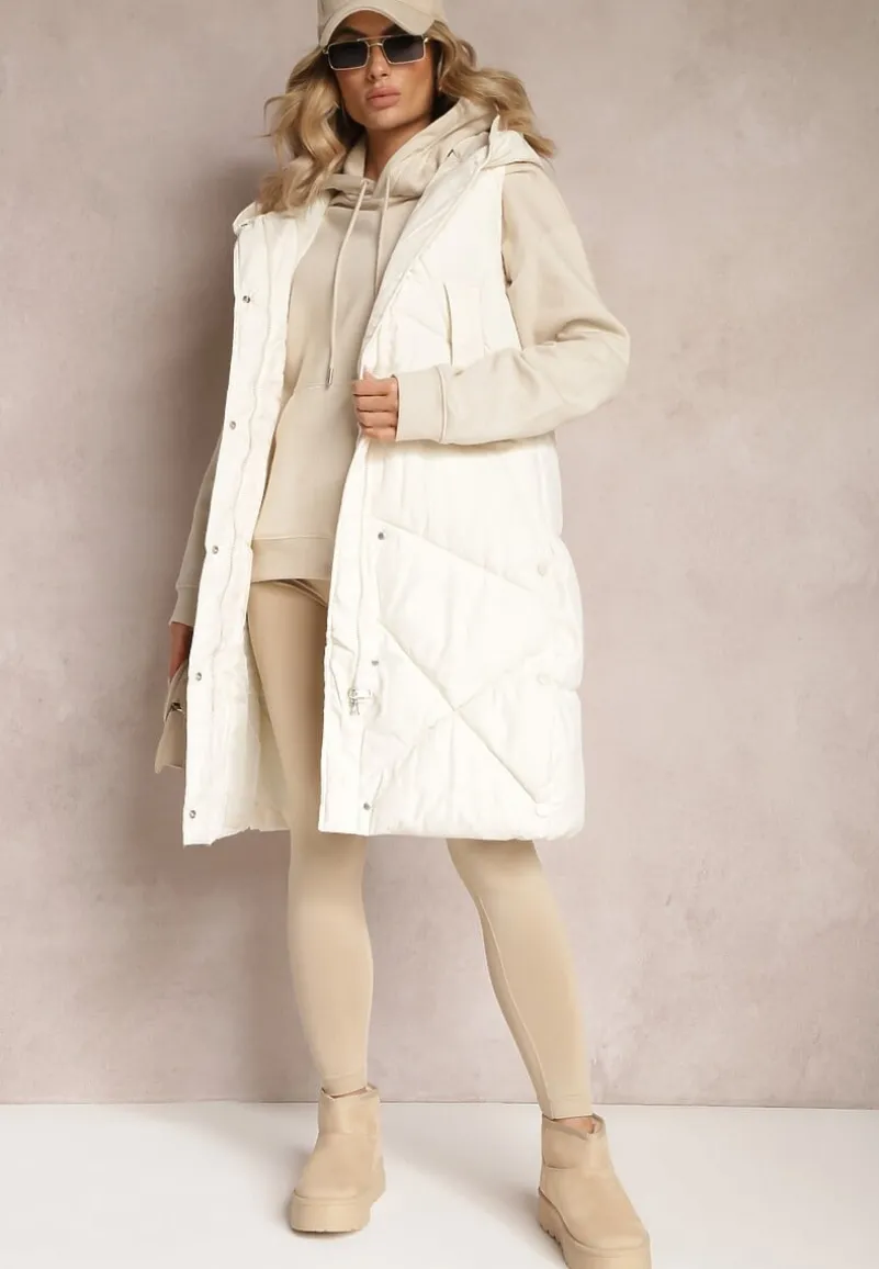 Pikowana Kamizelka Naiarres zasuwana z przodu na zamek błyskawiczny, ukryty pod plisą na napy. Posiada nieodpinany kaptur. Na dole po bokach zapinana na napy.