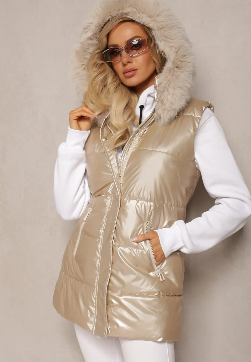 Pikowana Kamizelka Alephne z odpinanym kapturem i również odpinaną imitacją futerka. Zapinana na suwak ukryty pod plisą na napy. Po bokach zasuwane kieszenie.