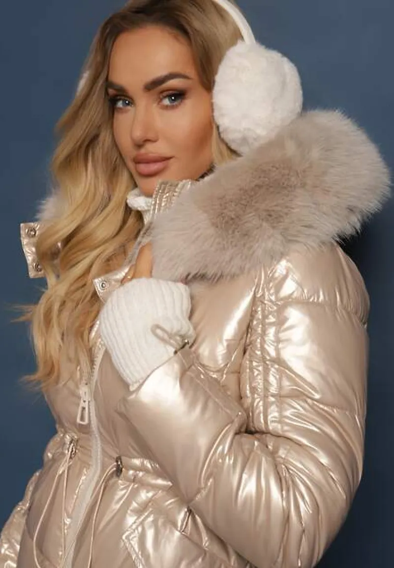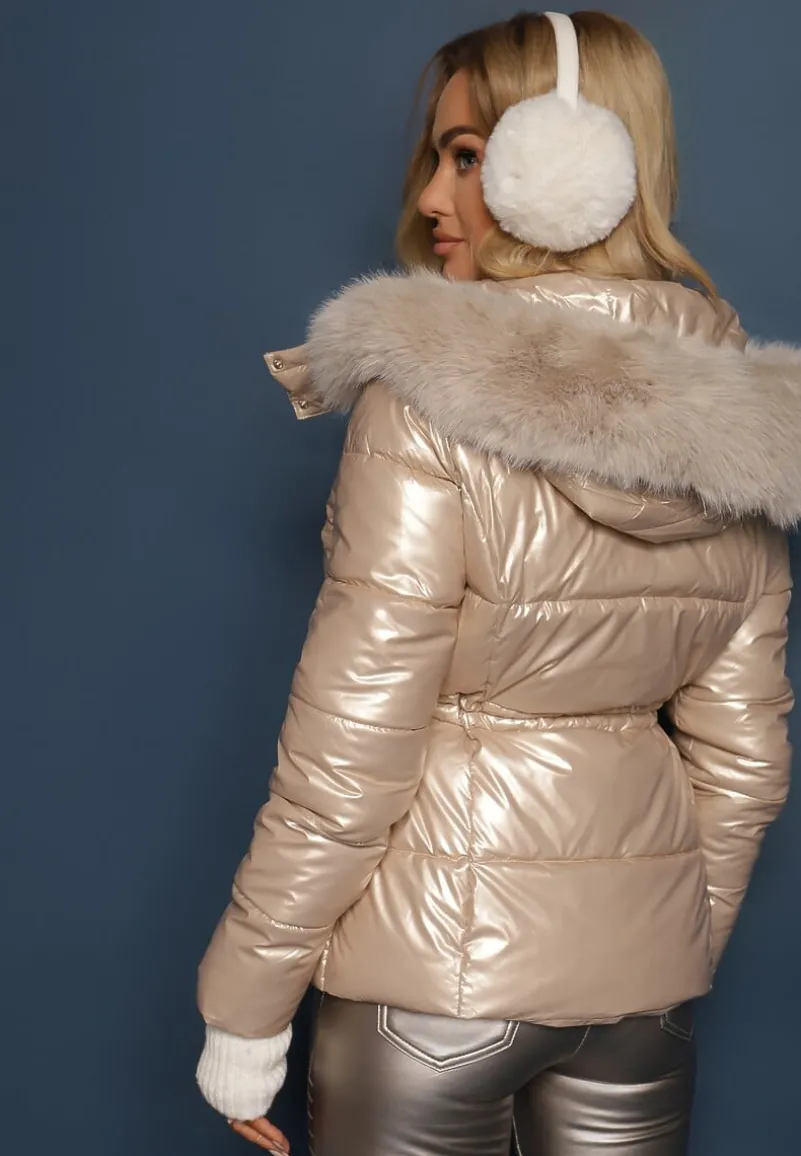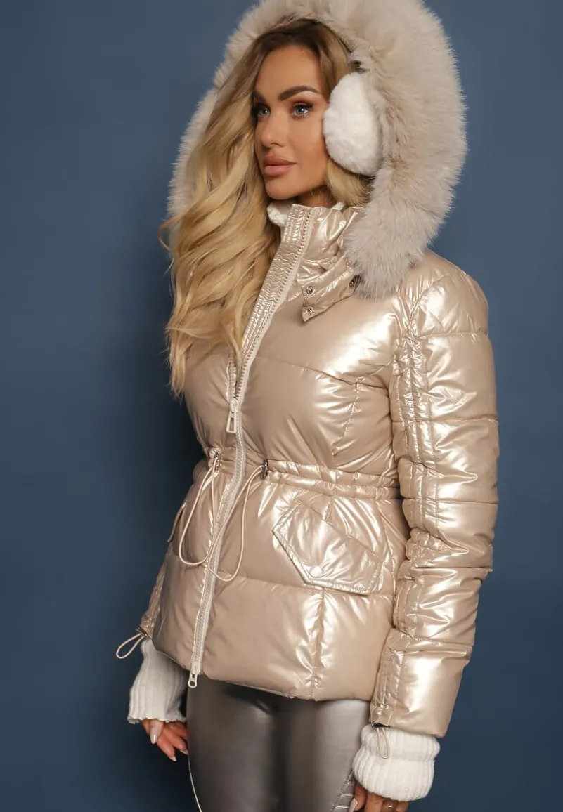Pikowana kurtka z kieszeniami na napy, posiada szeroki kaptur z odpinanym futrzanym kołnierzem. Na dole kurtki stopery do regulacji szerokości.