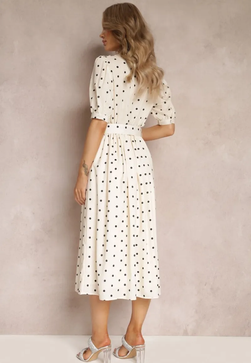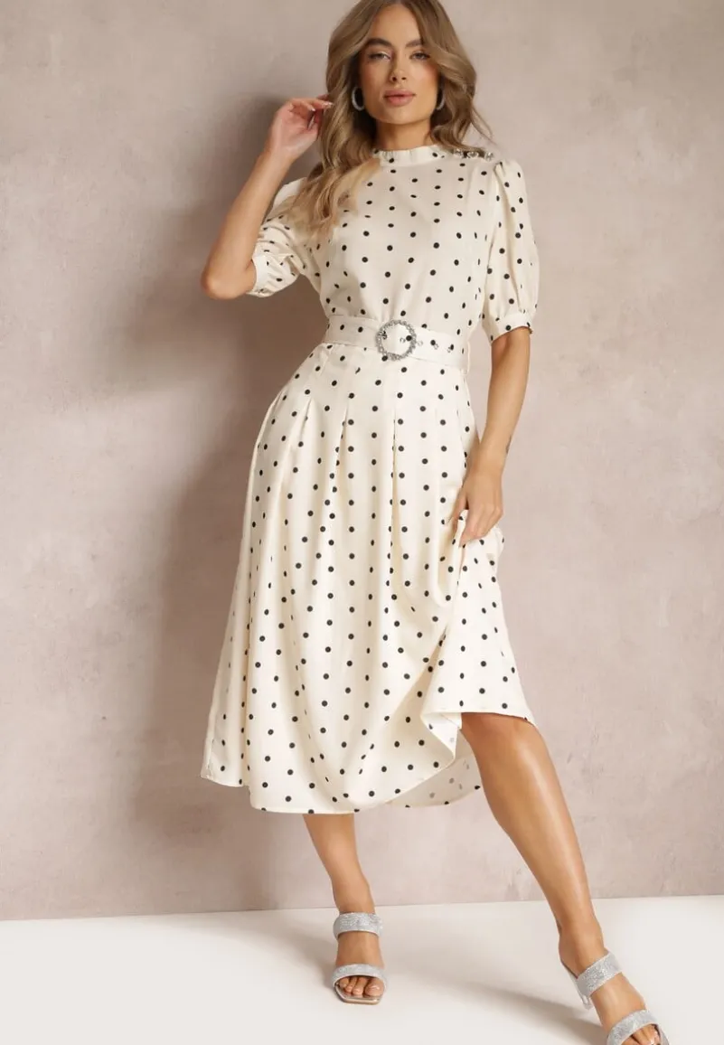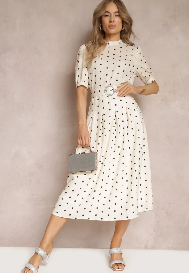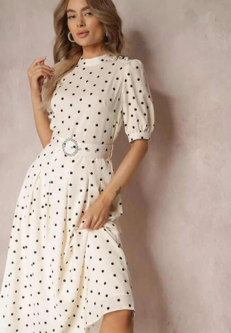Elegancka sukienka Abennita o długości maxi z gumką w pasie. Dodatkowo wiązana materiałowym paskiem z ozdobną klamerką. Jedno ramię zdobione guzikami. Model z podszewką. Świetnie sprawdzi się ze szpilkami czy czółenkami na obcasie.