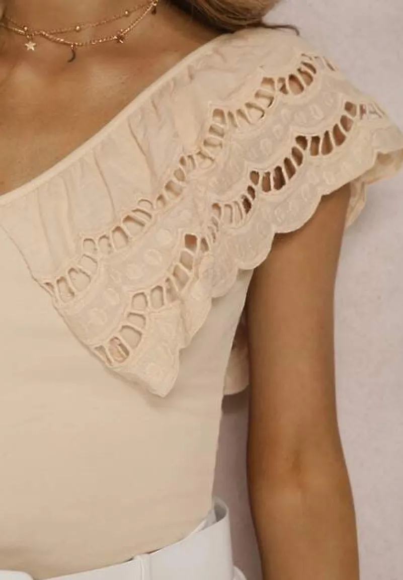 Body Phaedrite z dekoracyjnym, krótkim rękawem Rękaw tworzą kaskadowe, krótkie falbanki w ażurowym stylu. Trójkątny dekolt z przodu i z tyłu. Dół mocno wycięty, zapinany na zatrzaski. Wykonane z haftowanego, elastycznego materiału (bawełna 95%). Body doskonale dopasuje się do sylwetki, a dekoracyjny rękaw doda elegancji do całej stylizacji.