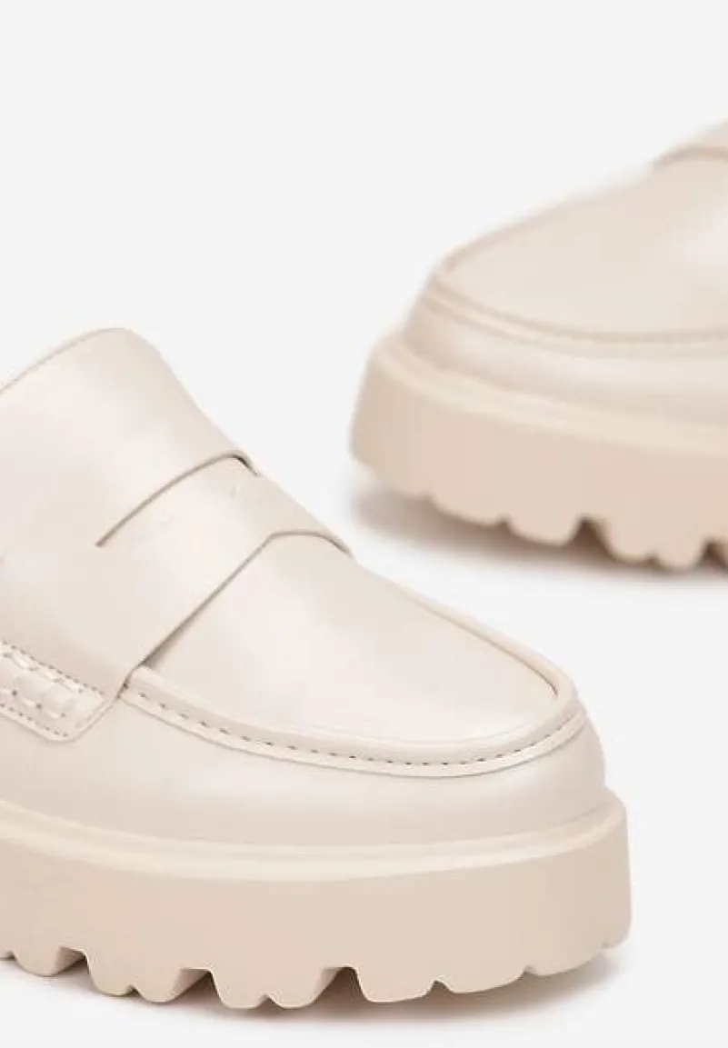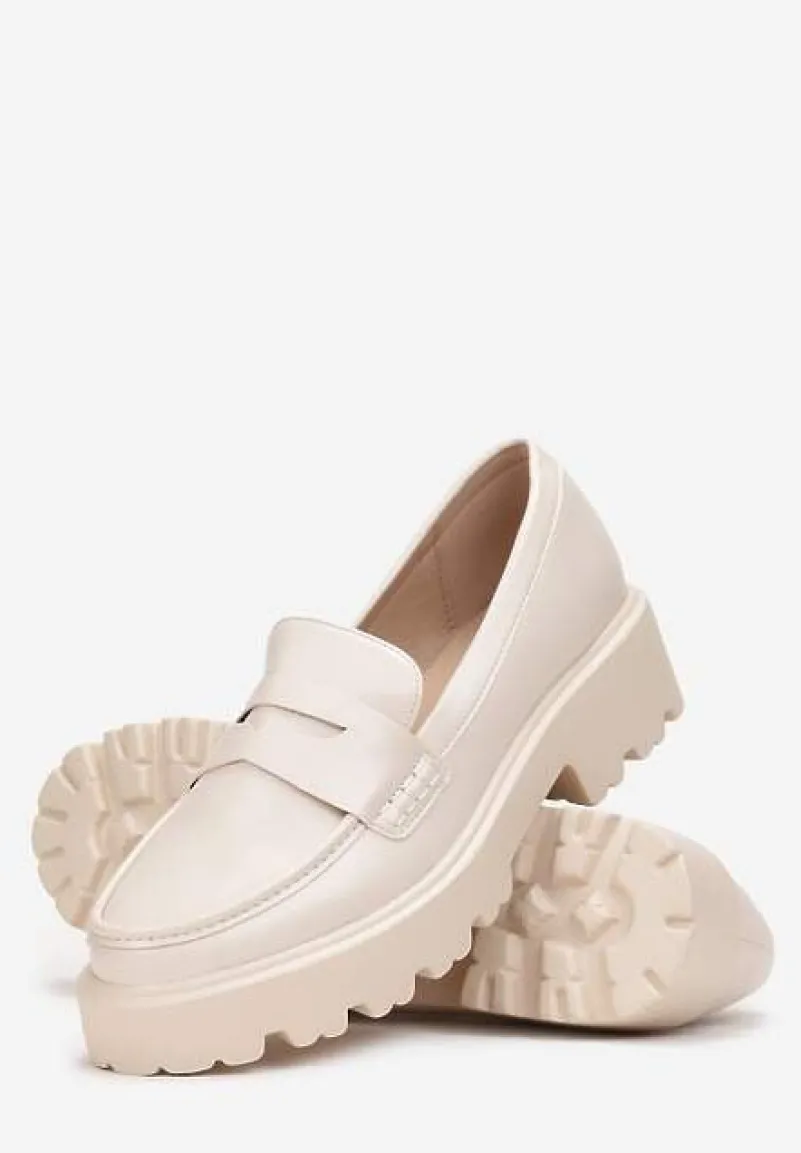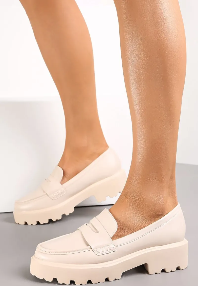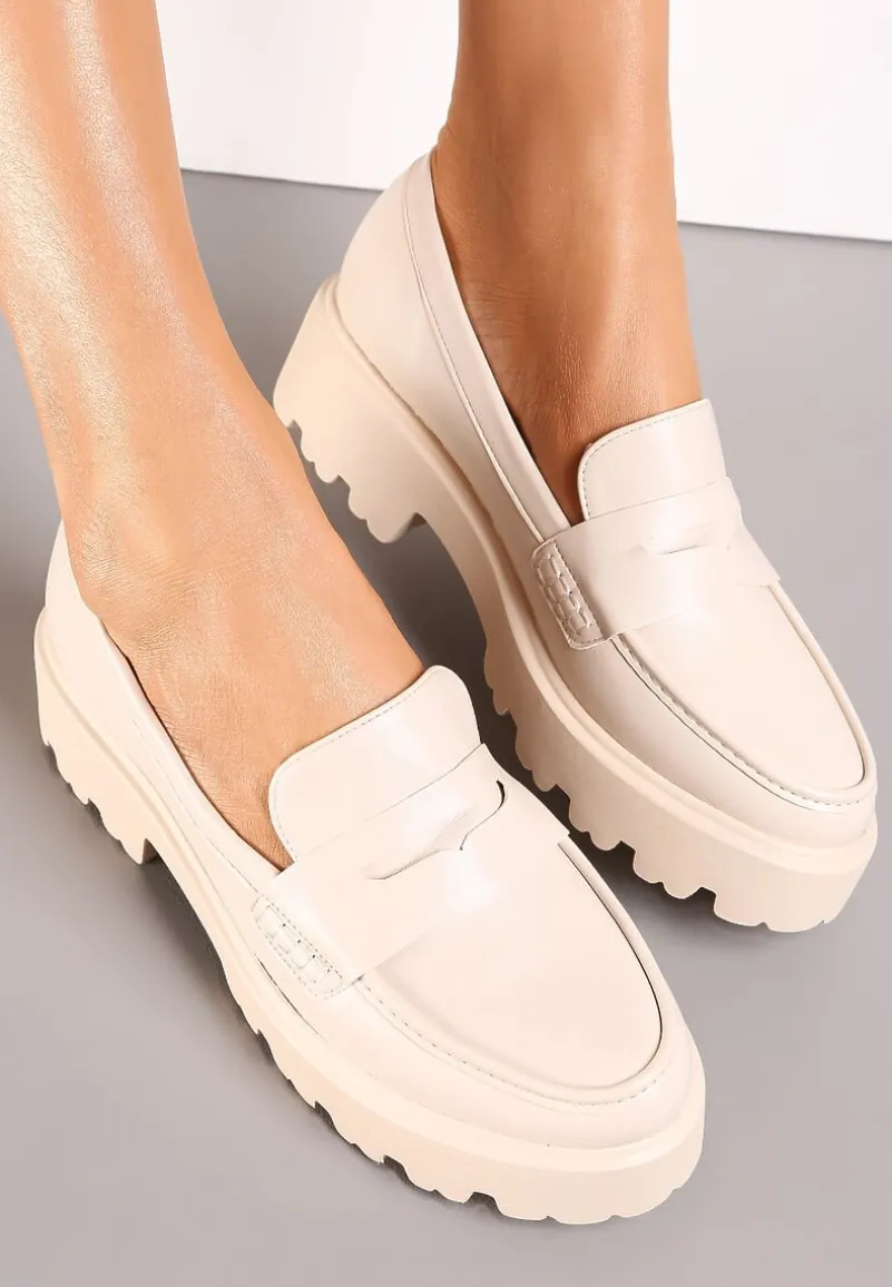 Mokasyny Dansitu z ekoskóry w jednolitym kolorze. Masywna podeszwa z bieżnikiem oraz wkładka z ekoskóry. Model z okrągłym noskiem, wsuwany. Mokasyny zdobią przeszycia. Buty pasują na wąską stopę. Loafersy już od dawna są gorącym trendem, którego nie może zabraknąć w Twojej szafie. Znakomicie pasują do casualowych oraz smart casualowych stylizacji, np. w połączeniu z zamszową spódnicą midi, koszulą i torebką na łańcuszku.