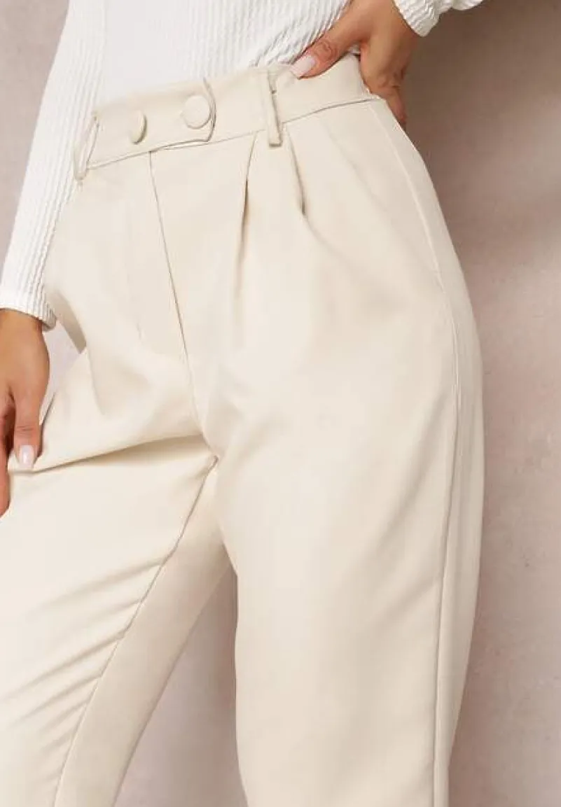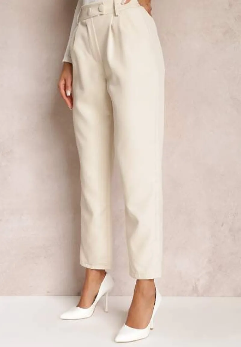 Spodnie z wszytą z tyłu gumką w pasie. Zapinane na dwa guziki i zamek błyskawiczny. Wsuwane kieszenie na wysokości bioder. Model w stylu cygaretek z wysokim stanem. Świetne do trampek i eleganckich szpilek.