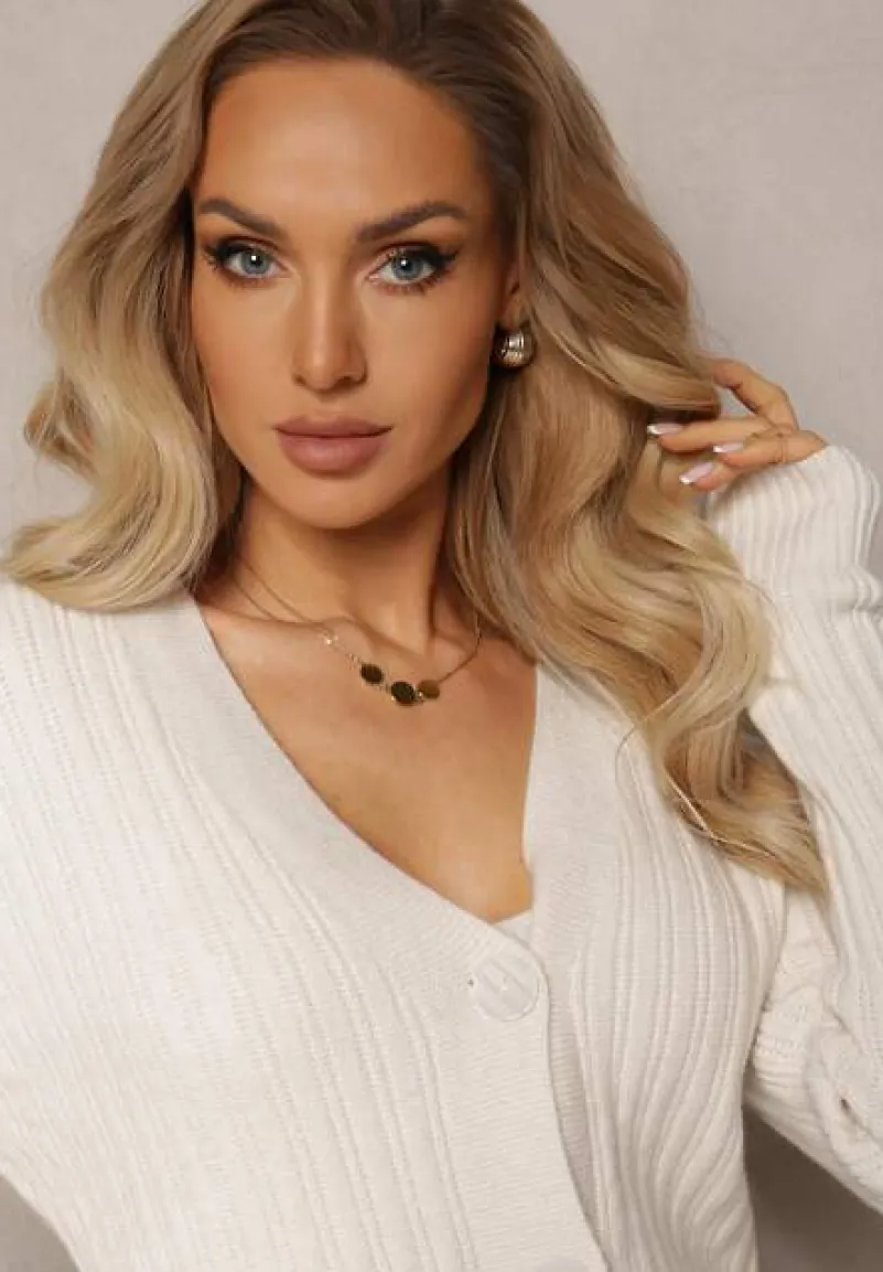 Komplet Mystice wykonany z prążkowanej dzianiny, składa się z sukienki i kardiganu. Sukienka na szerokich ramiączkach, bez podszewki. Kardigan zapinany z przodu na rząd guzików.