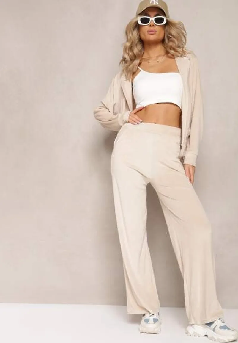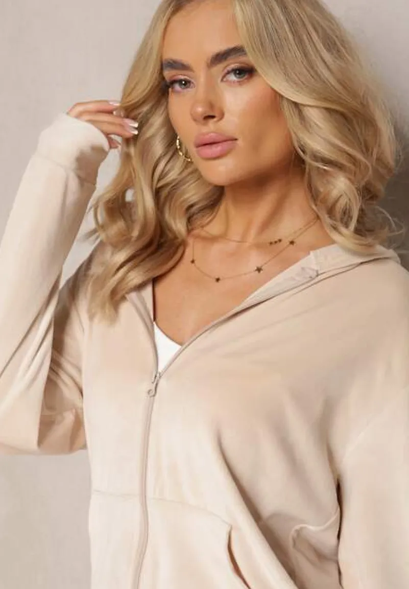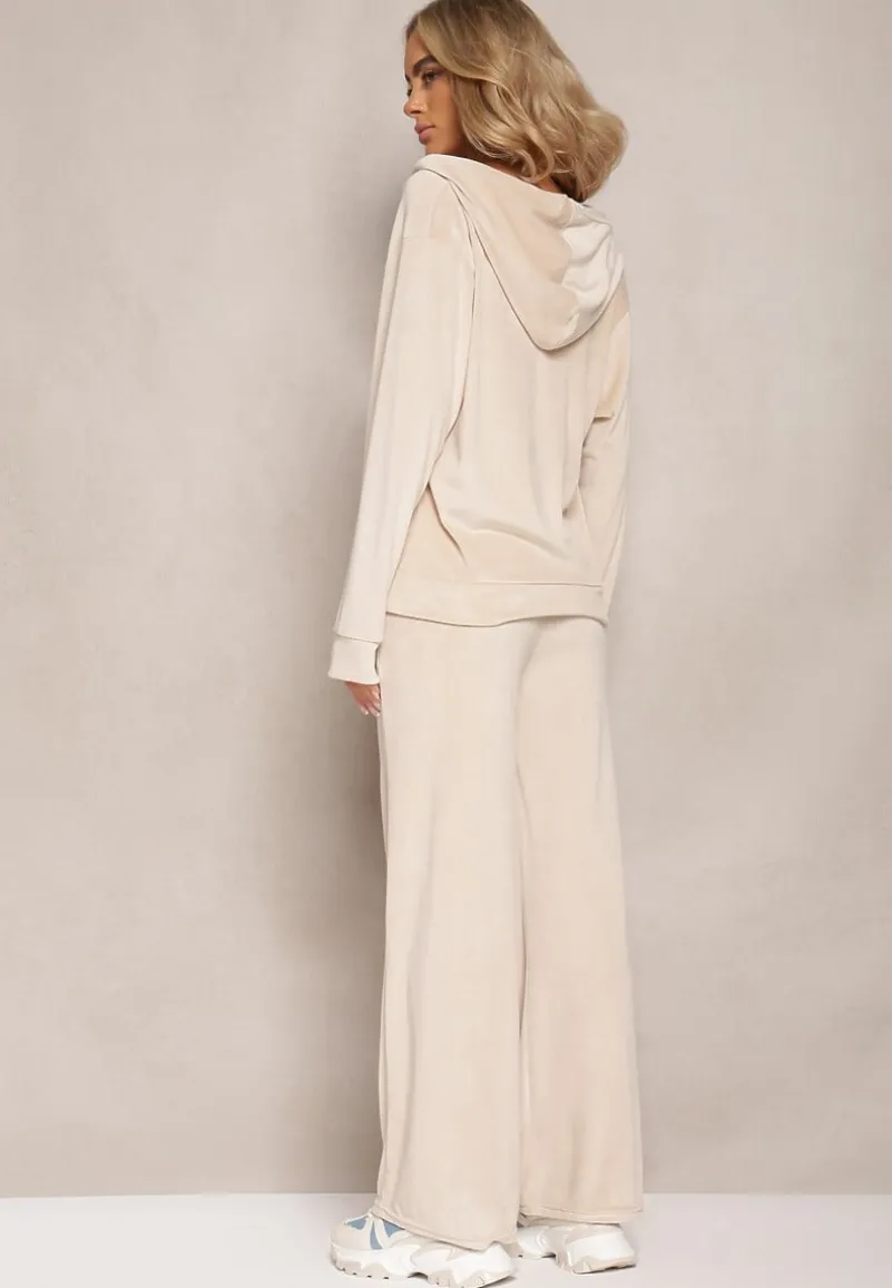Komplet dresowy Anelivs z bluzą z kapturem i szerokimi spodniami wykonany z miękkiej dzianiny welurowej. Komplet posiada wsuwane kieszonki.