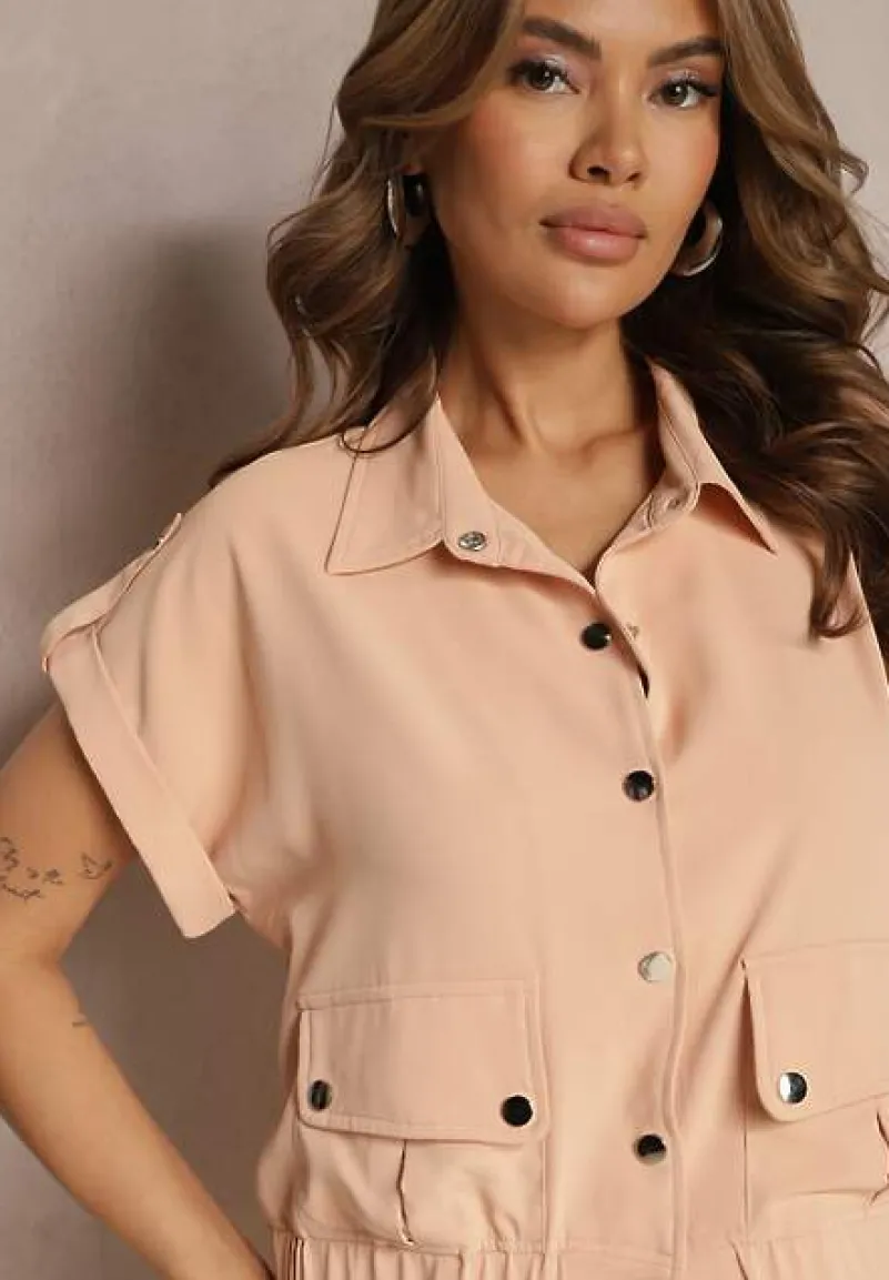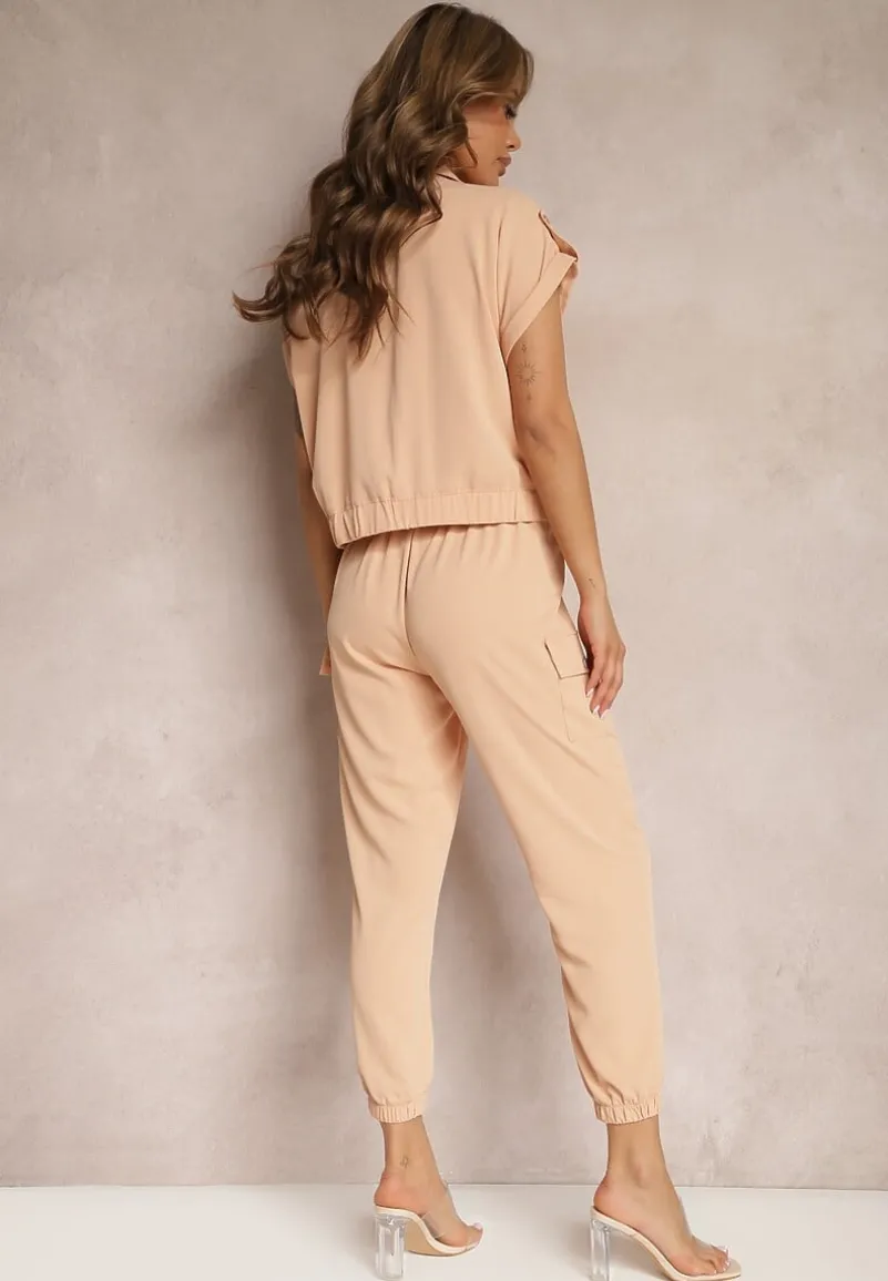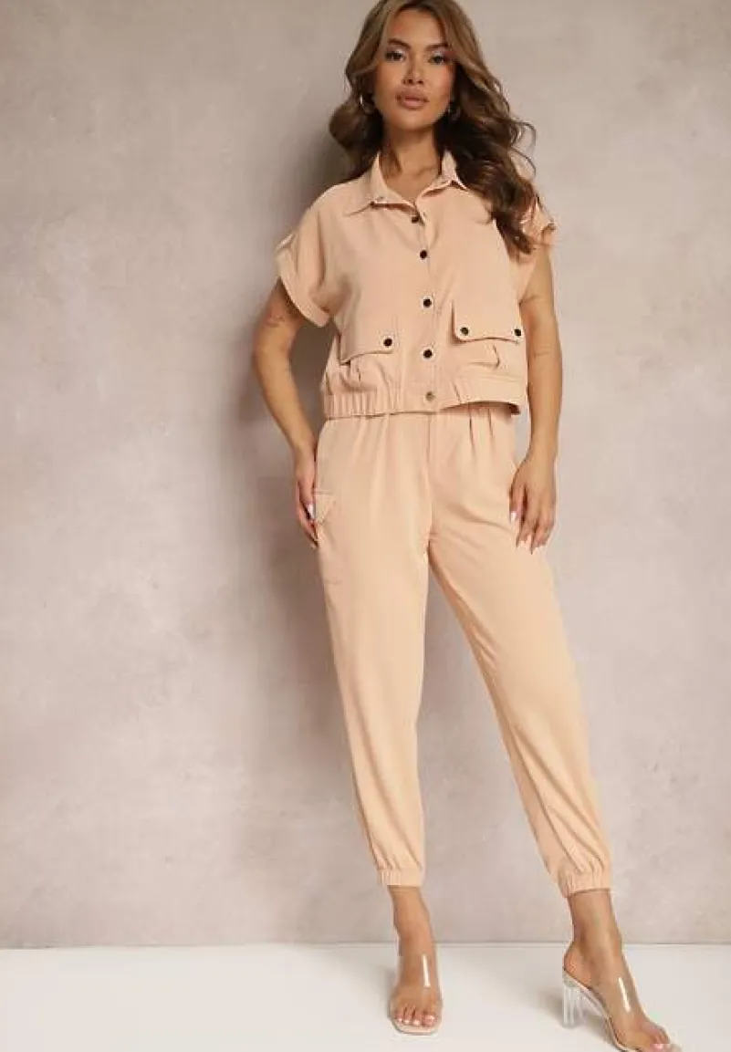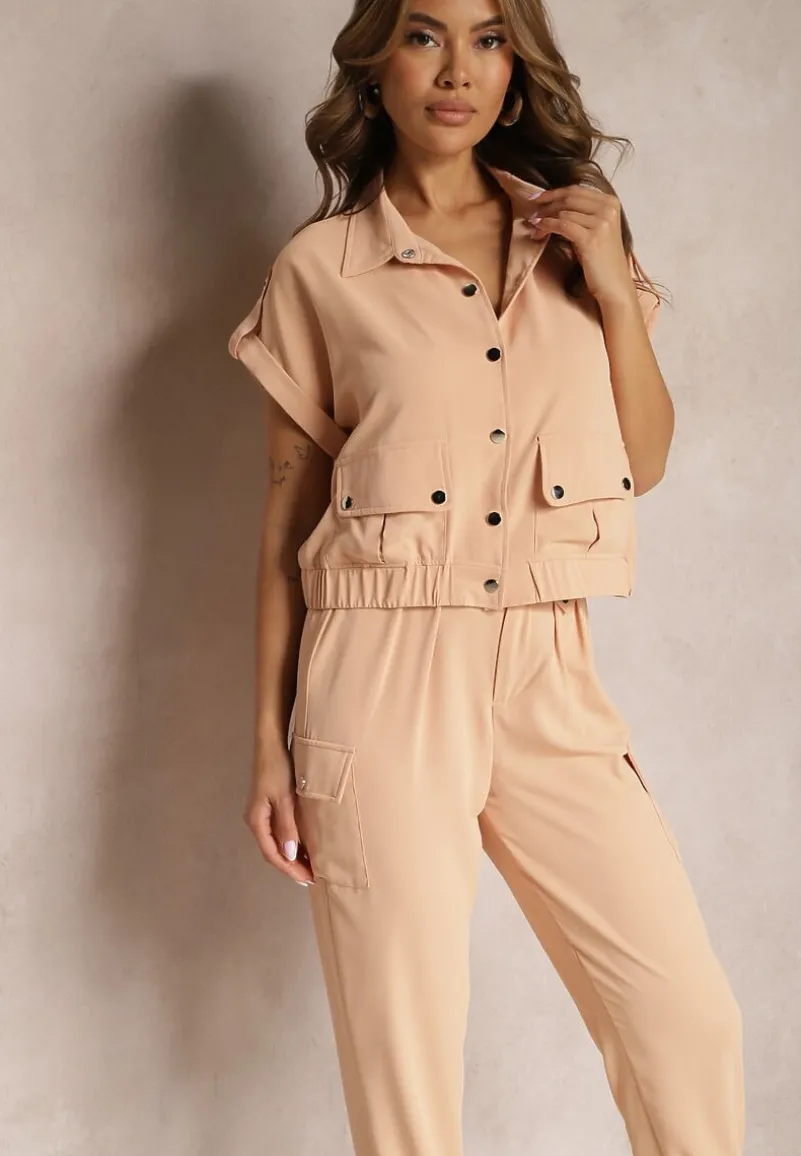 Dwuczęściowy Komplet Ezrala składający się z bluzki oraz spodni. Bluzka zapinana z przodu na napy, dół zakończony lekko marszczoną gumką. Dodatkowo zdobiona kieszeniami z klapą. Spodnie do zestawu z gumką w pasie i na dole nogawek. Zapinane na guzik i suwak. Po bokach naszyte kieszenie z klapami.