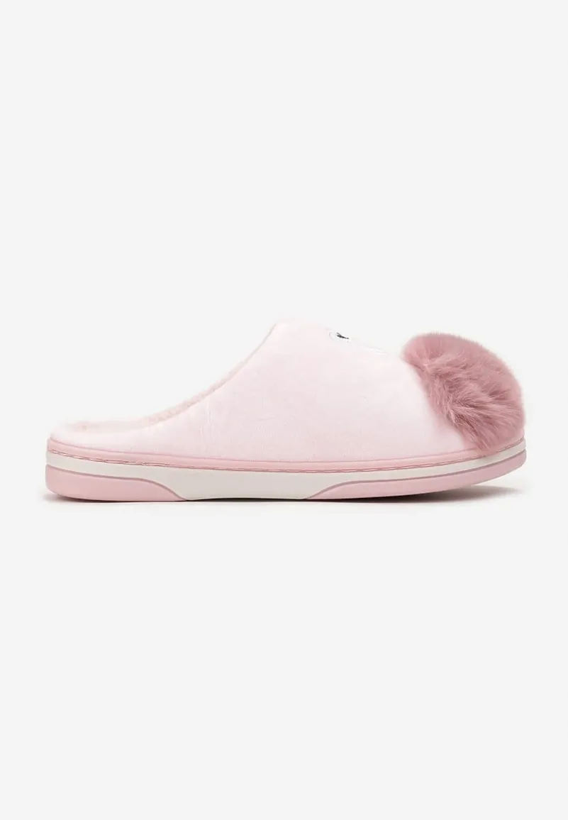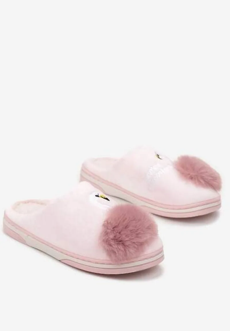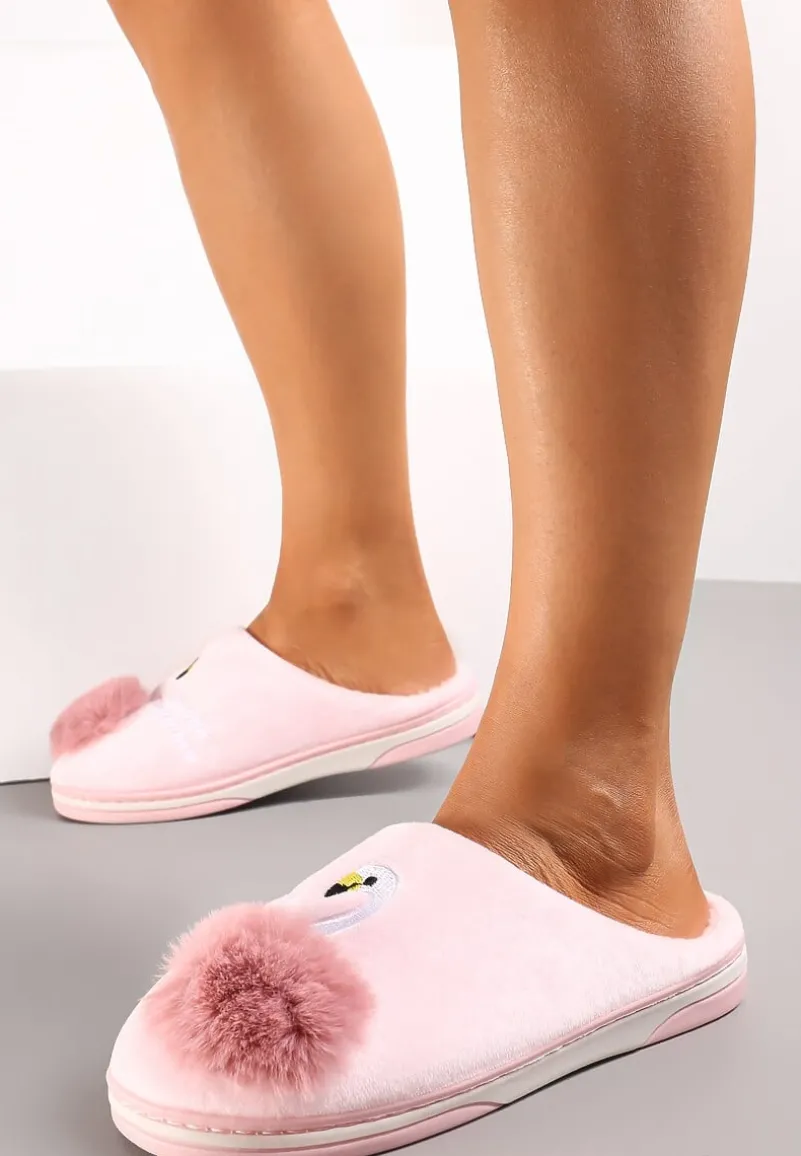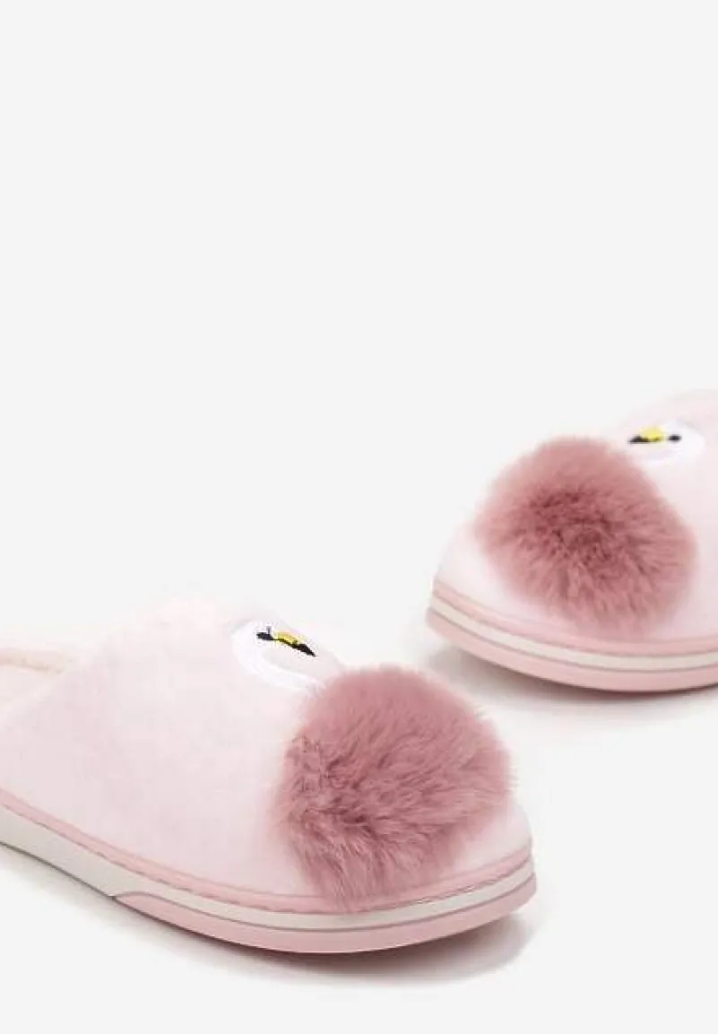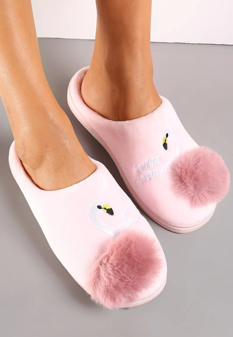 Urocze kapcie Xamela z pomponem i aplikacją-naszywką w kształcie łabędzia.