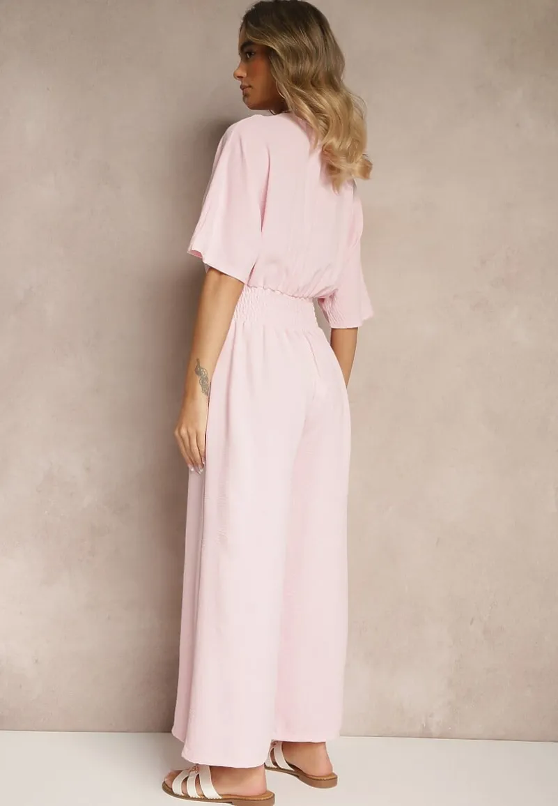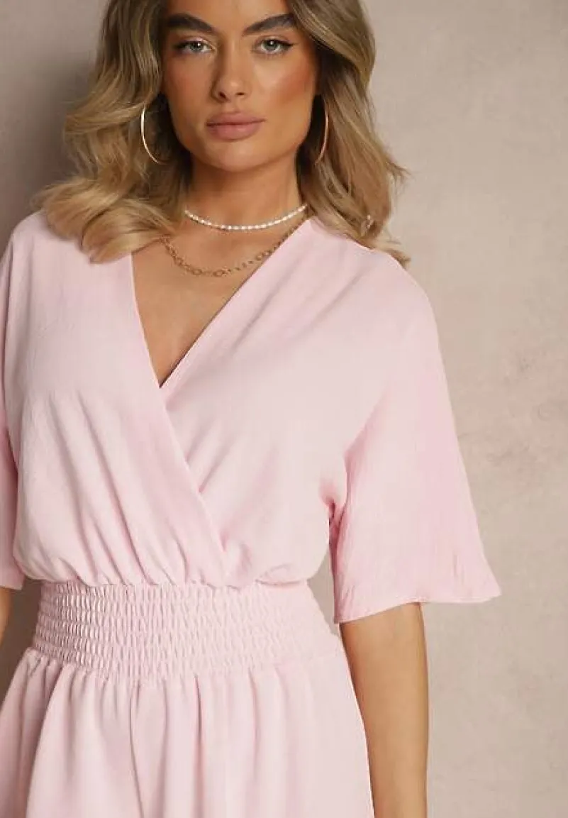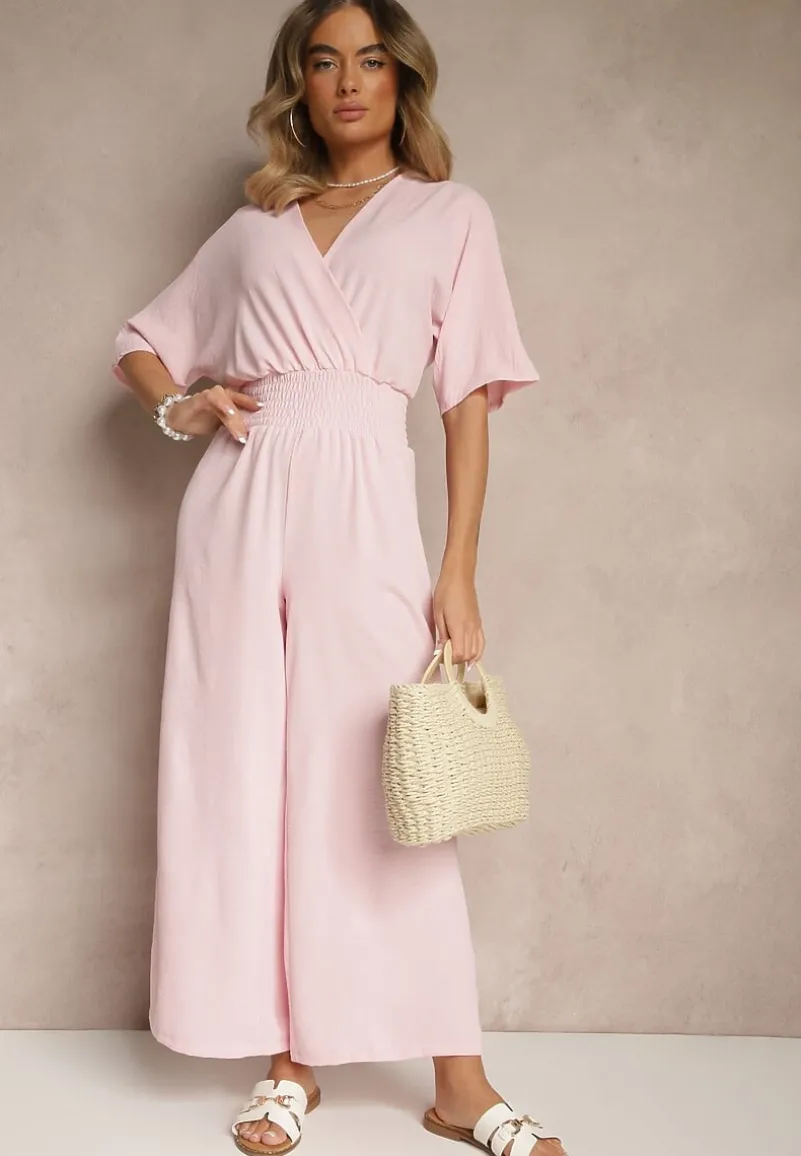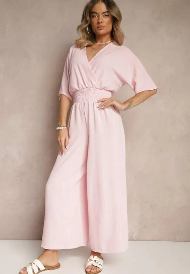 Jasnoróżowy Taliowany Kombinezon z Zakładkowym Dekoltem i Gumką w Pasie Vimalynna