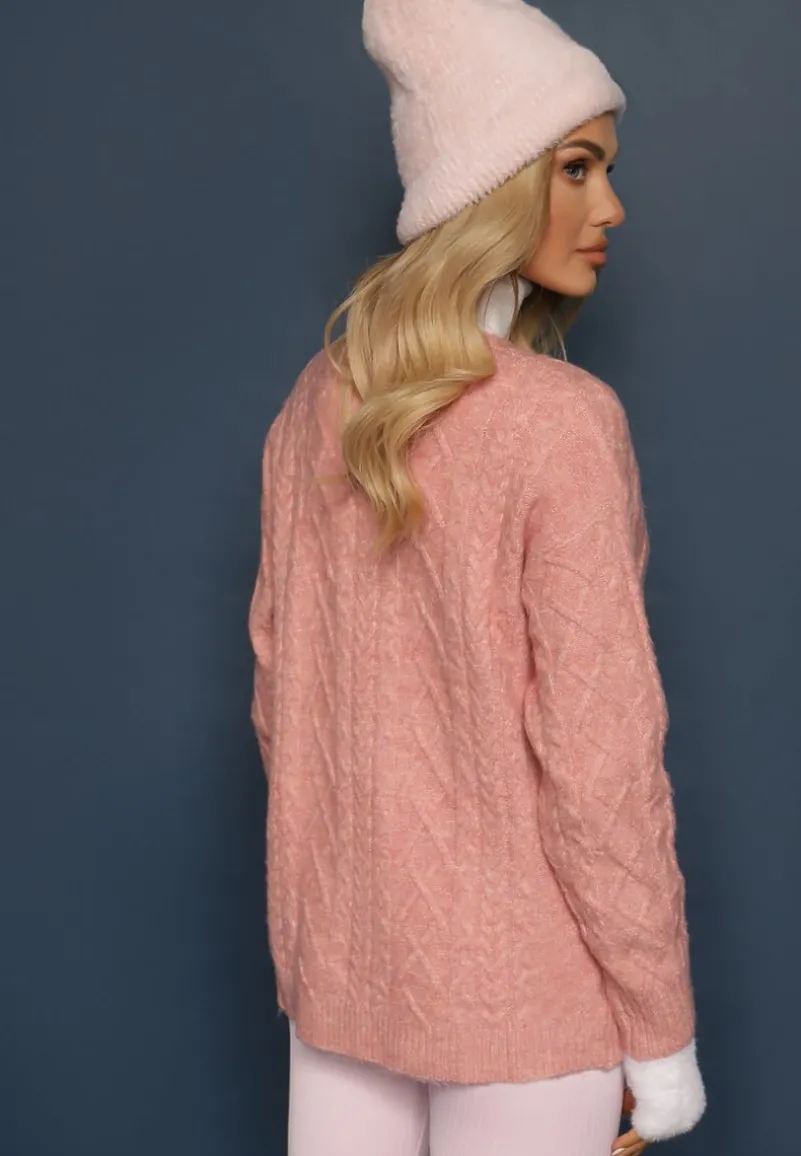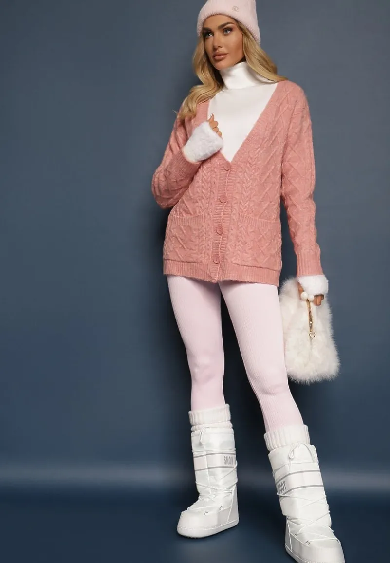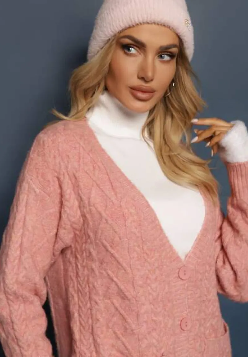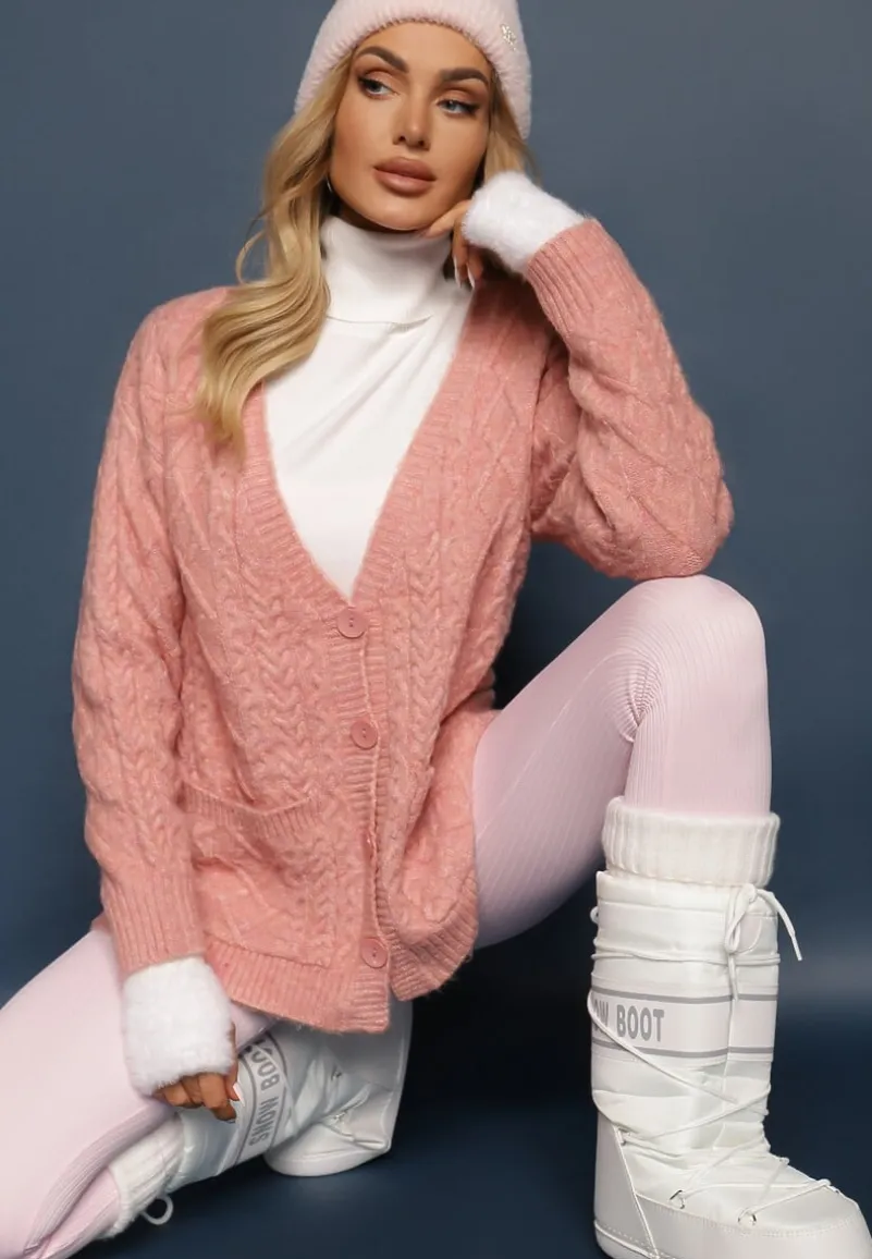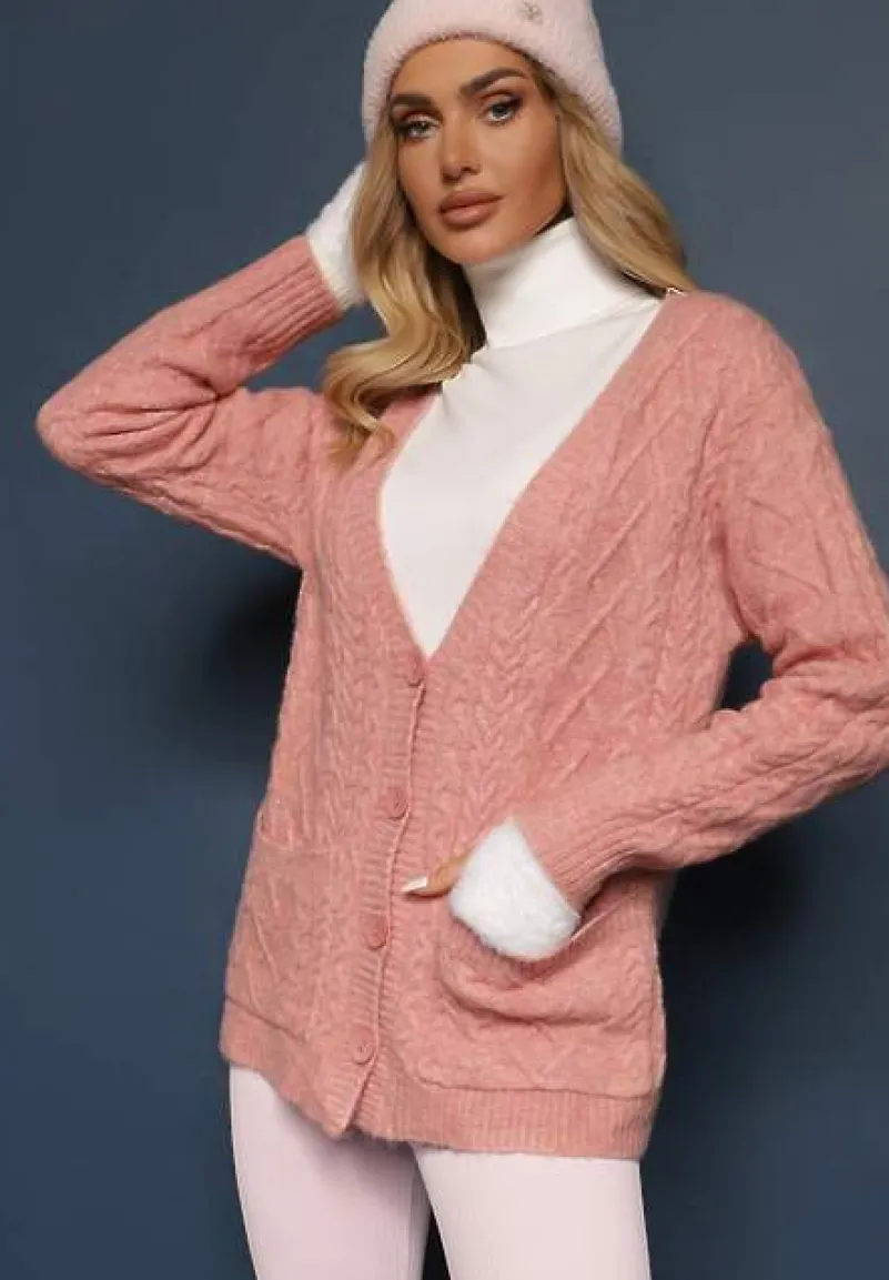 Kardigan Juessa wykonany z dzianiny w ozdobny, warkoczykowy splot. Zapinany z przodu na guziki. Posiada wsuwane kieszenie.