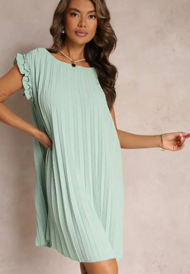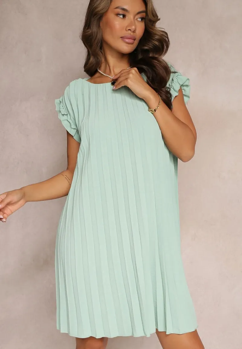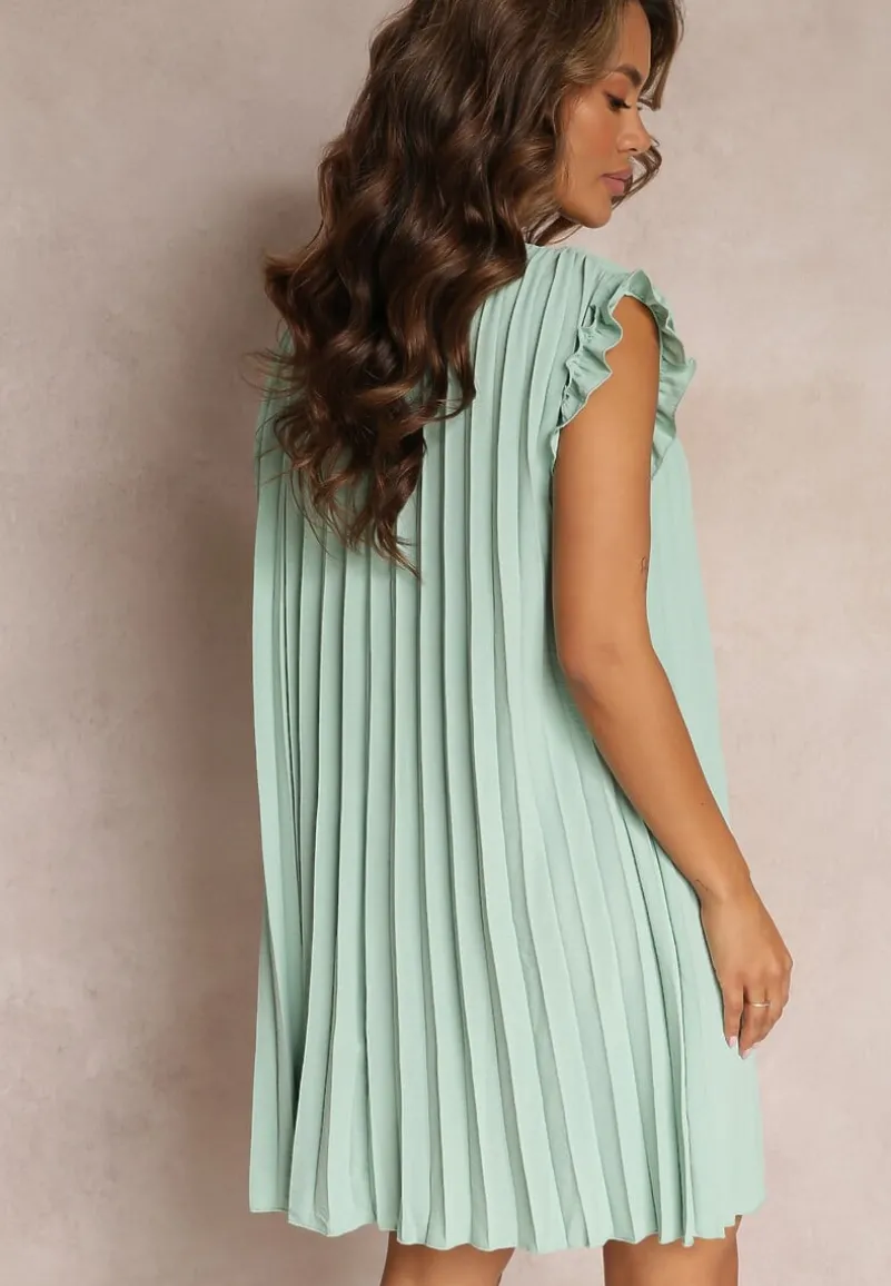 Pudełkowa sukienka Trinida z plisowanej tkaniny (50% wiskozy, 50% bawełny). Model o długości mini bez rękawów. Przy ramionach wszyte ozdobne falbanki. Nie posiada podszewki.
