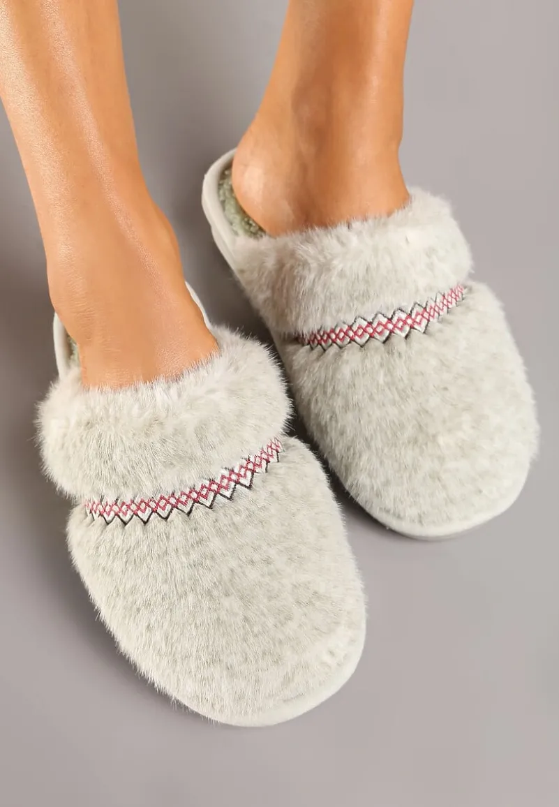 Futrzane Kapcie na Płaskiej Podeszwie Ozdobione Paskiem Linnelle to idealna propozycja na chłodne wieczory w domu. Płaska podeszwa zapewnia stabilność podczas codziennego użytkowania, a futrzane wykończenie dodaje przytulności. Elegancki pasek stanowi subtelne zdobienie, które podkreśli Twój styl, nawet podczas leniwych dni. Zestaw je ze stylowym dresem, aby stworzyć wygodny i modny look na popołudnie z książką, lub połącz z eleganckim, kaszmirowym swetrem na niezobowiązujące spotkanie w gronie przyjaciół.