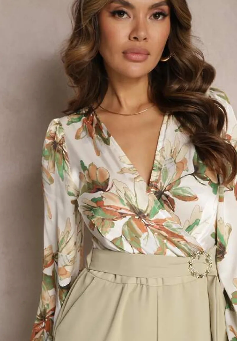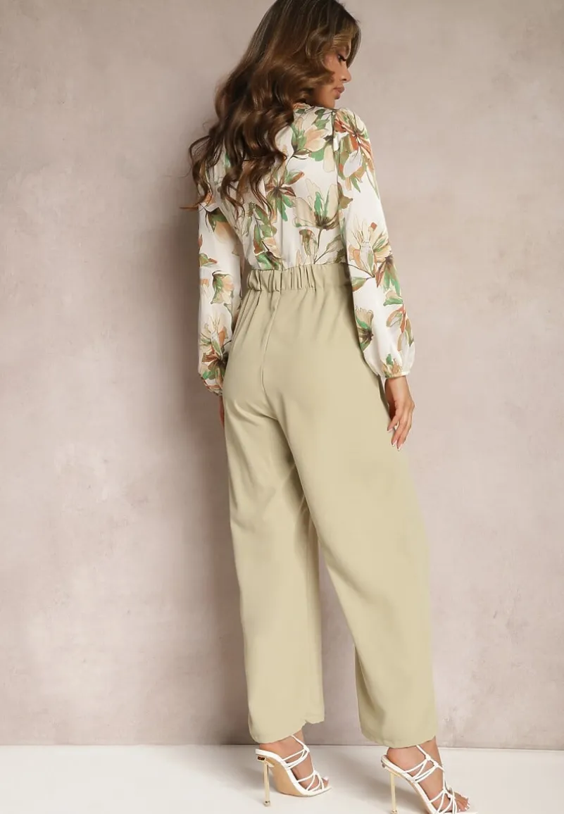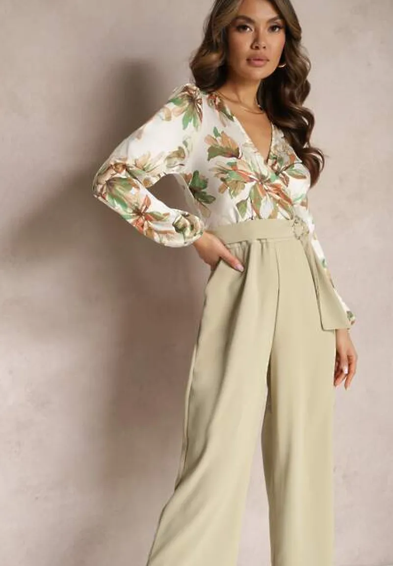 Jasnozielony Kwiatowy Kombinezon z Kopertowym Dekoltem z Paskiem i Szerokimi Nogawkami Vinia