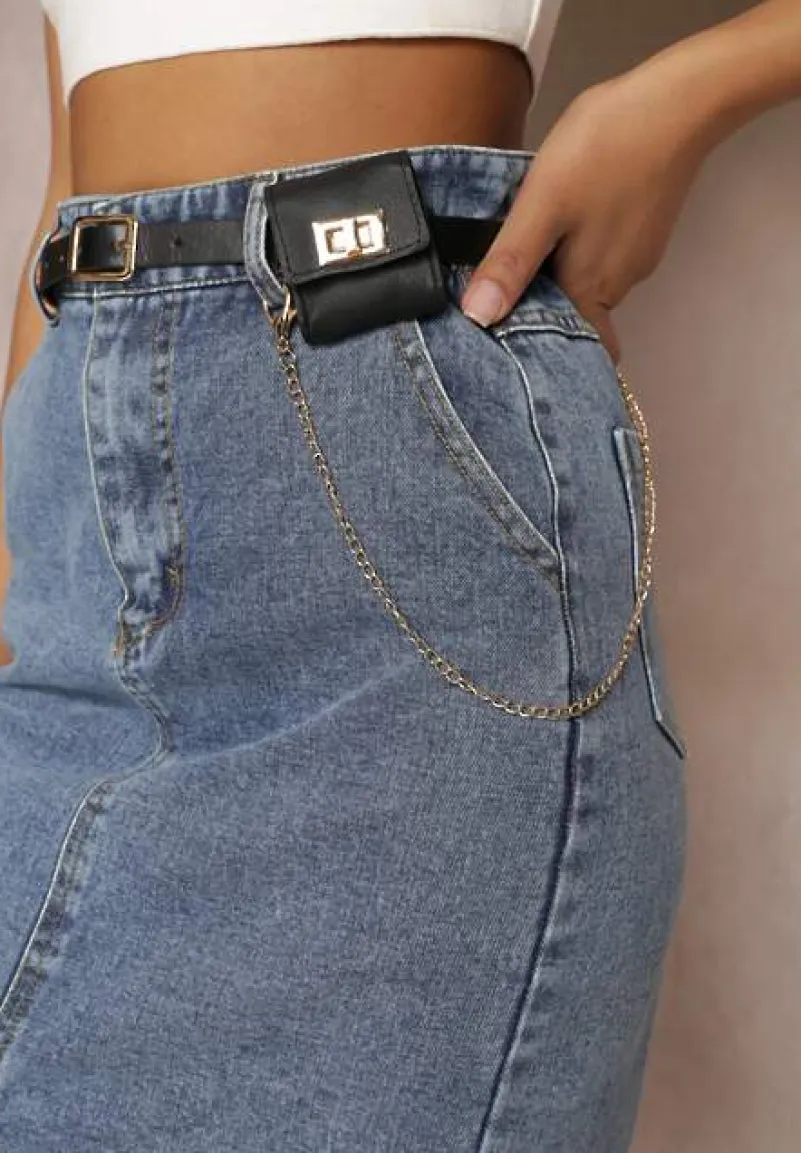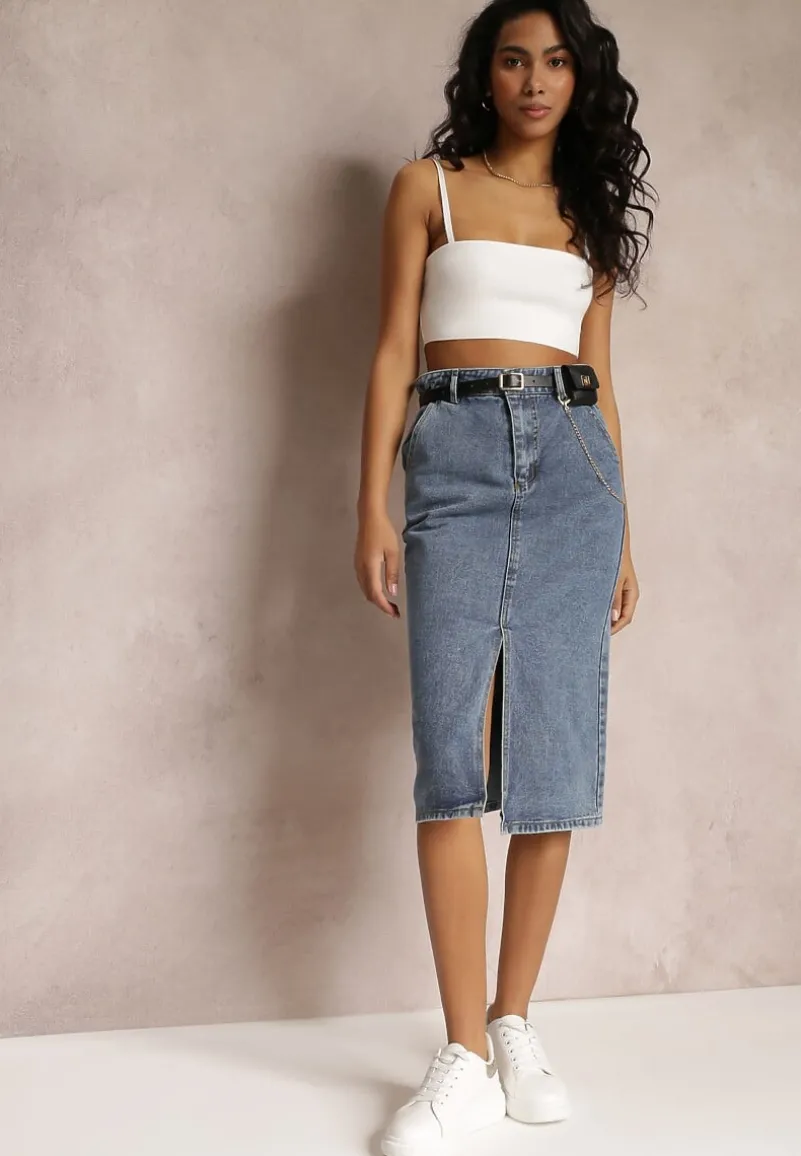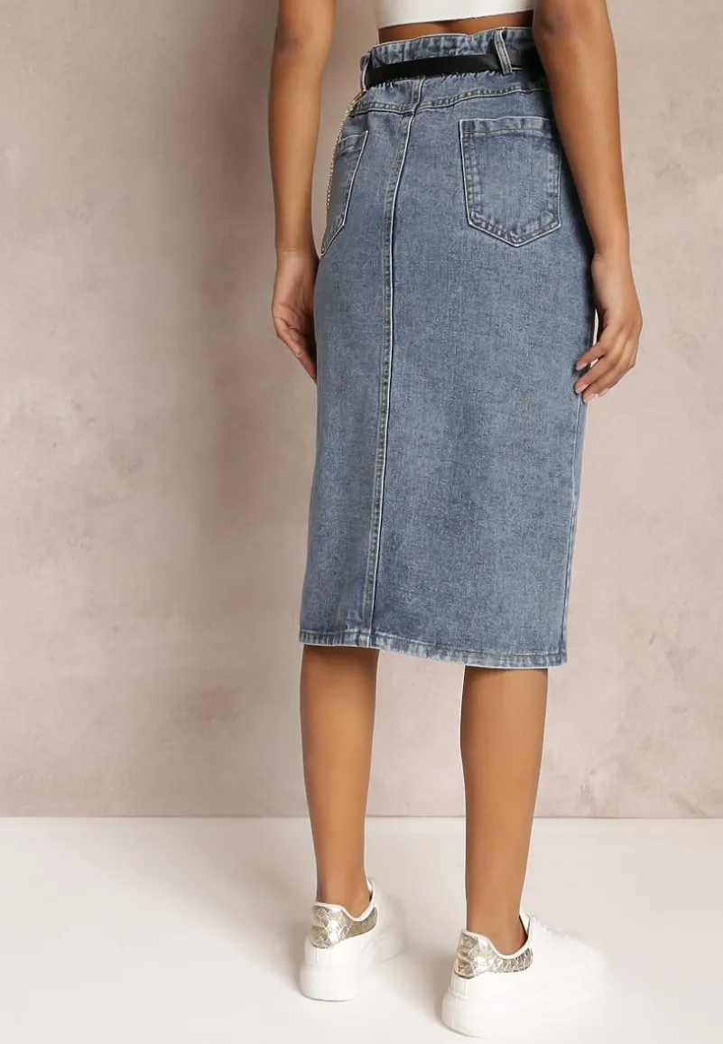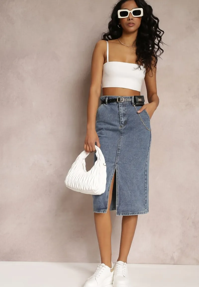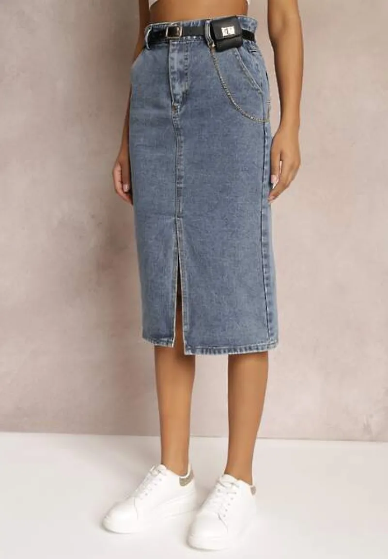 Spódnica Misitra to modna jeansowa midi o ołówkowym kroju z rozcięciem na dole z przodu. Posiada wsuwane kieszonki. Do spódnicy w komplecie pasek z saszetką i ozdobnym łańcuszkiem.
