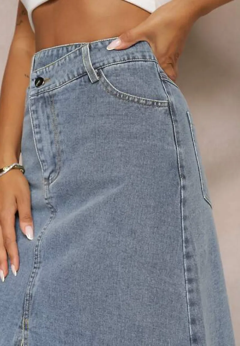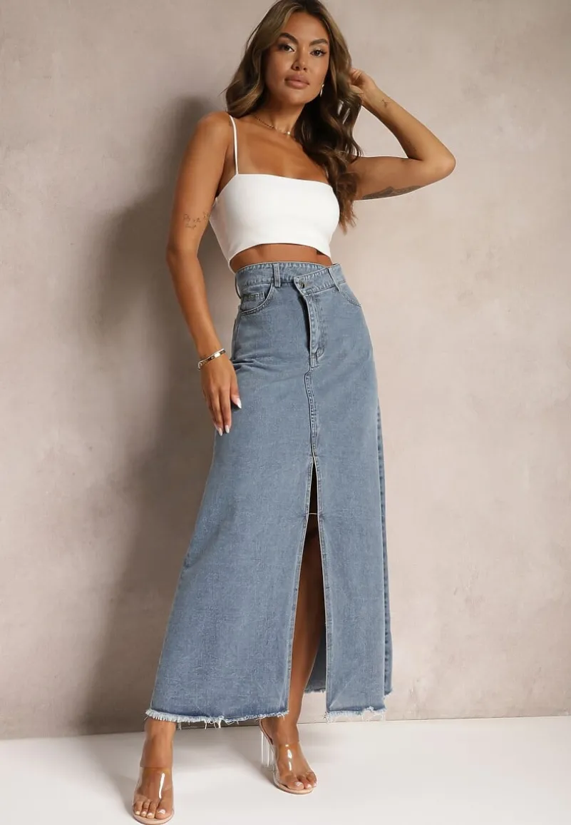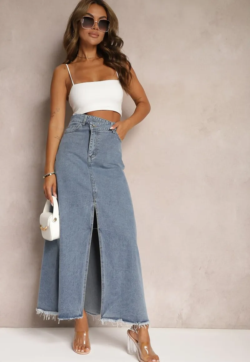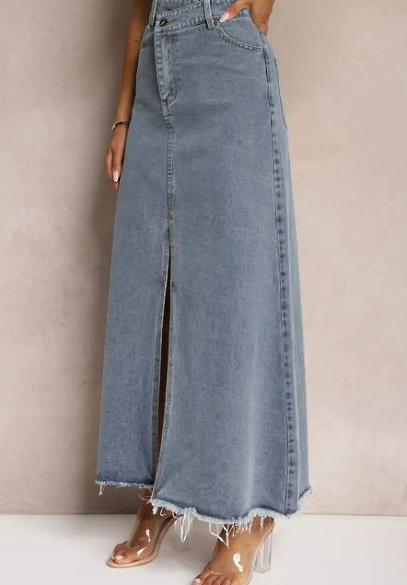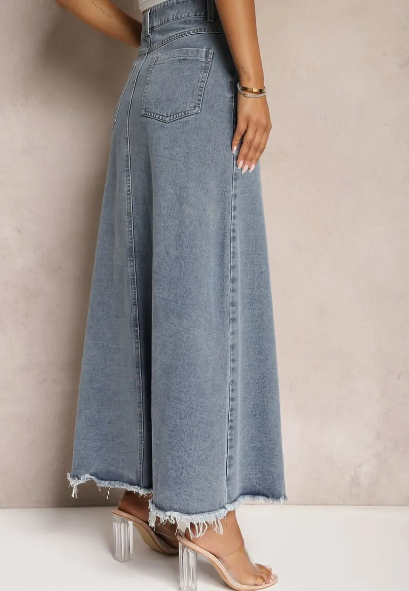 Jeansowa spódnica Feedi o trapezowym fasonie z rozcięciem z przodu. Model o długości maxi z wysokim stanem. Zapinana na zamek błyskawiczny i jeden guzik. Wsuwane kieszenie na wysokości bioder i pośladków. Dół postrzępiony. Idealna na każdą porę roku.
