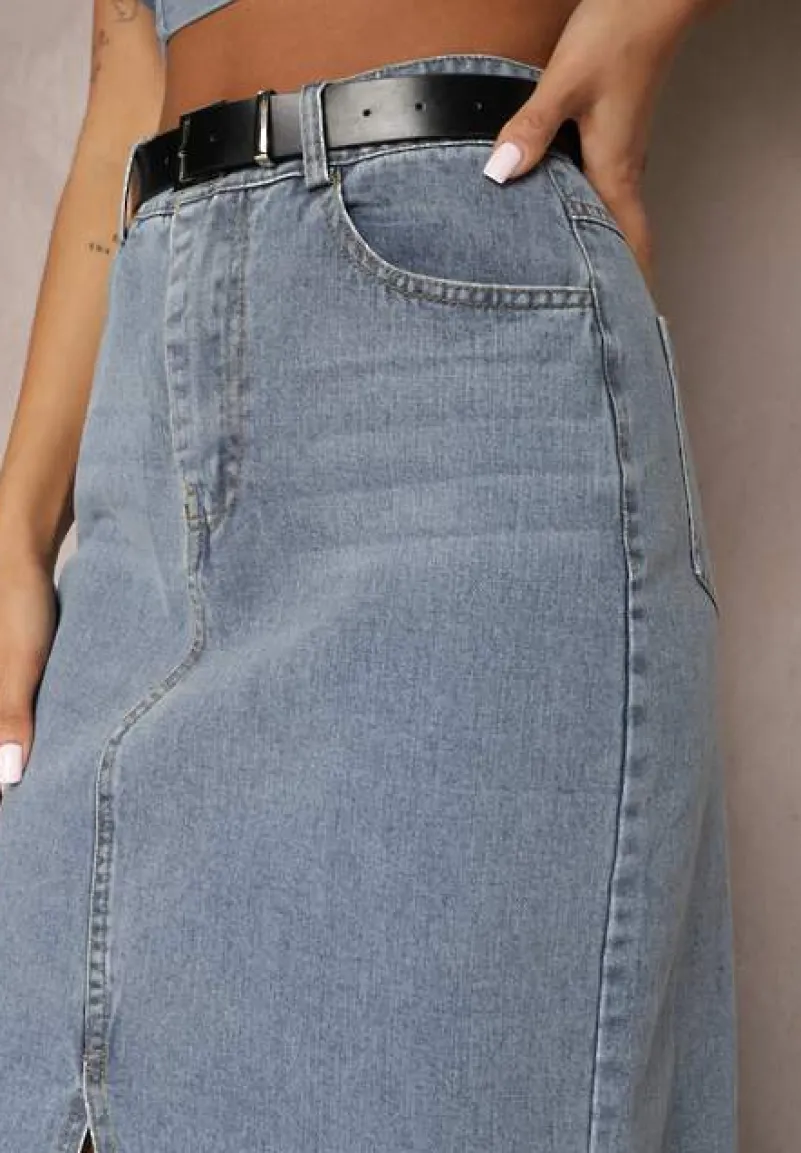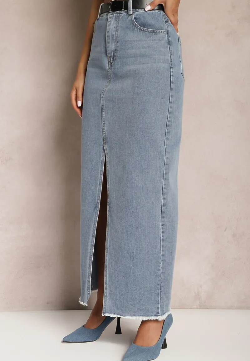 Jeansowa Spódnica Mullese o supermodnej długości maxi. Talia high waist, zapinana na guzik i suwak. Zestawiona z klasycznym paskiem z klamerką. Na dole efektowne rozcięcie. Wsuwane kieszenie z przodu i tyłu.