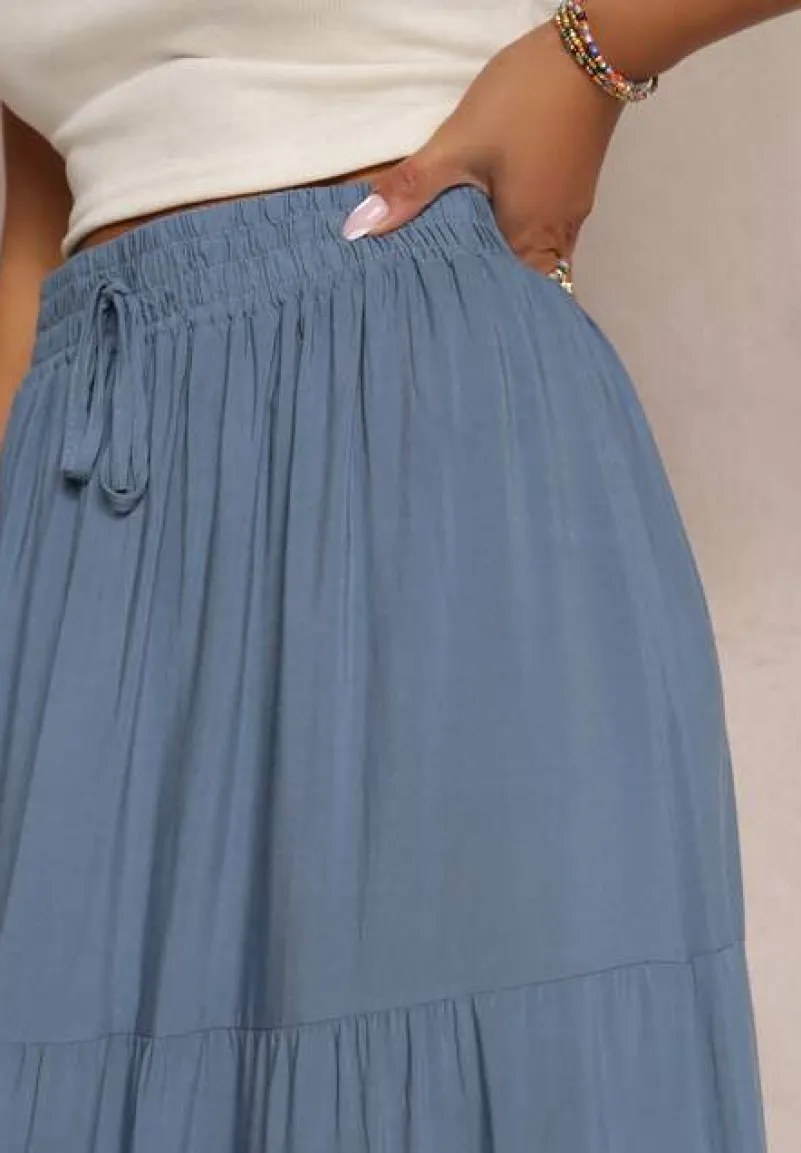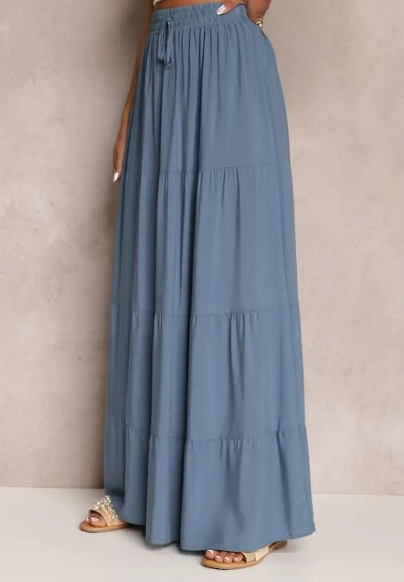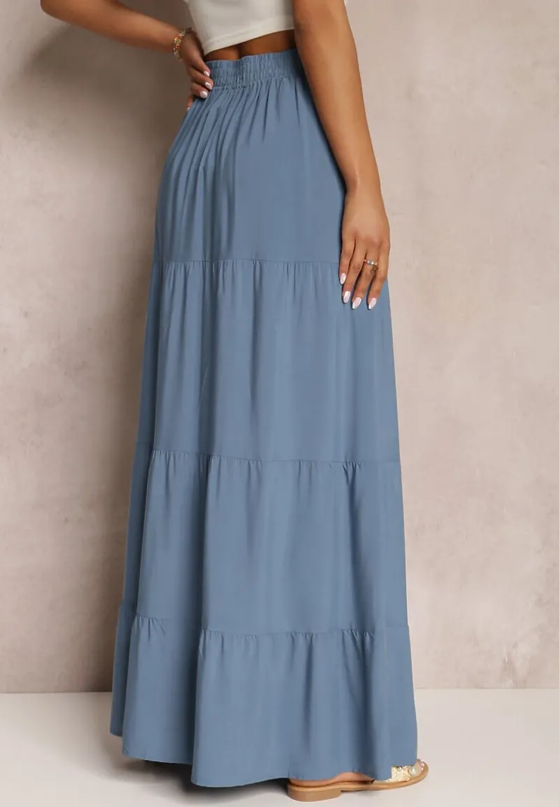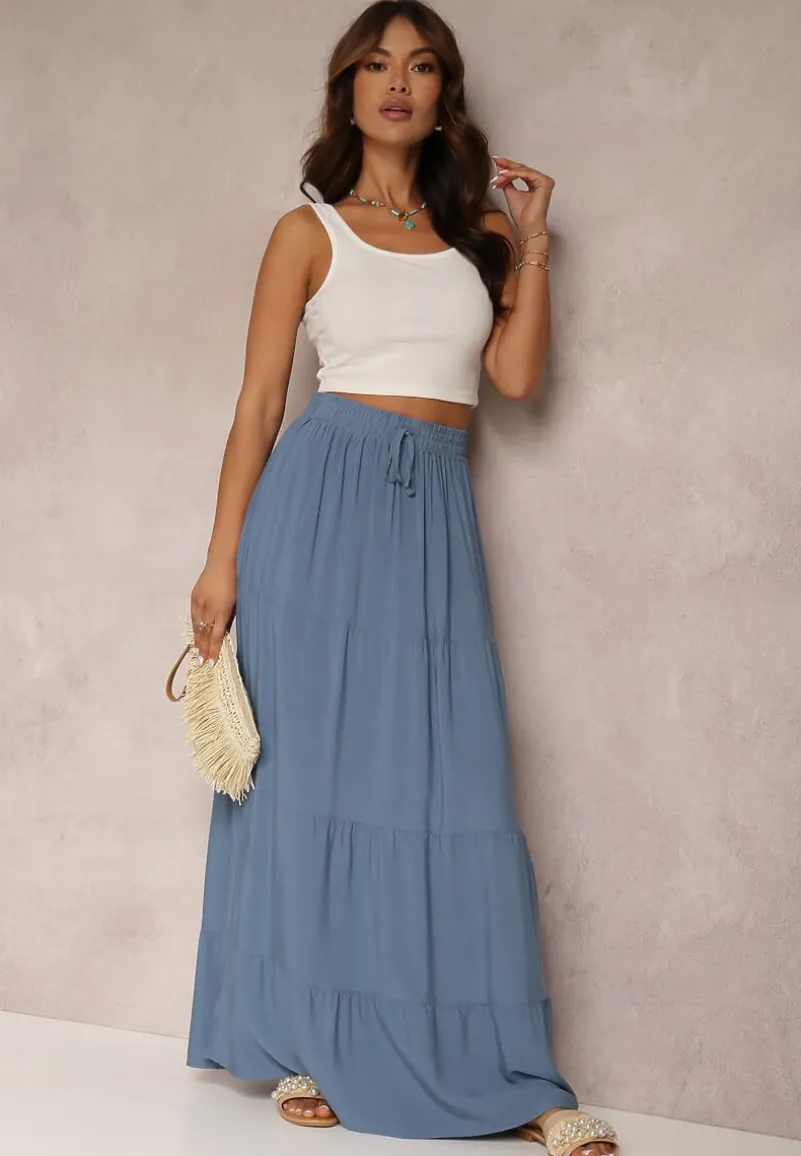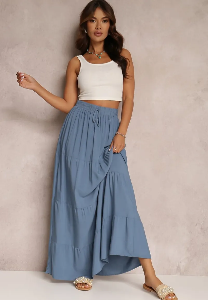 Spódnica Kainne wciągana, z regularnym stanem i elastyczną gumką w pasie. Długość maxi, dekorowana poziomymi przeszyciami. W pasie znajduje się również troczek do ściągnięcia, dzięki któremu możesz dopasować spódnicę do swojego ciała. Bez podszewki. UWAGA: rozmiar L/XL odpowiada rozmiarowi M/L. Spódnica świetna na co dzień, jako uzupełnienie casualowego outfitu.