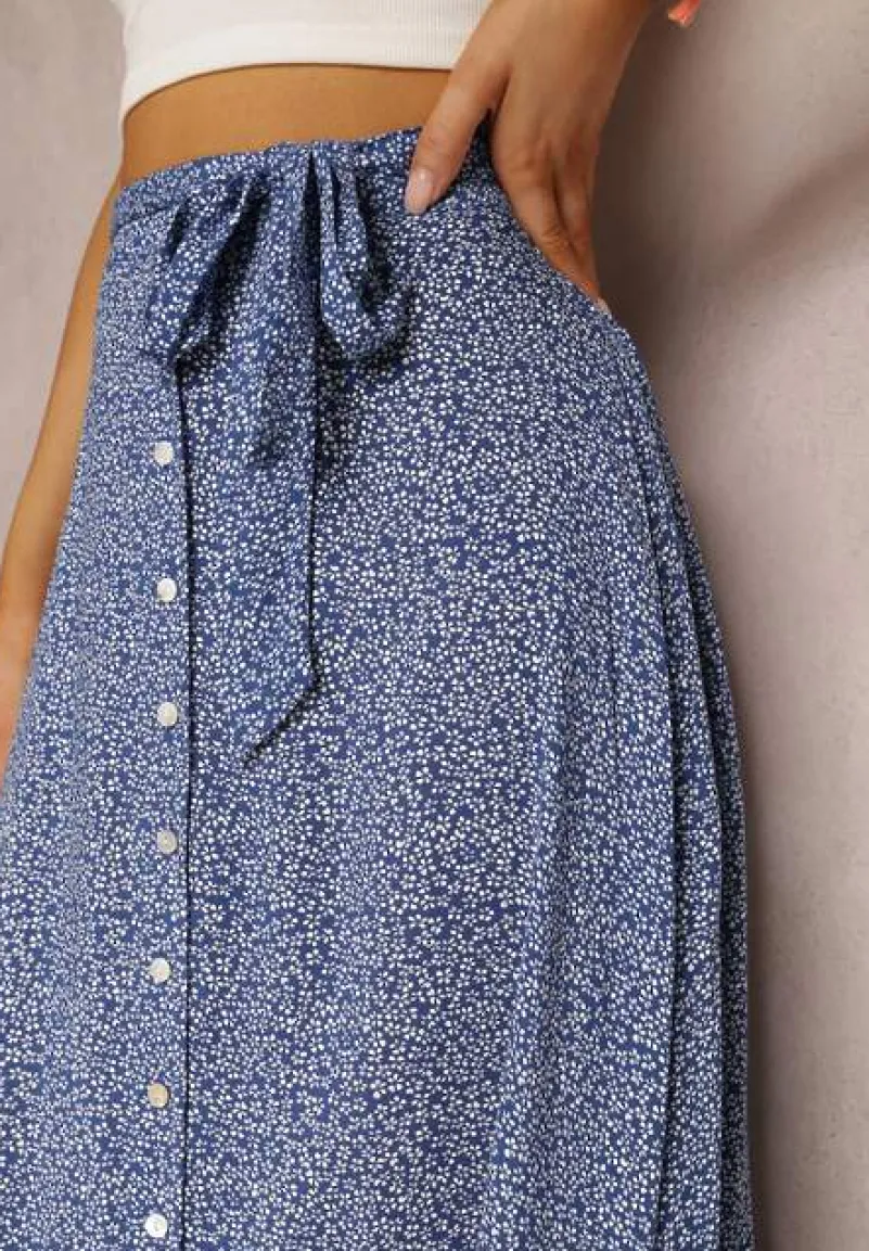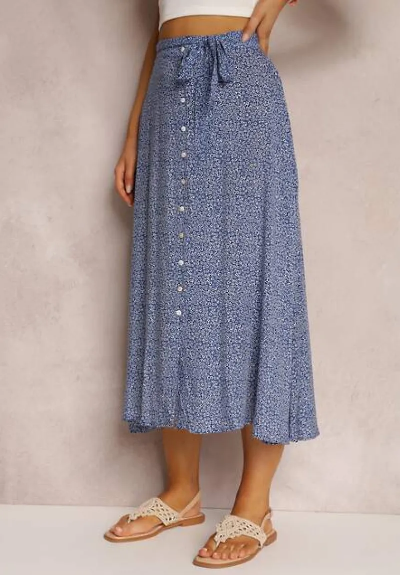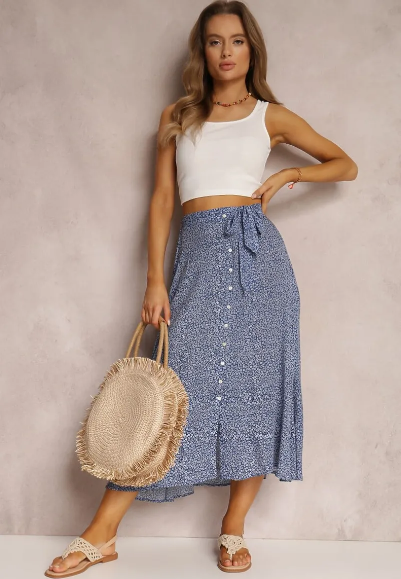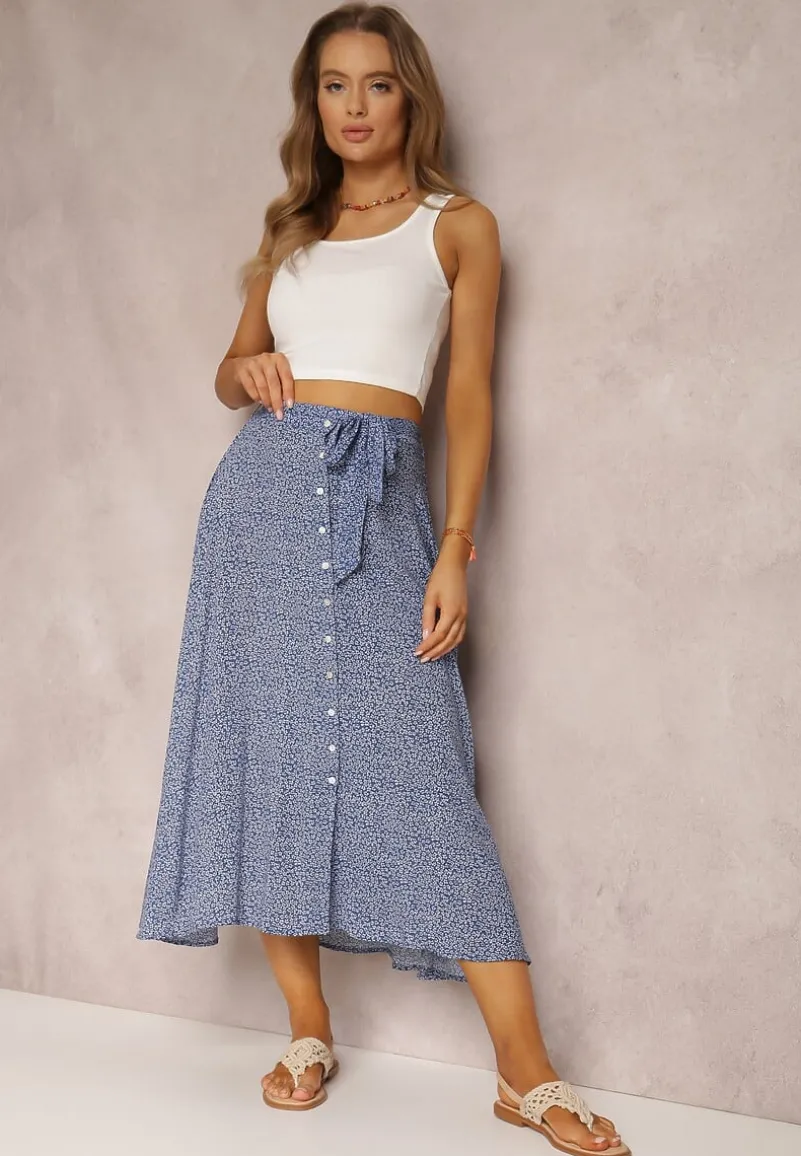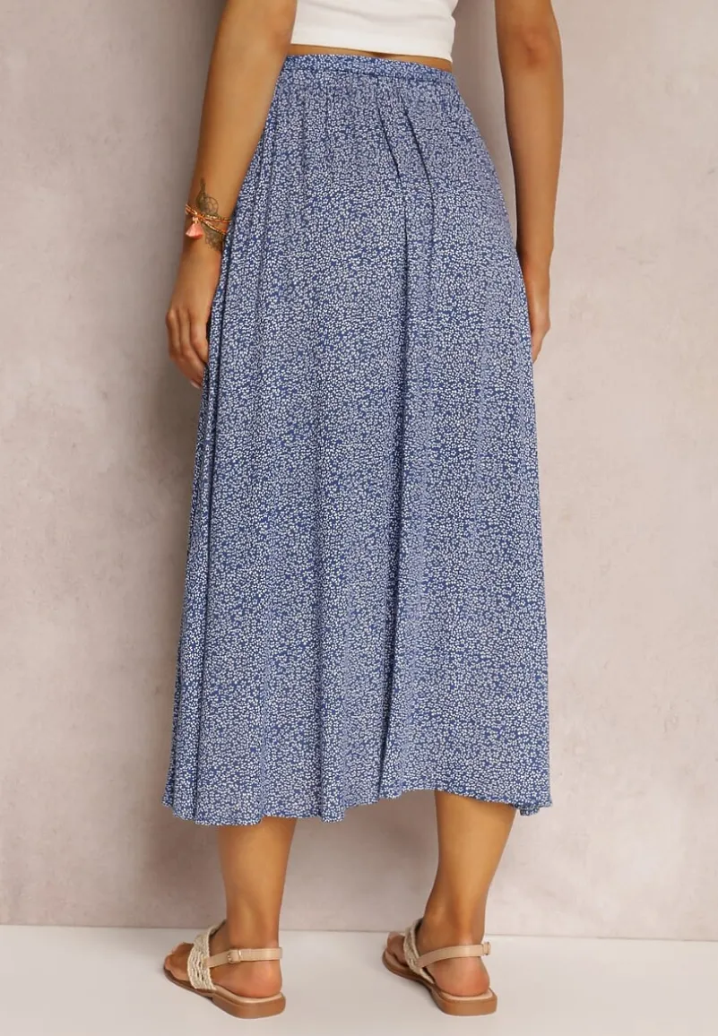 Spódnica Salaphanise o długości midi i rozkloszowanym kroju, pokryta wzorem w drobne kwiatki. Zapinana z przodu na niewielkie guziki. Z paskiem do zawiązania w talii oraz gumką w pasie. Bez podszewki. Możesz nosić ją do różnych butów – od tenisówek, przez baleriny, aż po czółenka!