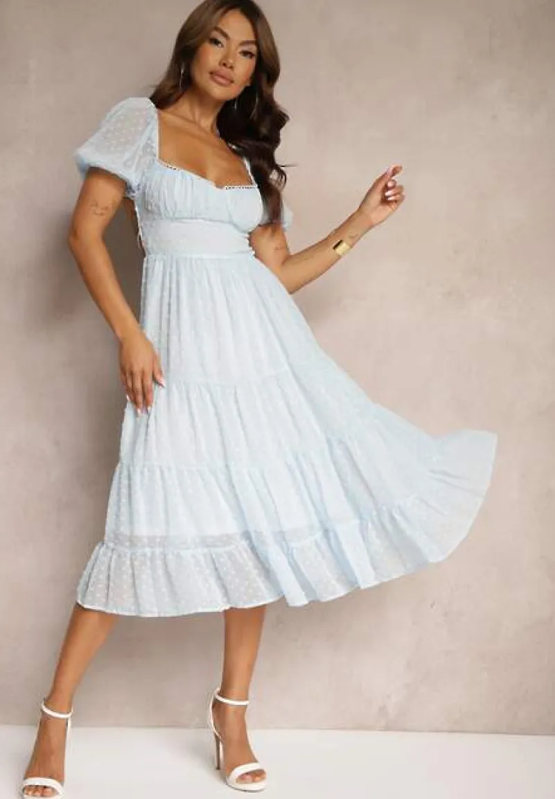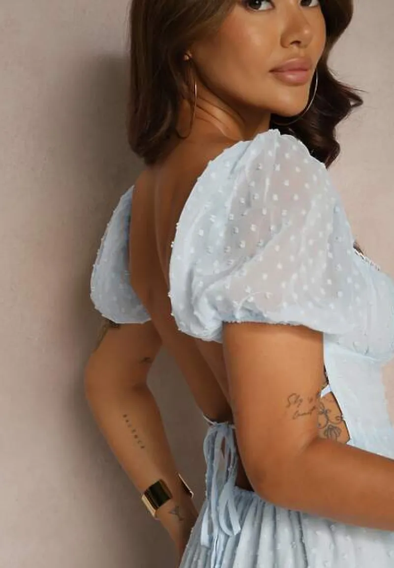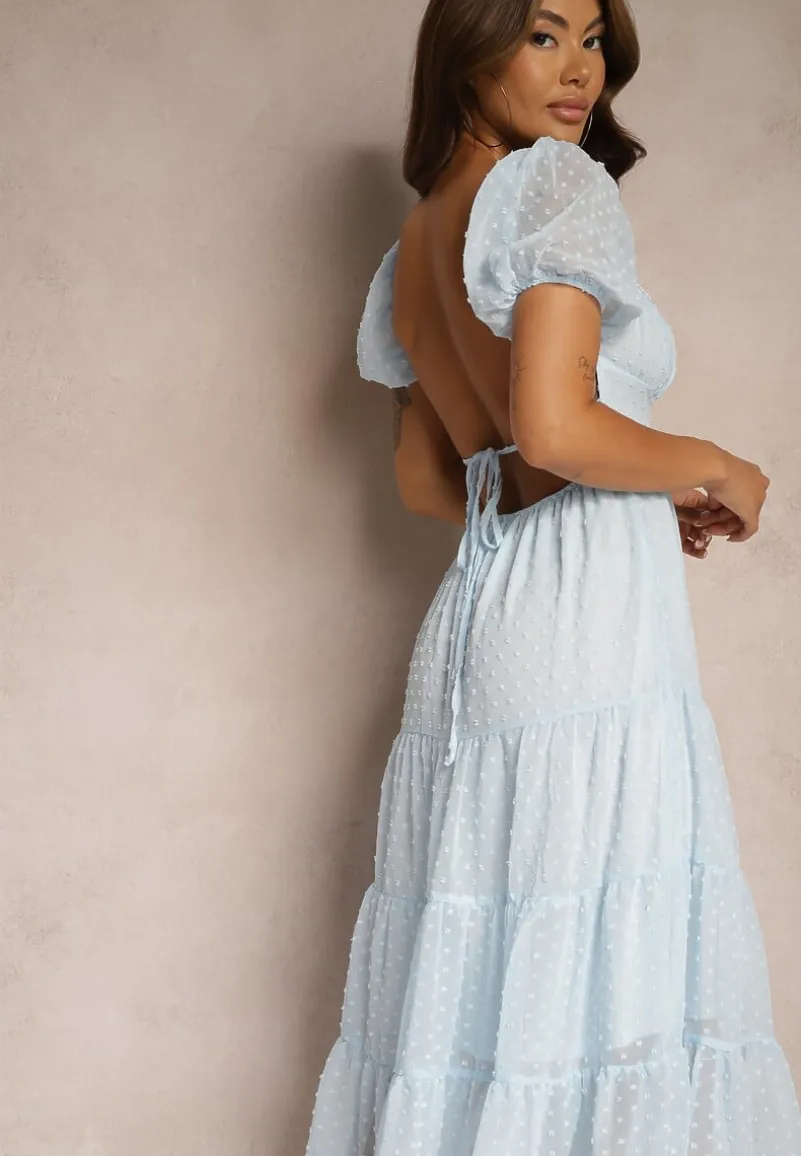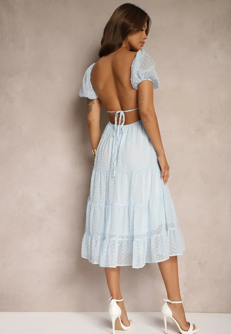 Sukienka Nephia rozkloszowana, z głębokim dekoltem w serce. Wiązana z tyłu w dwóch miejscach na cienkie sznureczki w tym samym kolorze. Długość midi, wykończona na dole falbanami. Rękawy krótkie, bufiaste i zakończone gumeczką. Plecy odkryte. Wykonana z tkaniny plumeti, z elastyczną podszewką pod spodem. Ta koktajlowa sukienka wspaniale zaprezentuje się w towarzystwie eleganckiego kuferka i butów na obcasie.
