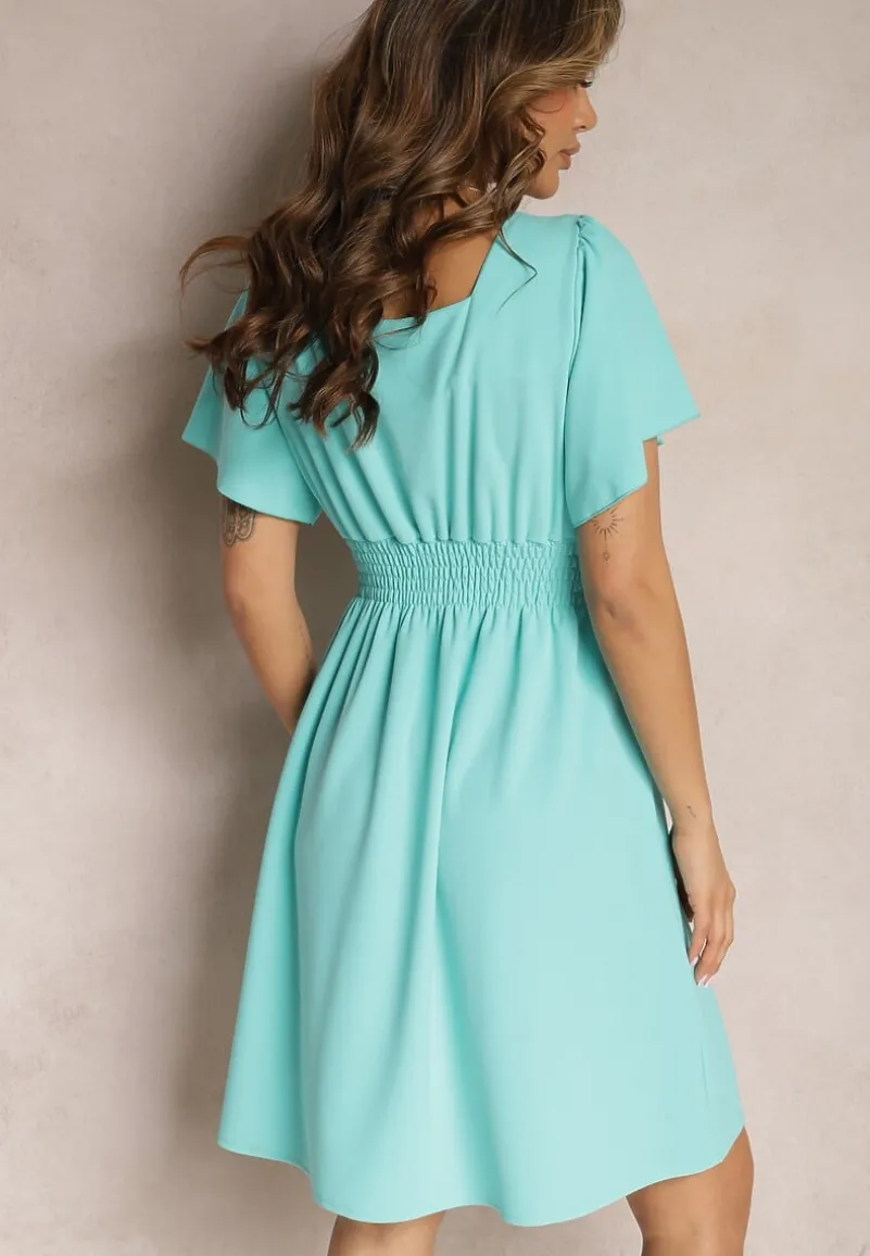 Sukienka Celarsa z krótkim, luźnym rękawem i gumką w pasie. Z przodu ozdobiona przeszyciami. Doskonale nada się na koktajlowe przyjęcia!