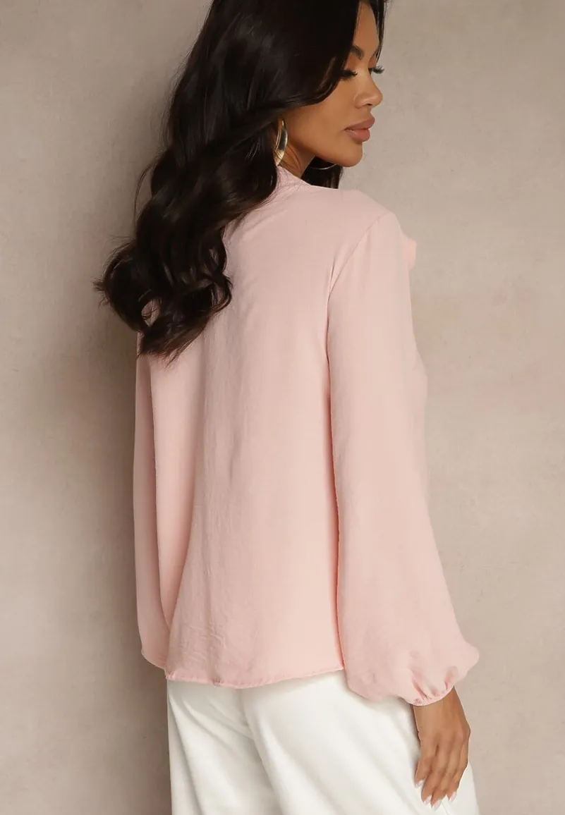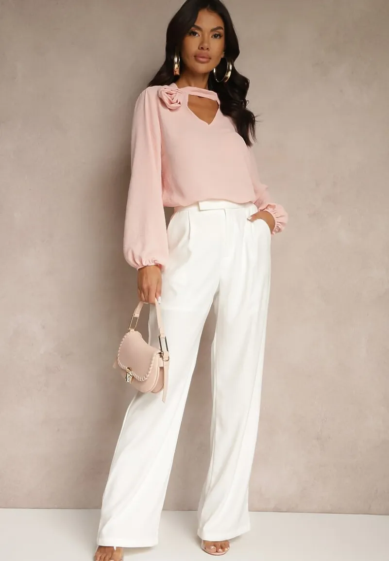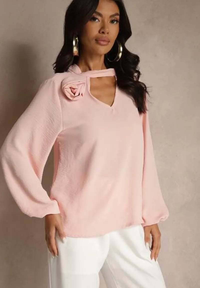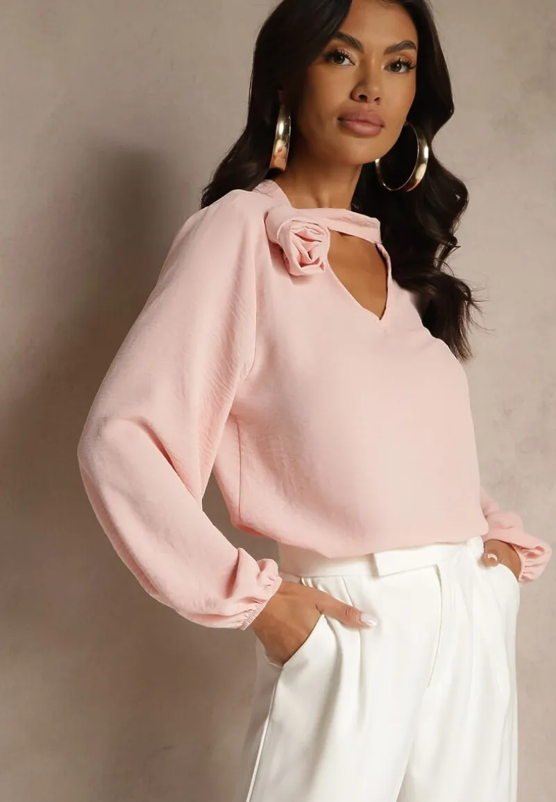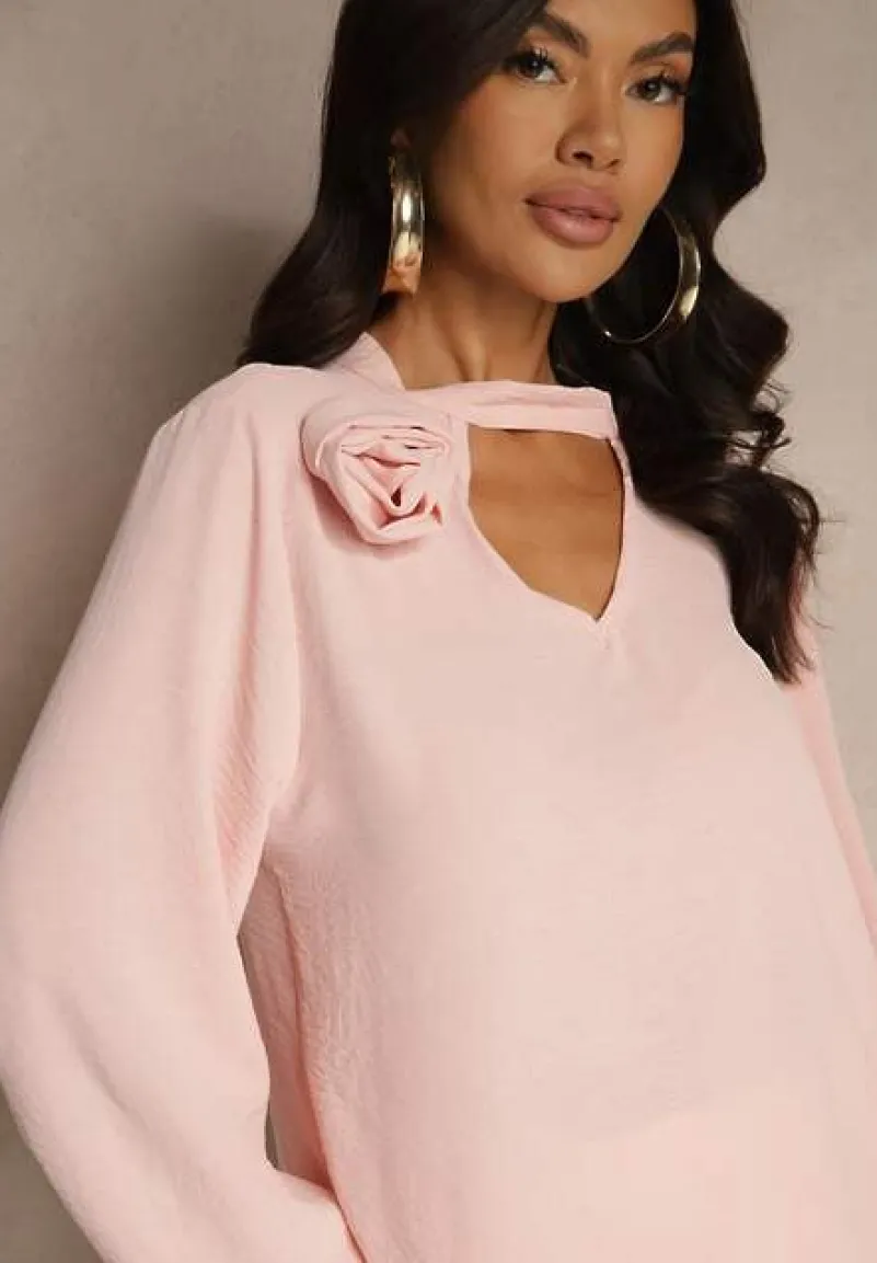 Bluzka Tolna z ozdobnym kwiatem przy ramieniu. Wyróżnia ją ozdobne wycięcie pod dekoltem. Na rękawach ściągacze. Bluzka Tolna zapinana jest na guziczek na wysokości karku.