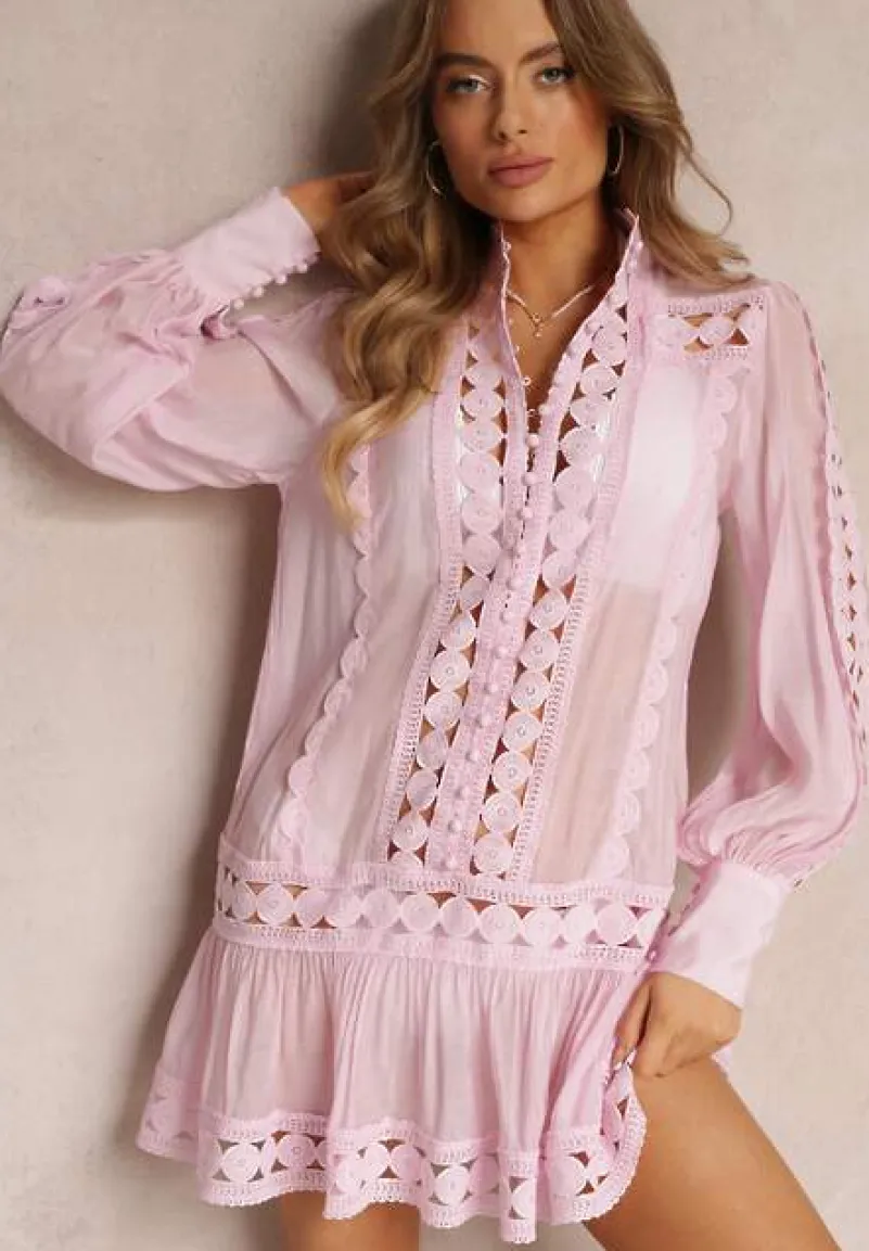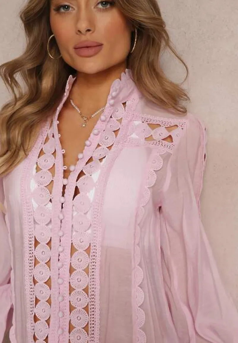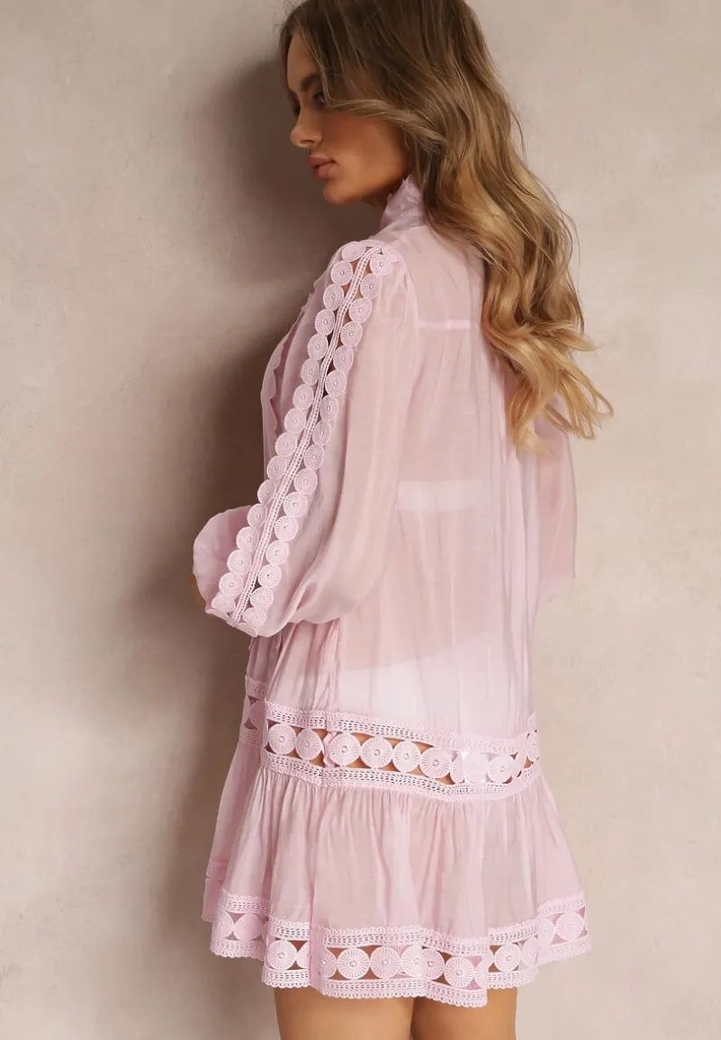 Tunika Nawal o pudełkowym fasonie, zdobiona na dole delikatną falbanką. Wokół szyi niewielka stójka. Z przodu zapinana na rząd guzików do linii talii. Wykonana z przezroczystej tkaniny wraz z koronkowymi wstawkami, które dodają akcentu boho. Bufiaste rękawy zakończone mankietami. Bez podszewki.