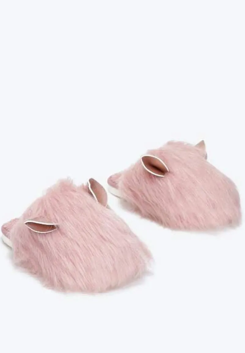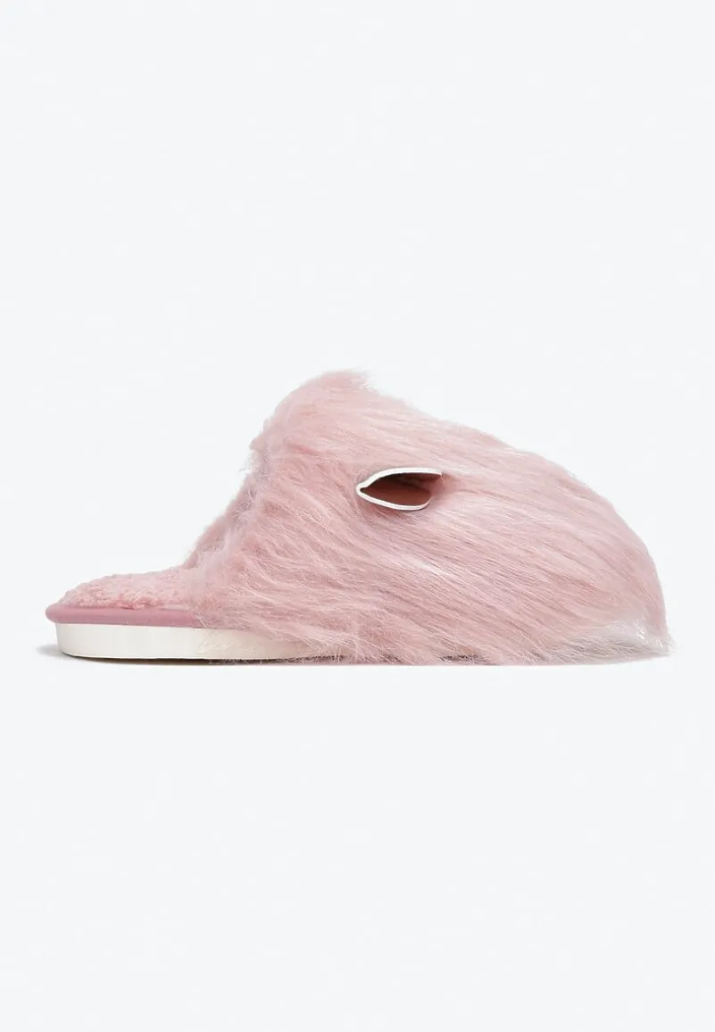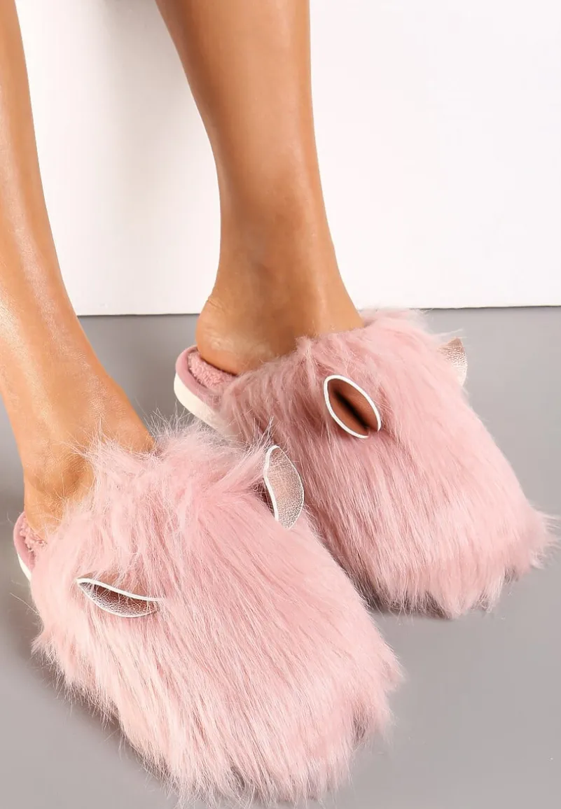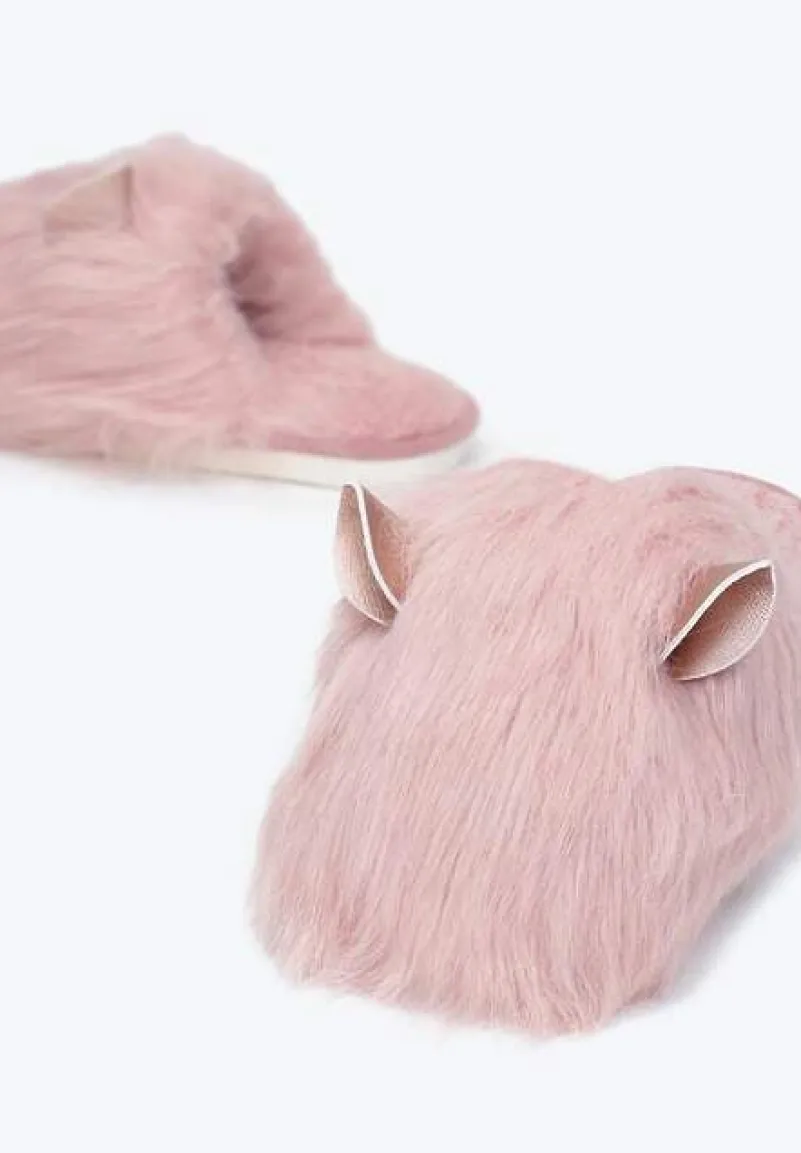 Futrzane kapcoe Ayuvei z aplikacją w kształcie uszek. Wykonane ze sztucznego futerka o długim włosiu. Miękkie kapcie Ayuvei osadzone na płaskiej podeszwie.