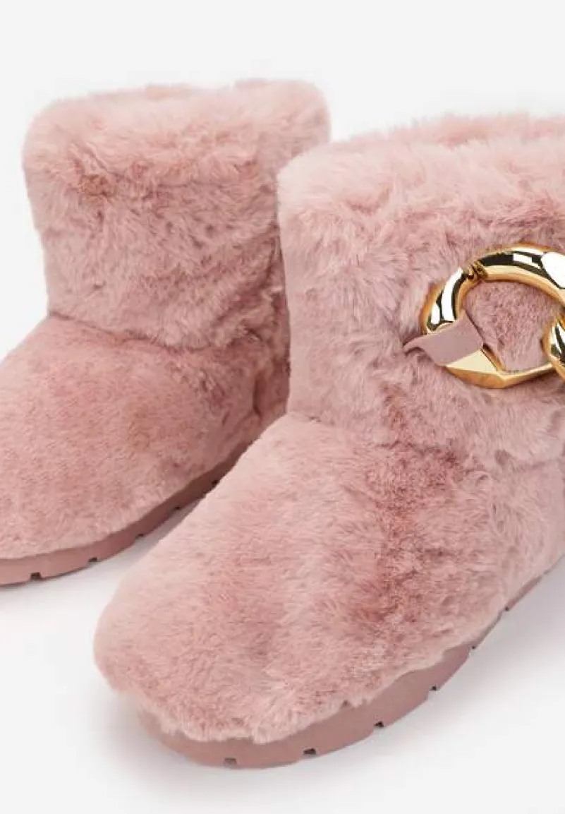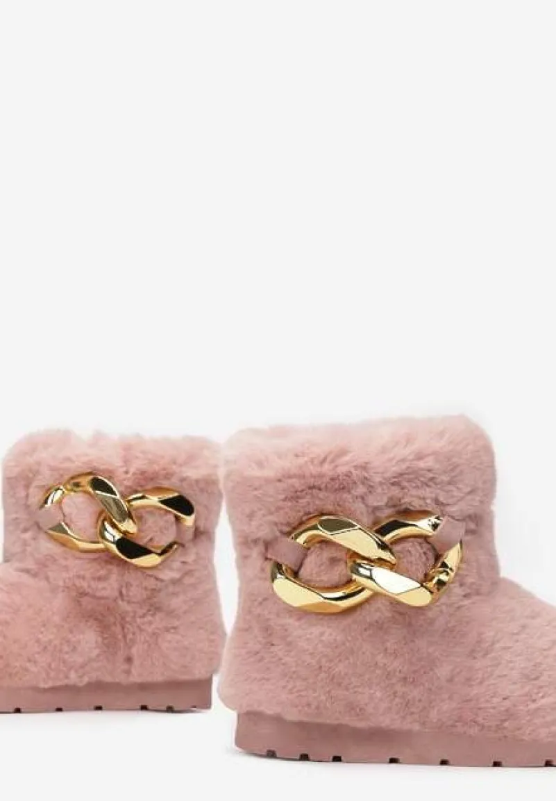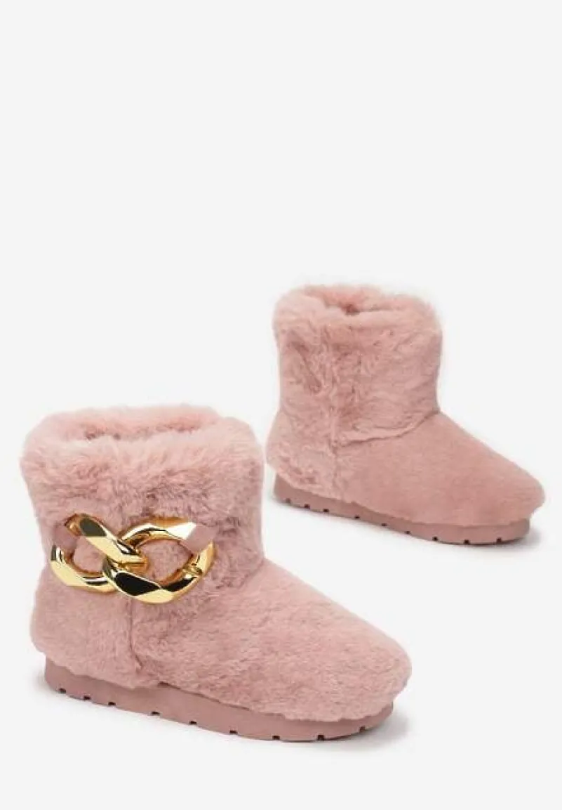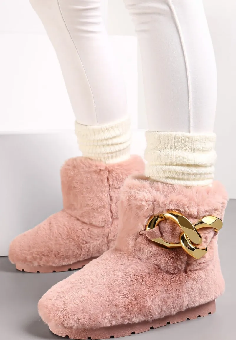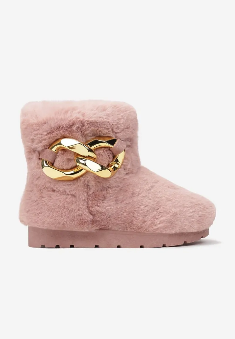 Śniegowce Dephare futrzane, ze wsuwaną cholewką sięgającą za kostkę. Osadzone na grubej podeszwie ze stabilizującym protektorem. Wykonane z miłego w dotyku, miękkiego materiału imitującego futerko. Udekorowane w tylnej części łańcuchem w złotym kolorze. Mocno ocieplane od środka imitacją futerka. Polecamy zakup rozmiaru o 1 większego. Wyglądają fenomenalnie w komplecie z kurtką typu miś!