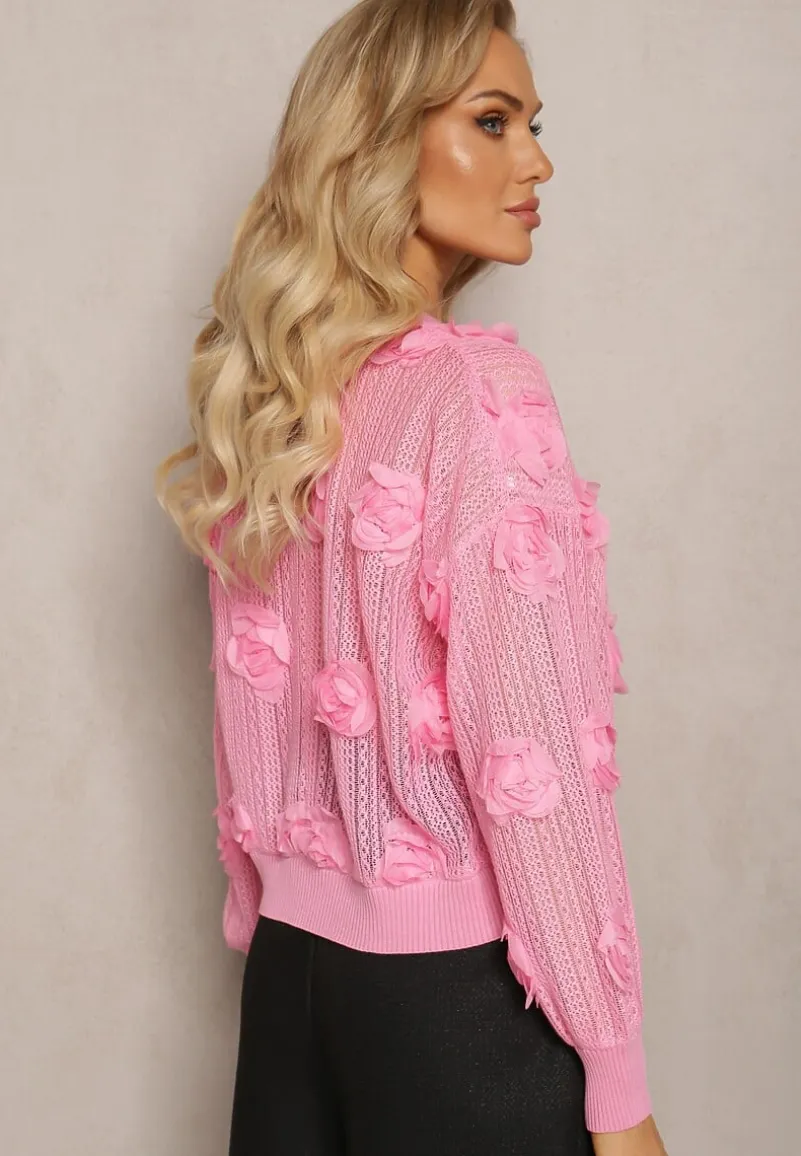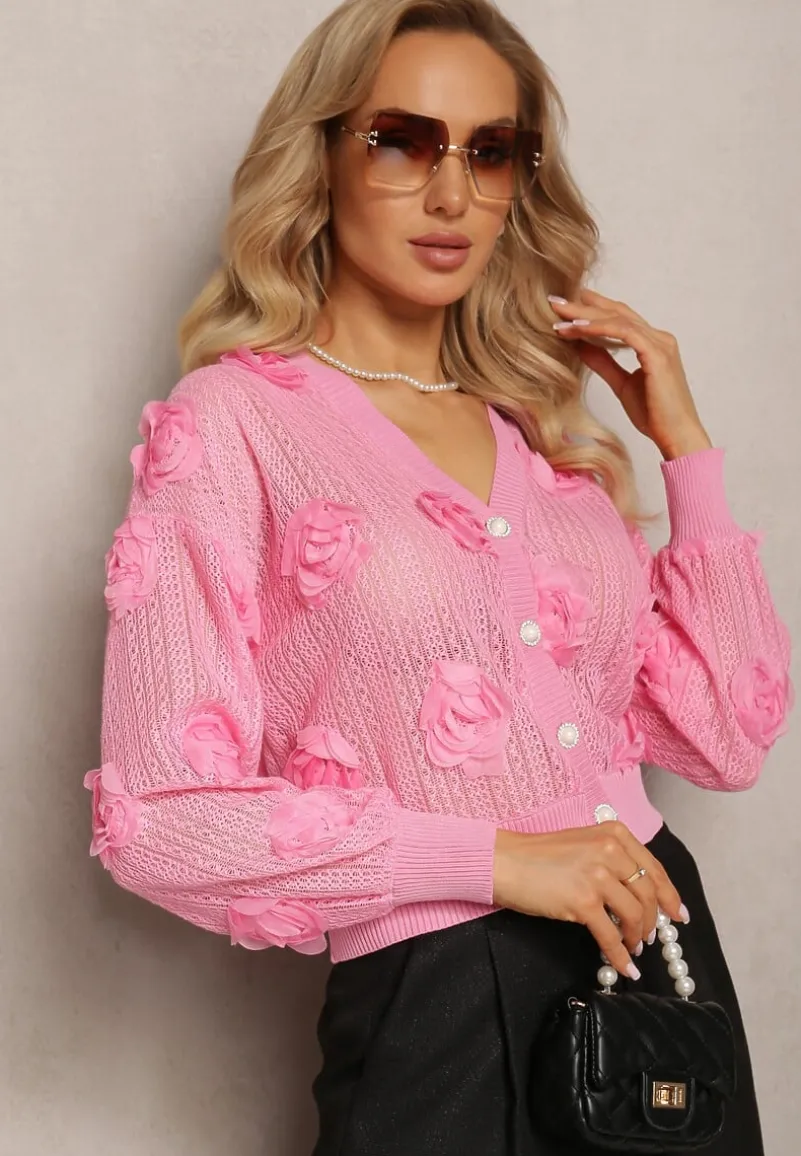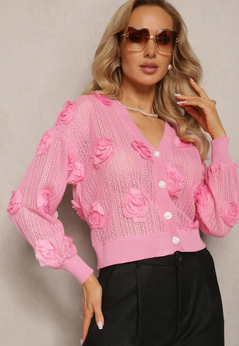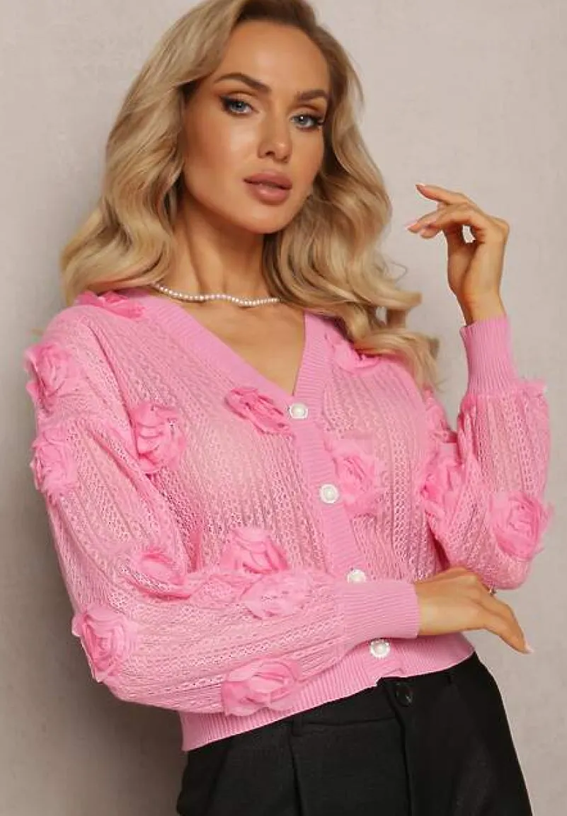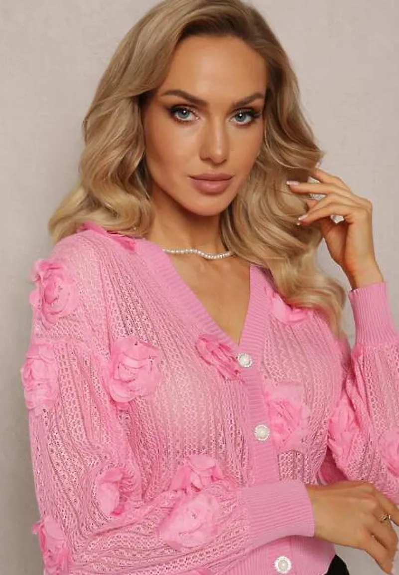 Kardigan Barimona zapinany na guziki. Wykonany z ażurowej tkaniny z imitacją kwiatów.