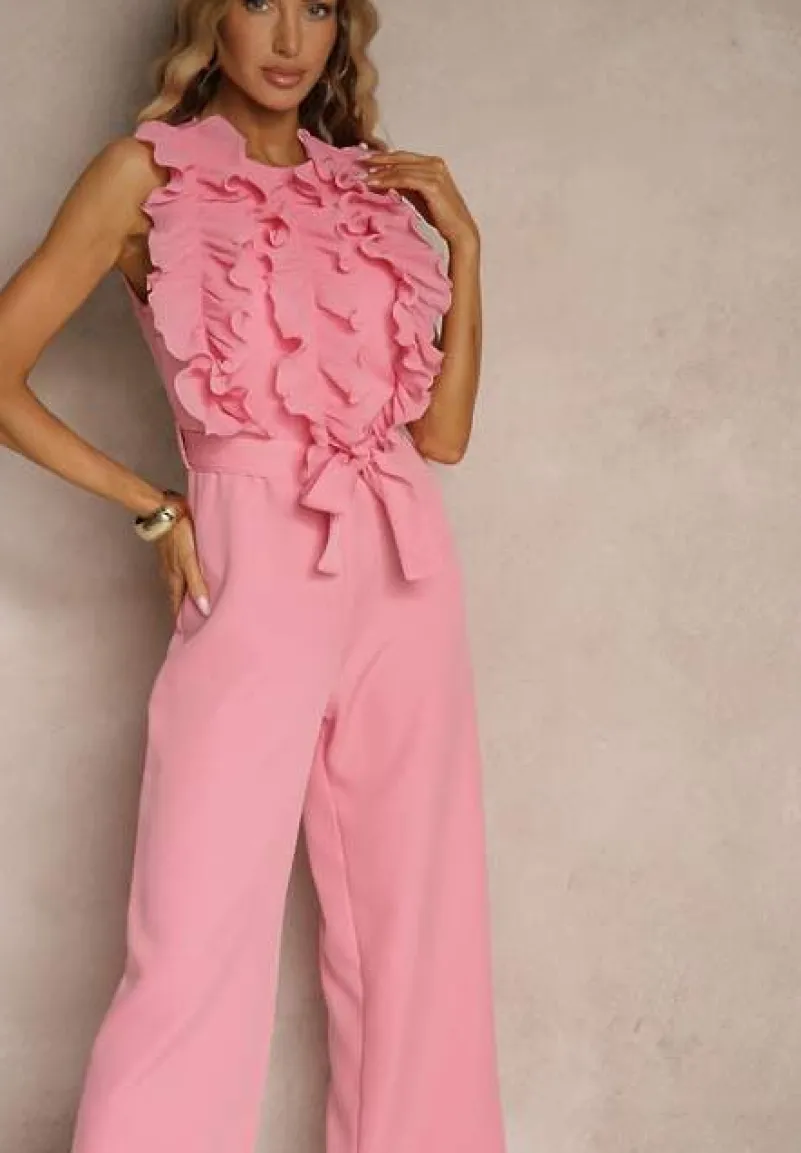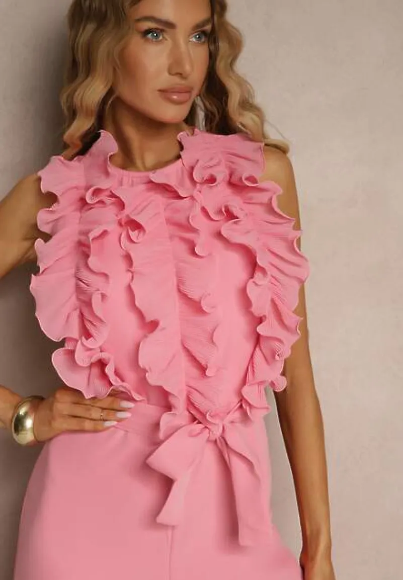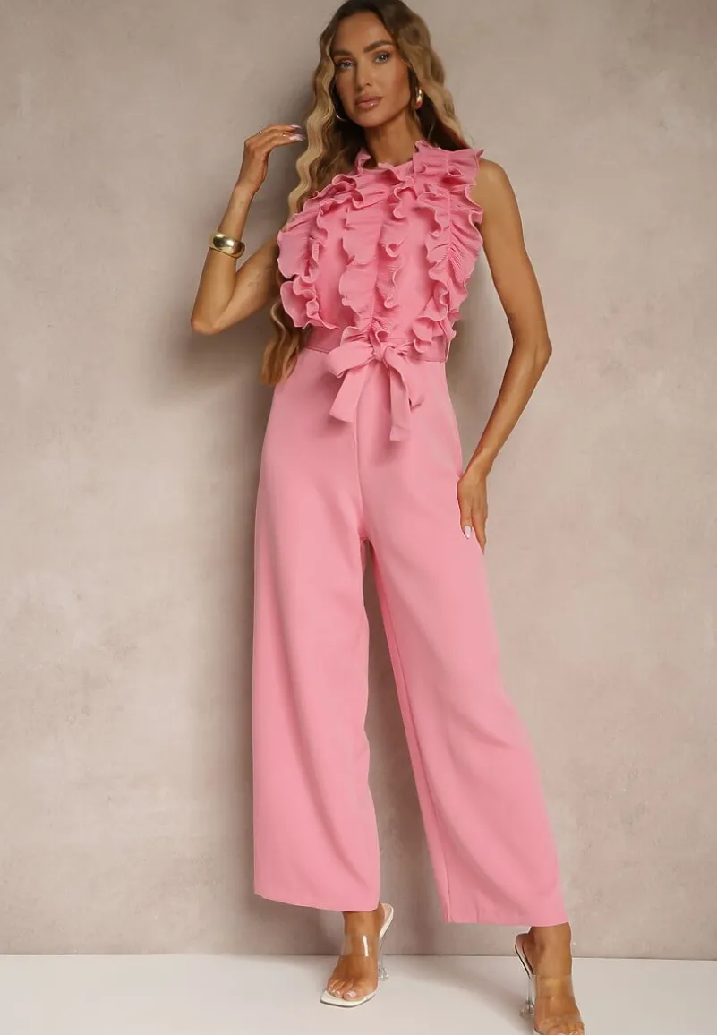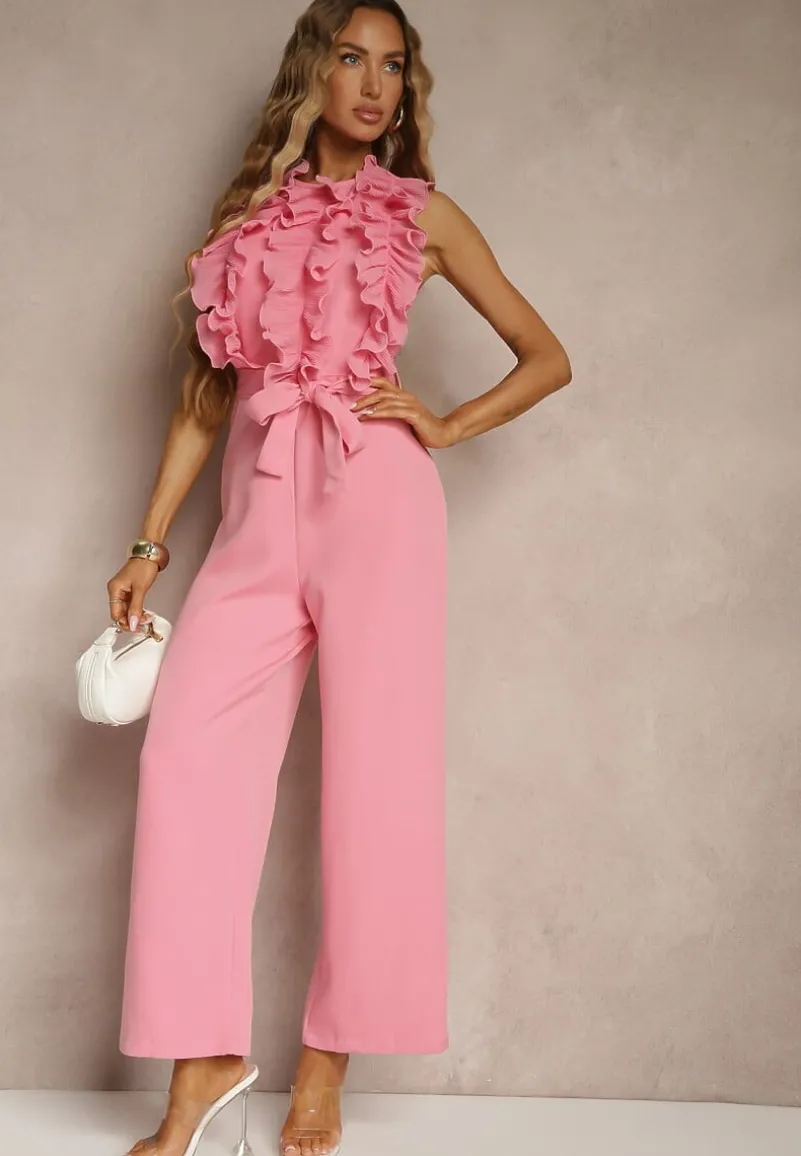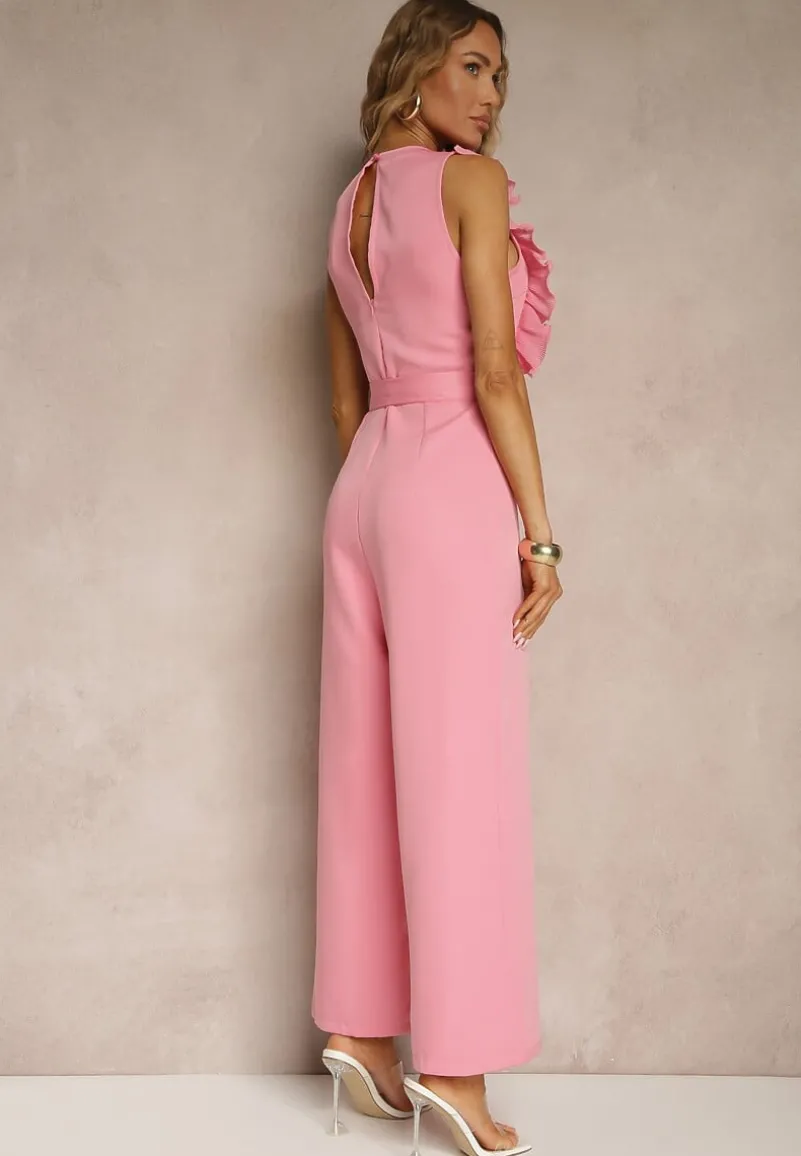 Różowy Kombinezon Koktajlowy z Żabotem Materiałowym Paskiem i Szerokimi Nogawkami Venelsea