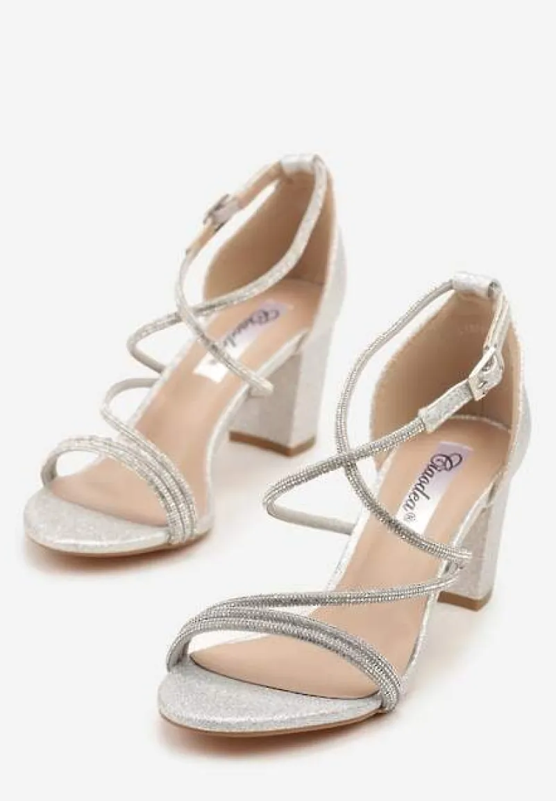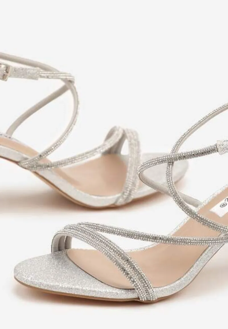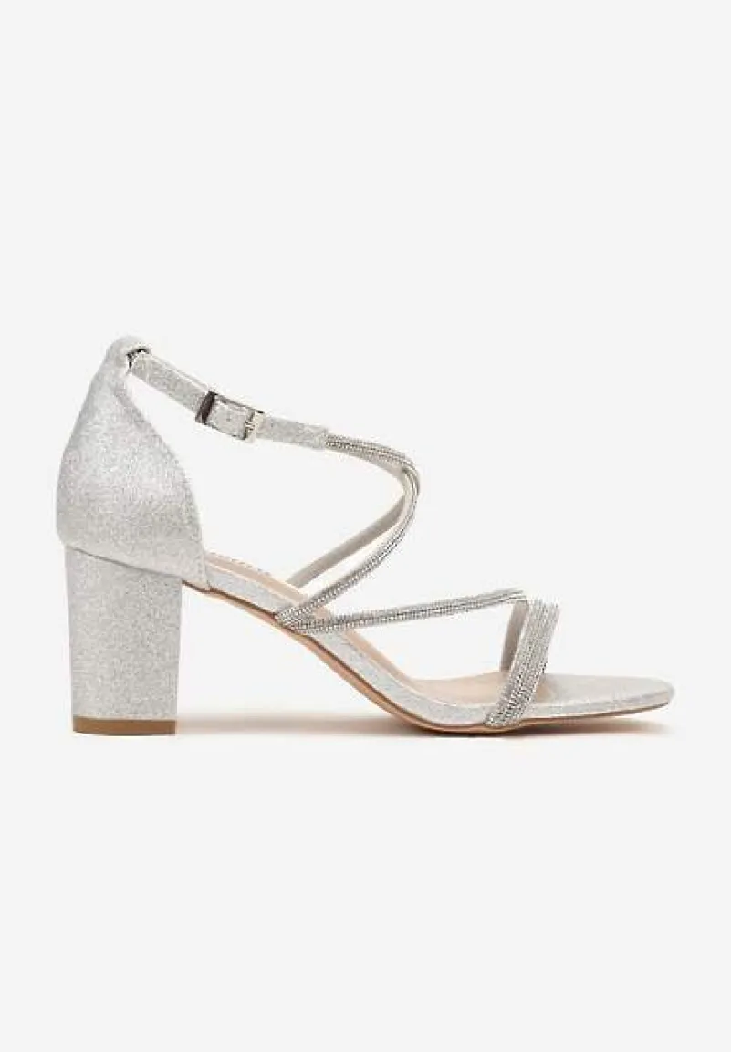 Srebrne Sandały na Słupku z Cyrkoniami i Brokatem Silanelle
