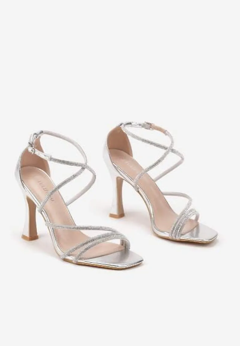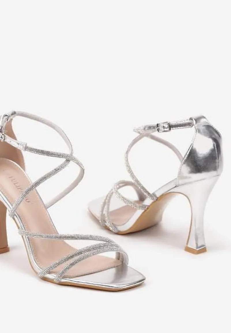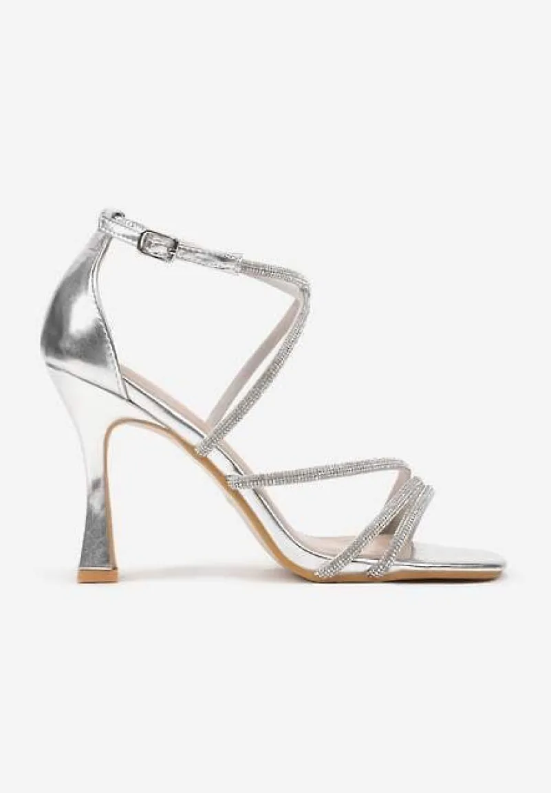 Srebrne Sandały na Szpilce Ozdobione Cyrkoniami i Paskami Felidra
