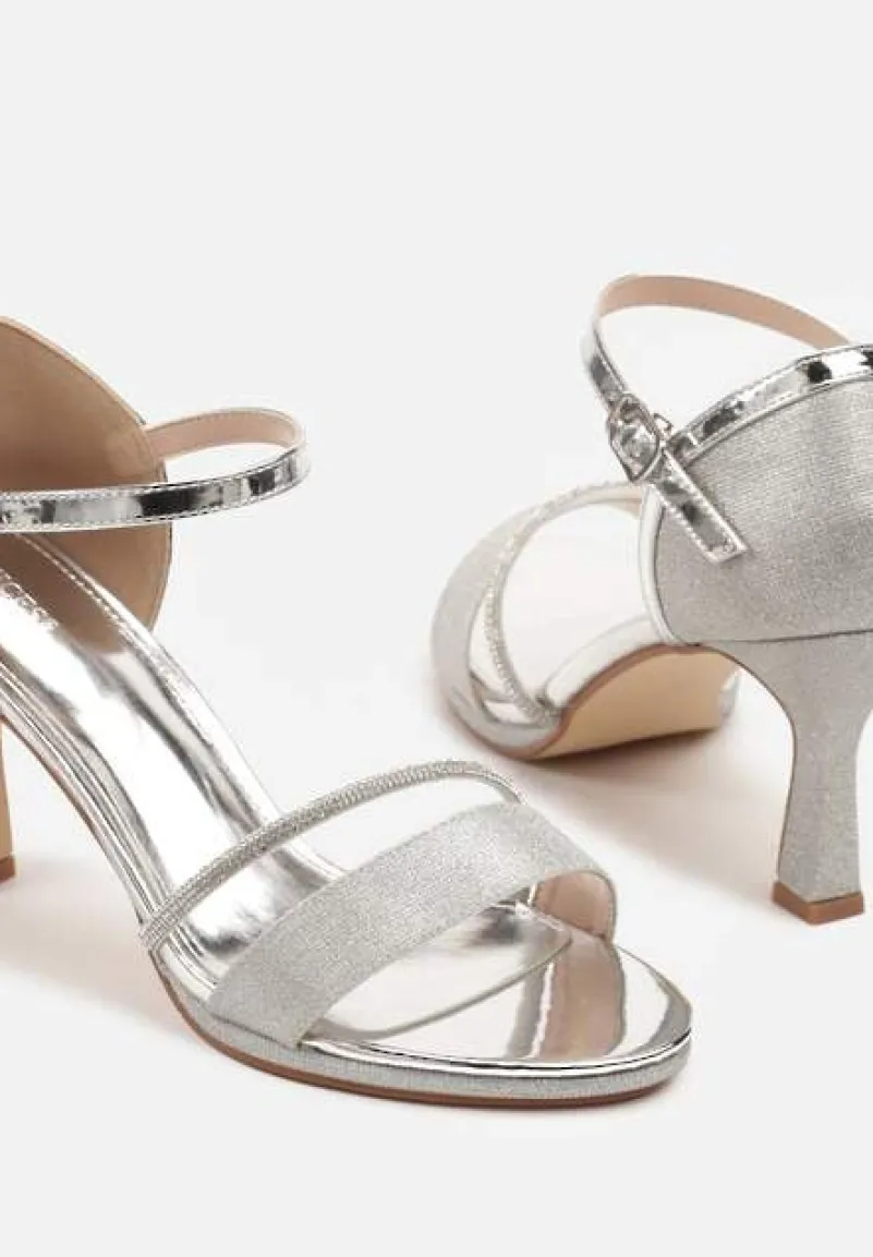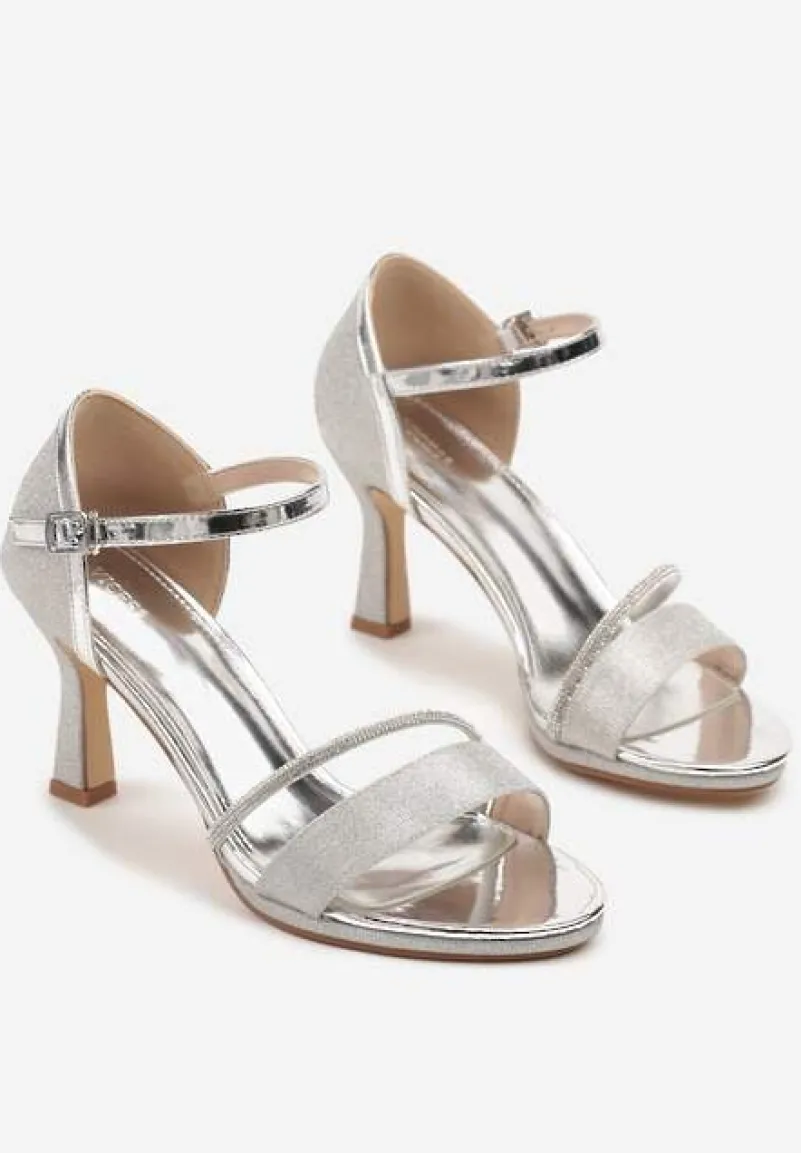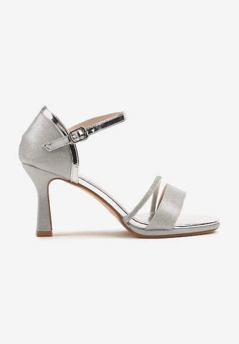 Srebrne Sandały na Szpilce Vices Ozdobione Cyrkoniami i Brokatem Lenallis