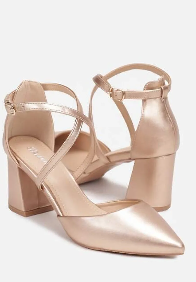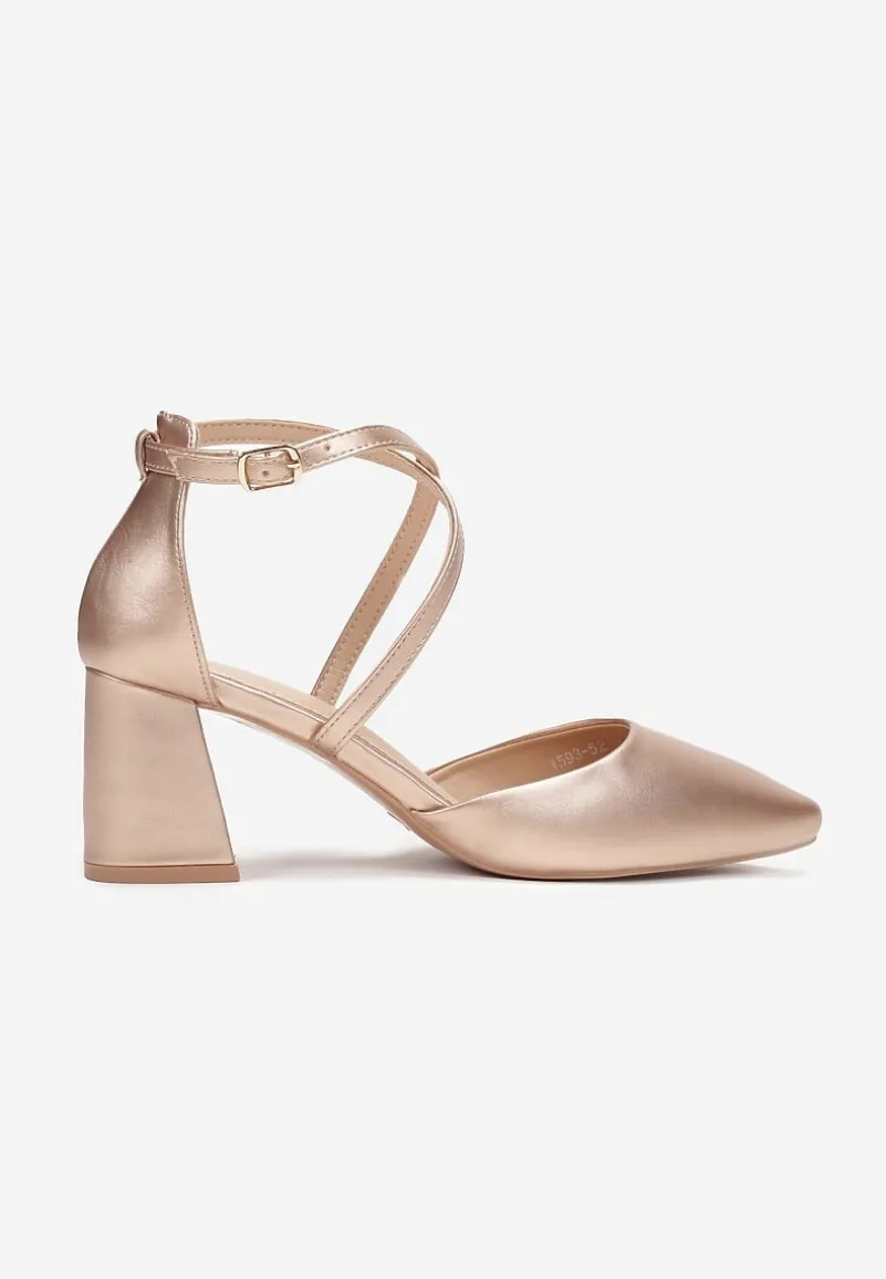 Czółenka Akisiphaeia na średniej wysokości słupku, ze szpiczastym noskiem. Wokół kostki cienki pasek zapinany na sprzączkę. Na śródstopiu dwa skrzyżowane paseczki. Przód i tył zabudowane, boki odkryte. Wykonane z ekoskóry. Sugerujemy wybór rozmiaru o 1 mniejszego. Ten ponadczasowy model perfekcyjnie dopasuje się do stylizacji koktajlowych, biznesowych lub romantycznych.