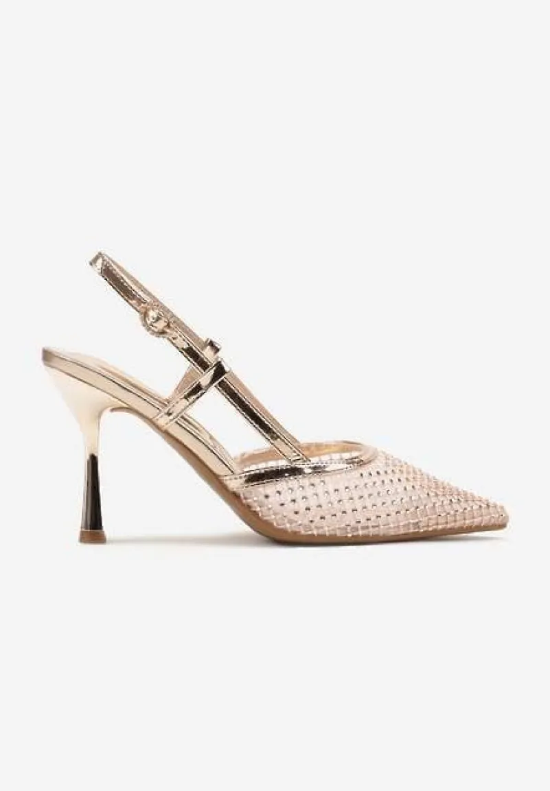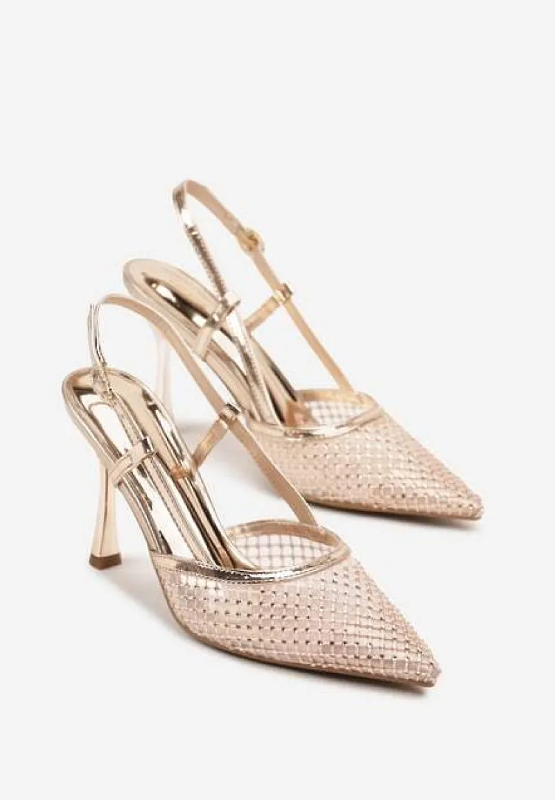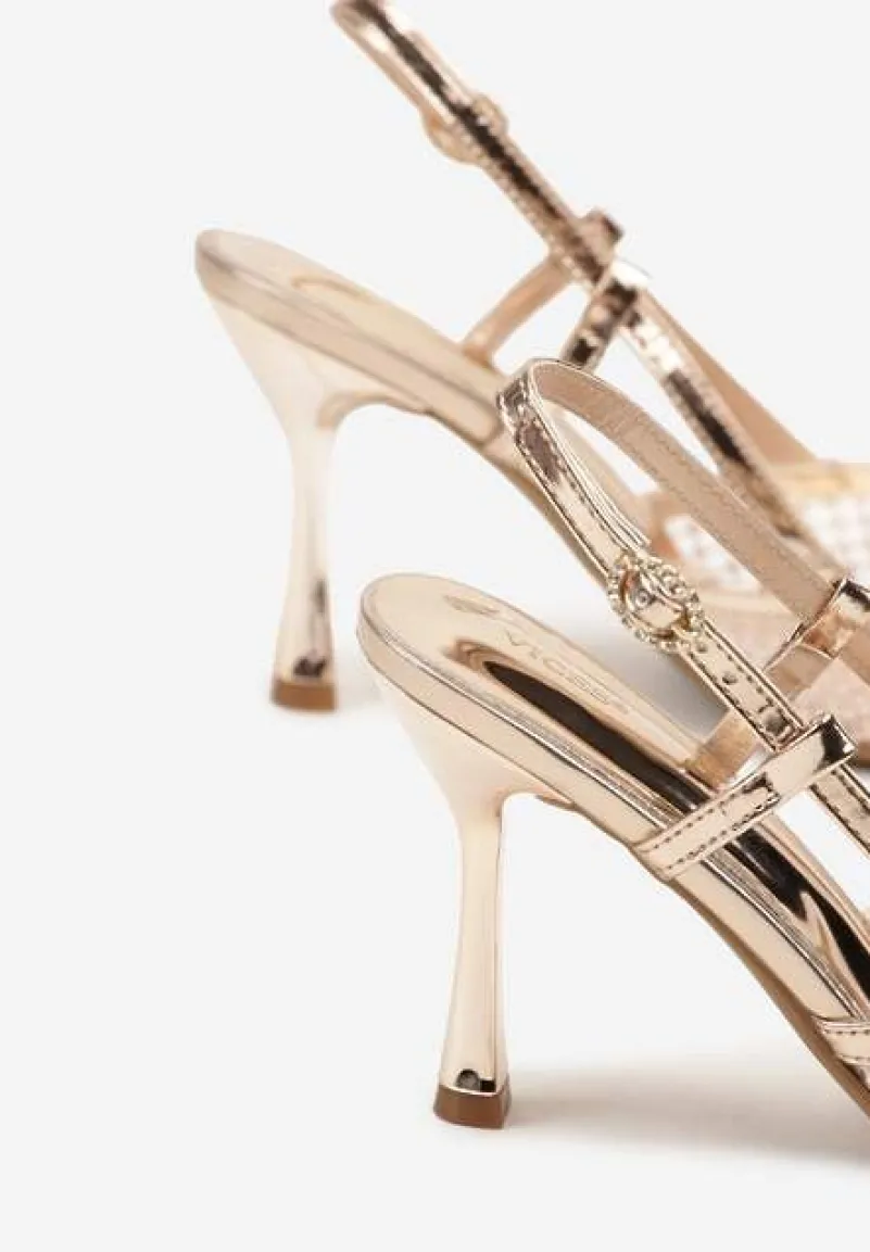 Szampańskie Sandały na Szpilce Vices z Siateczkową Cholewką z Cyrkoniami Liramire