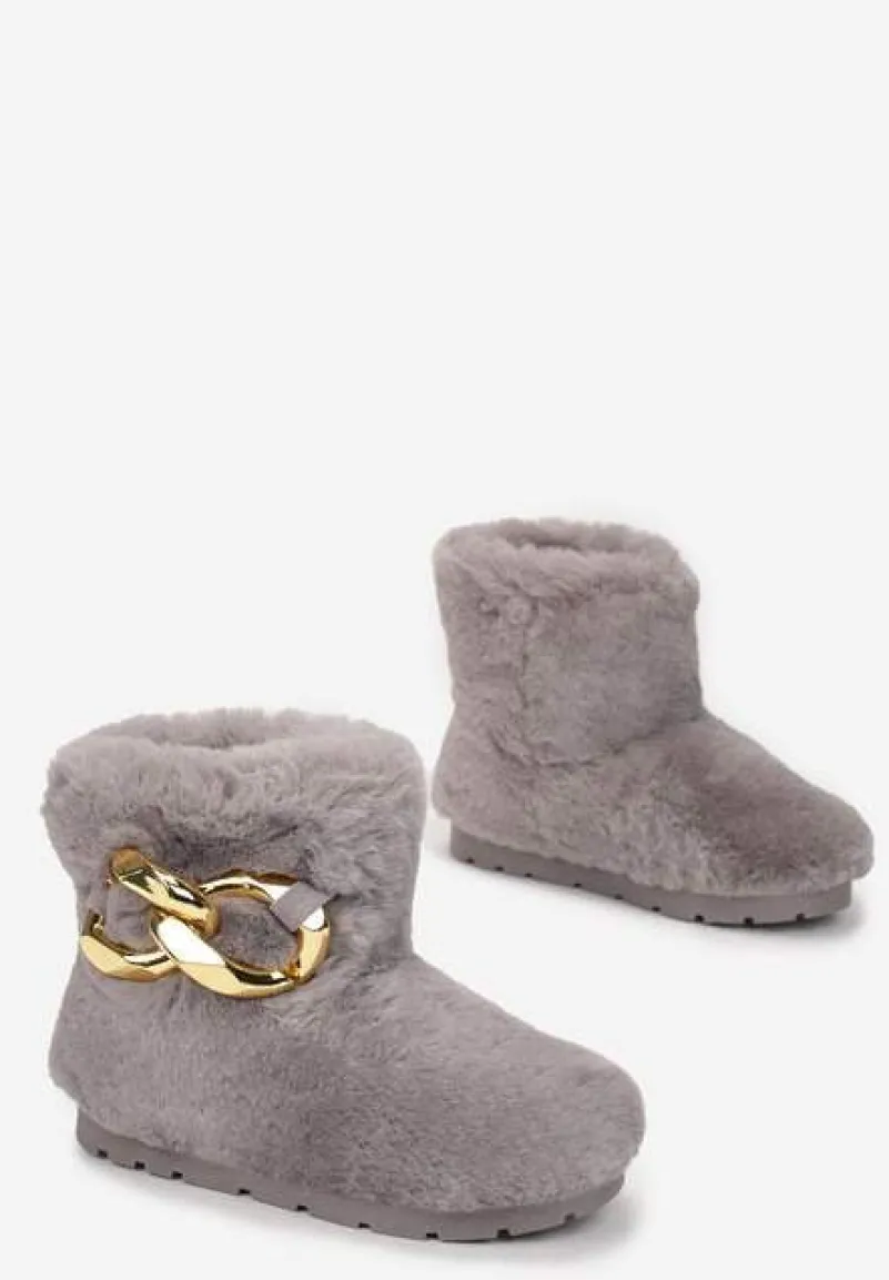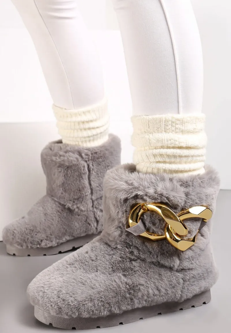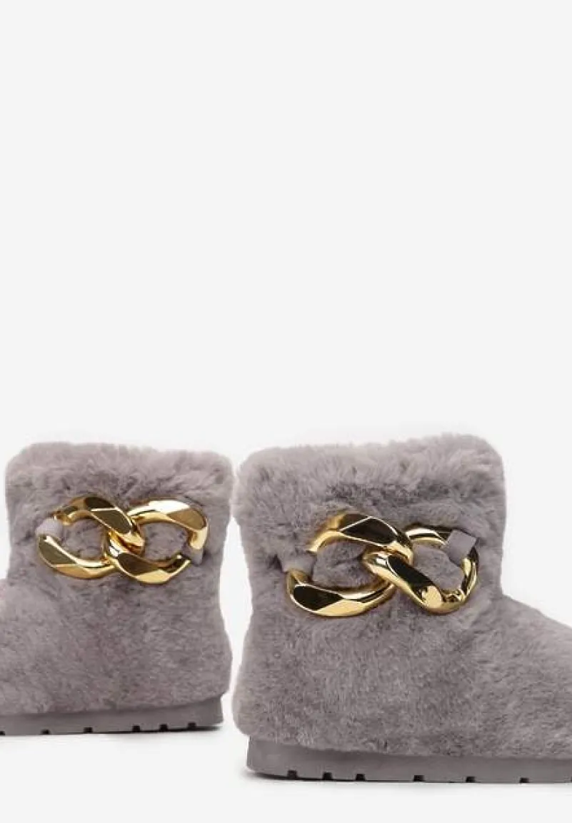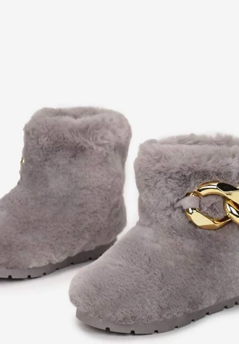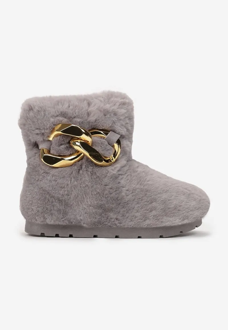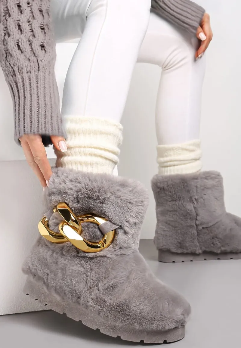 Śniegowce Dephare futrzane, ze wsuwaną cholewką sięgającą za kostkę. Osadzone na grubej podeszwie ze stabilizującym protektorem. Wykonane z miłego w dotyku, miękkiego materiału imitującego futerko. Udekorowane w tylnej części łańcuchem w złotym kolorze. Mocno ocieplane od środka imitacją futerka. Polecamy zakup rozmiaru o 1 większego. Wyglądają fenomenalnie w komplecie z kurtką typu miś!