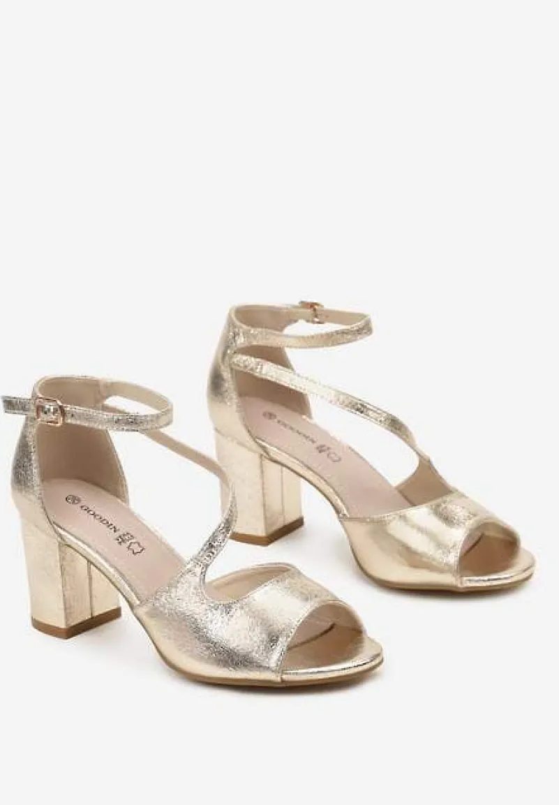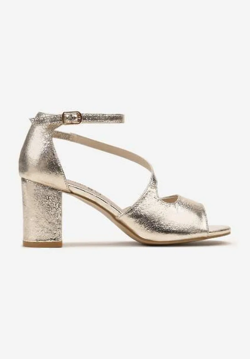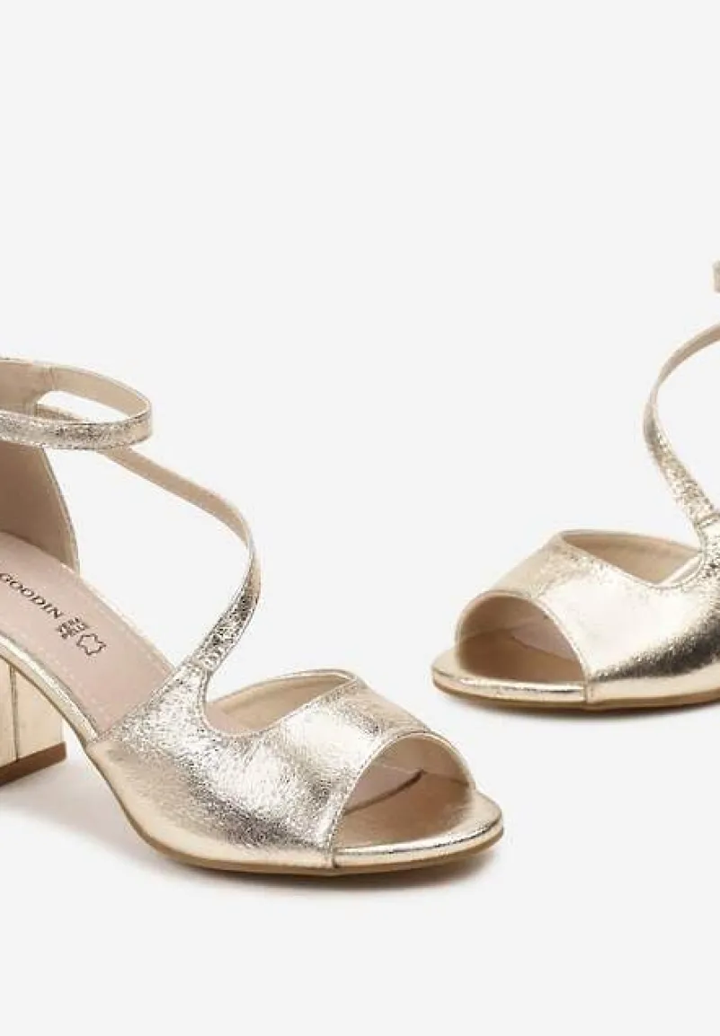 Złote Eleganckie Sandały na Powlekanym Obcasie ze Skórzaną Wkładką Brigides
