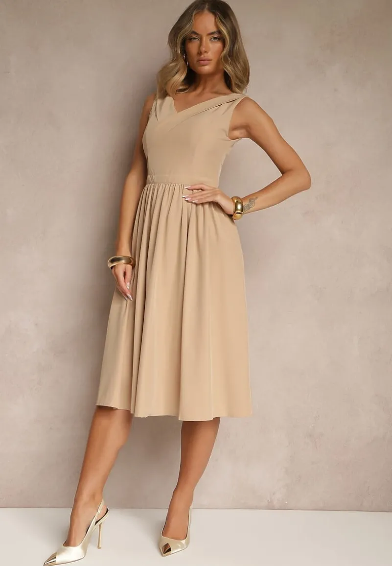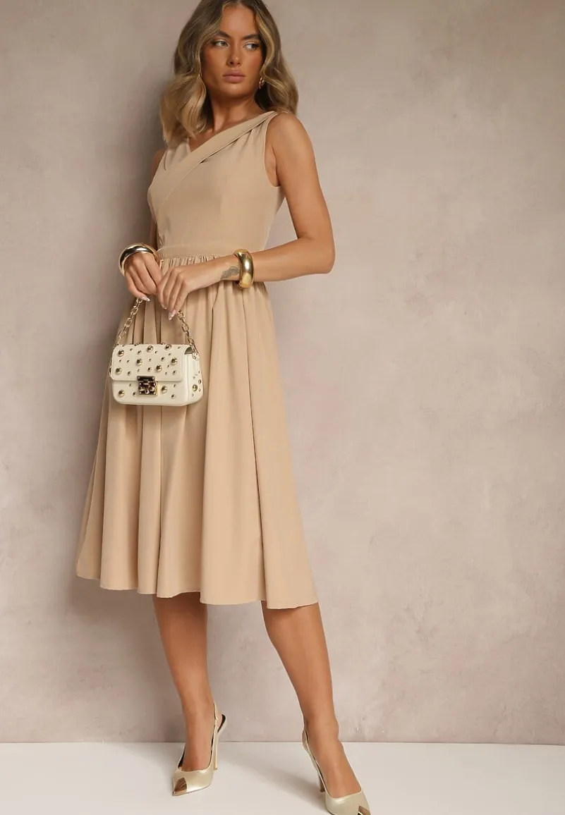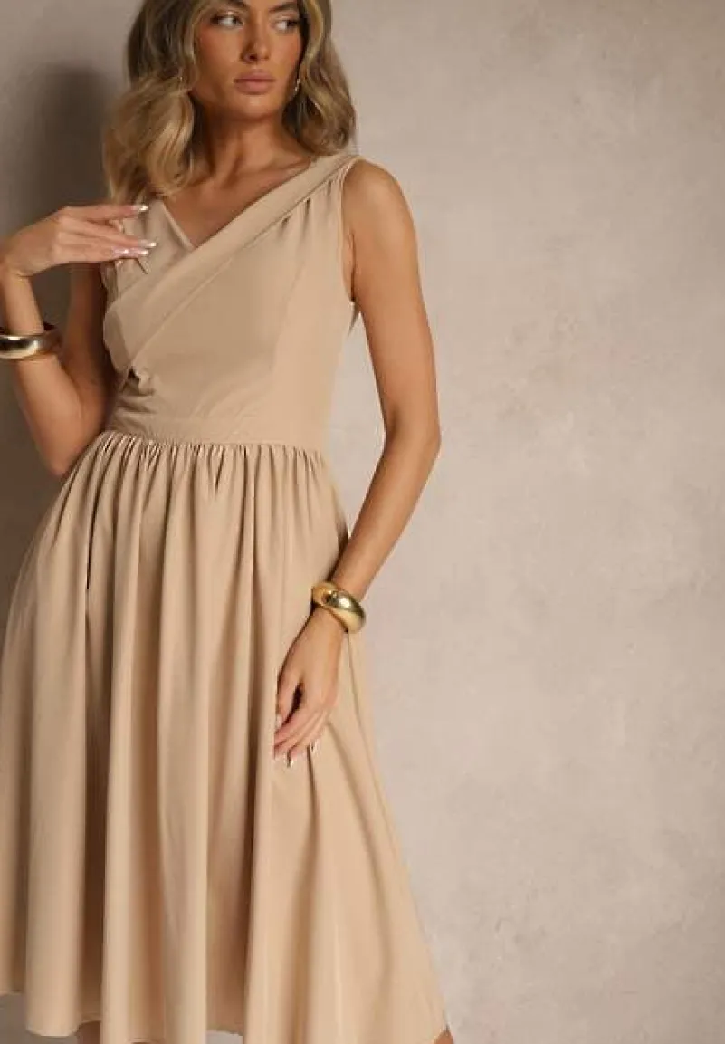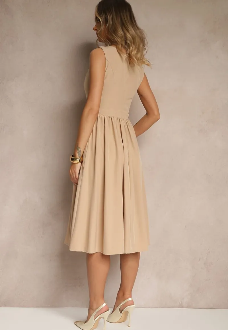 Beżowa Basicowa Sukienka Vices o Rozkloszowanym Kroju Tolaneia