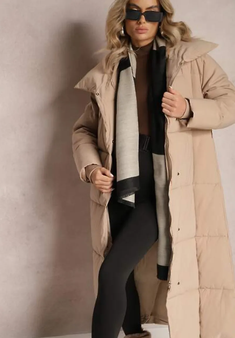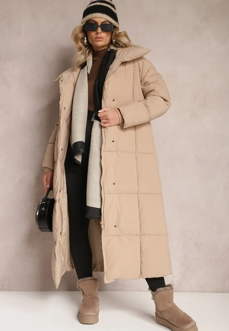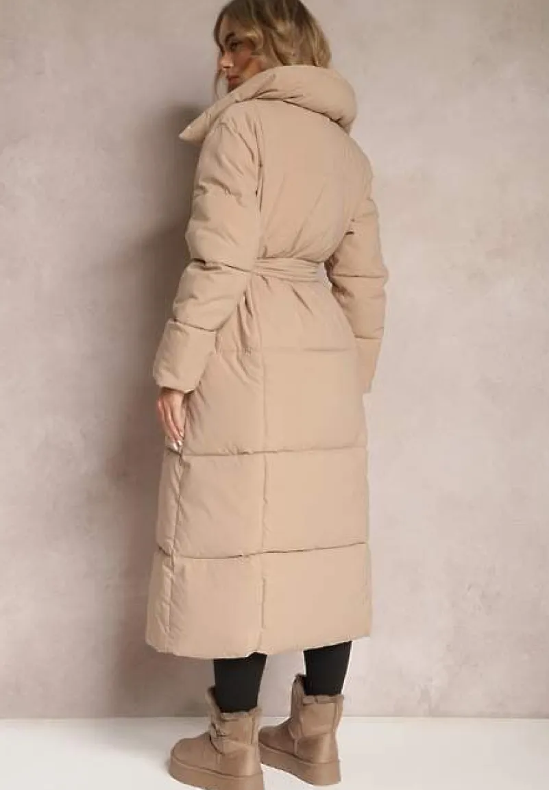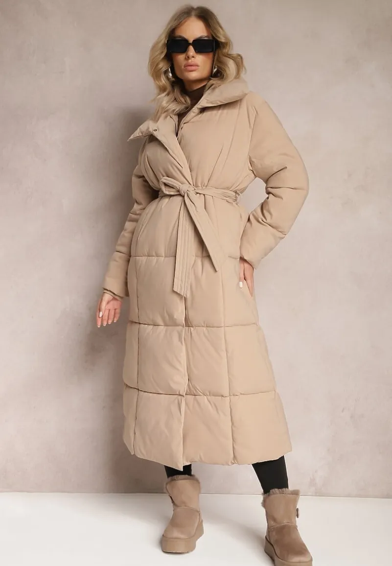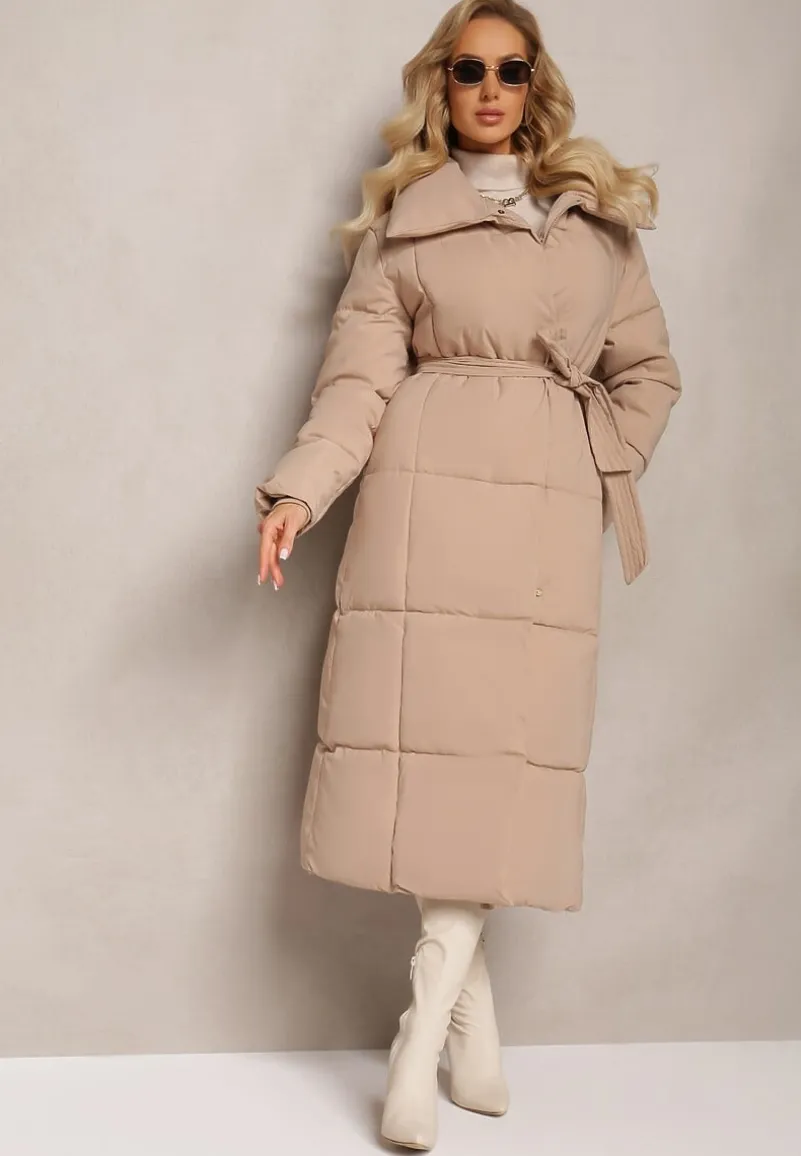 Długa Kurtka Adellesstta zdobiona stylowym pikowaniem. Przód zapinany na zamek błyskawiczny pod plisą na napy. Model grubo ocieplany. Wcięcie w talii podkreśla wiązany pasek. Po bokach zapinane kieszenie.