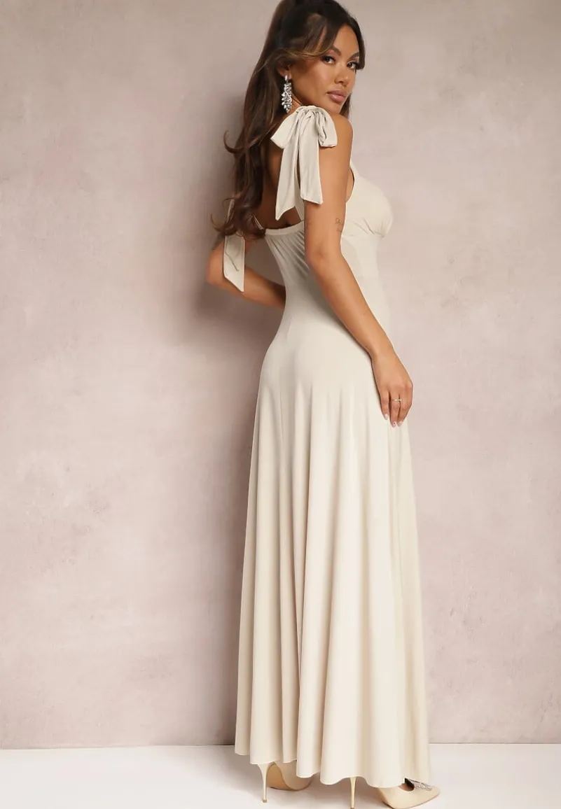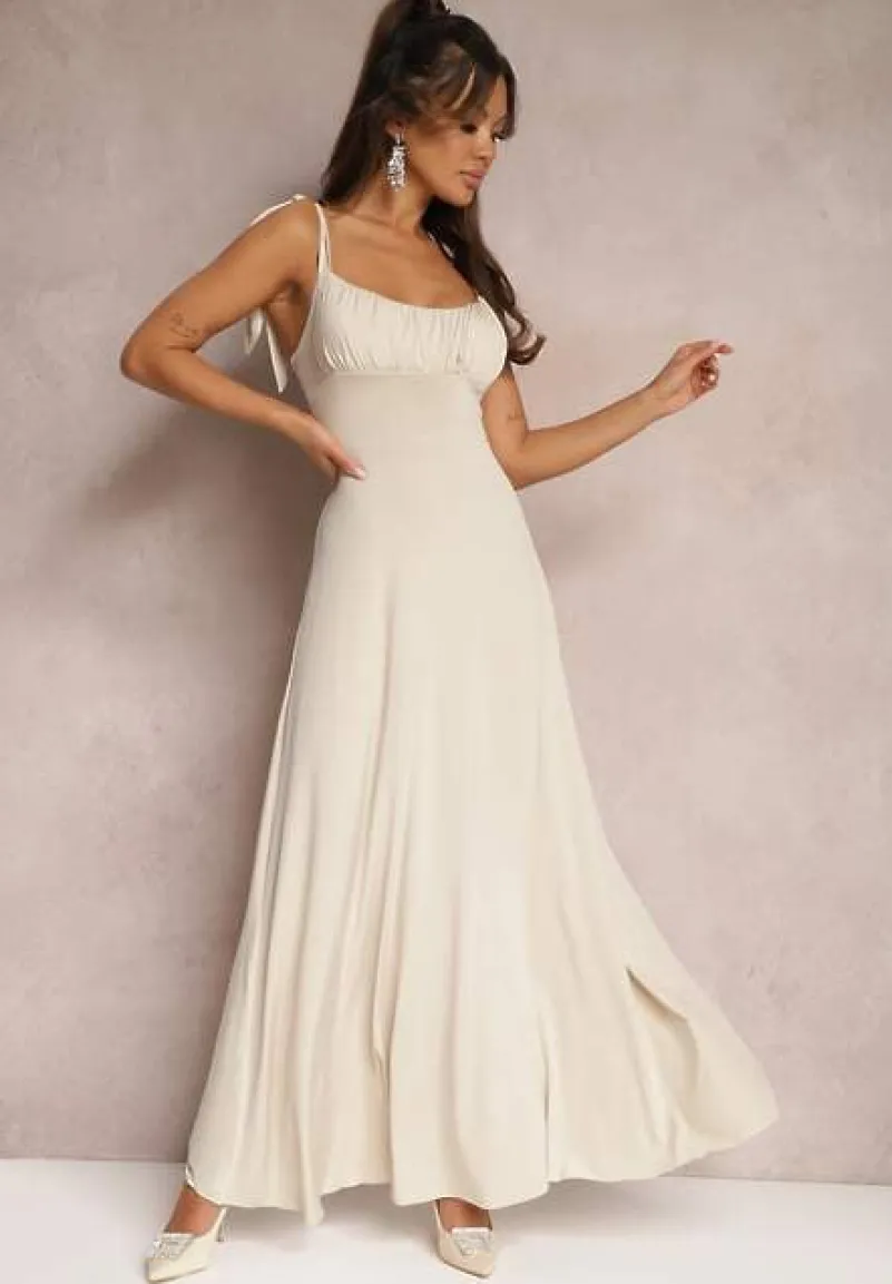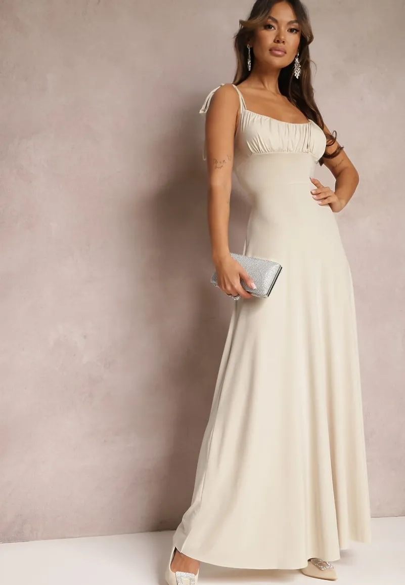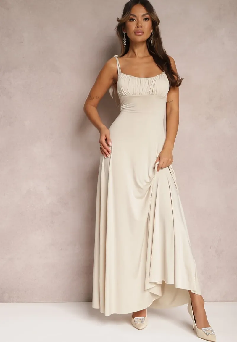 Beżowa Długa Sukienka z Marszczonym Dekoltem i Wiązanymi Ramiączkami Rozvita