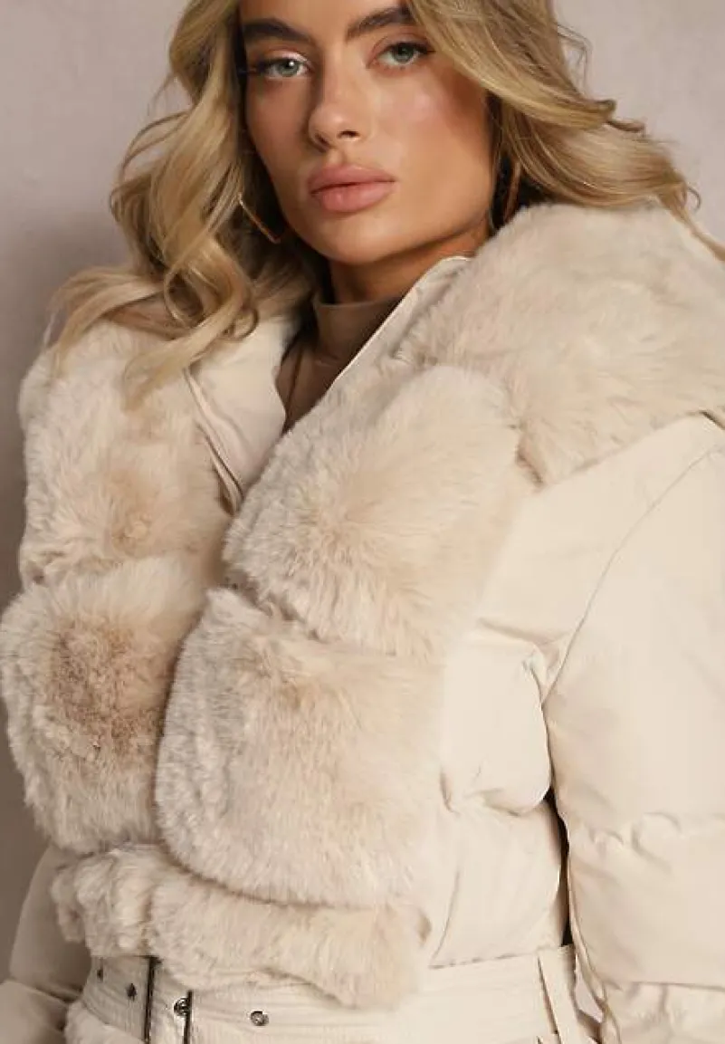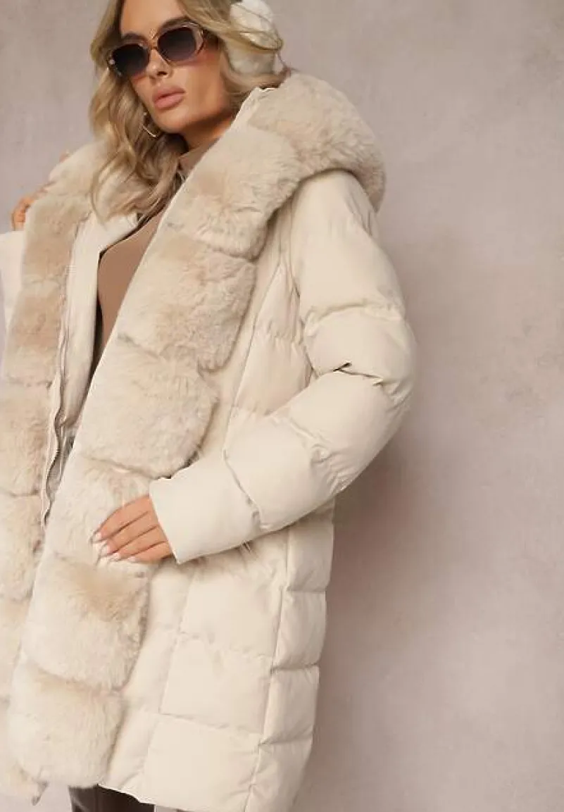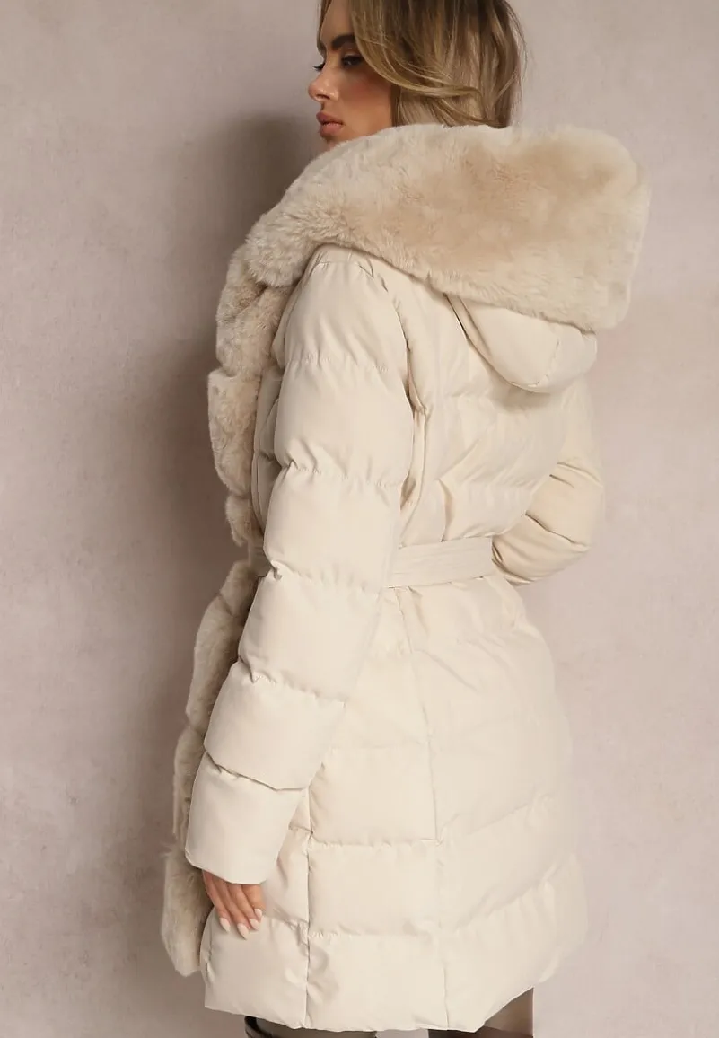 Kurtka Ikorrde o przedłużonym fasonie z kapturem i ozdobnym pikowaniem. Zapinana na zamek błyskawiczny. Kieszenie na suwak na wysokości bioder. Ozdobiona odczepianym sztucznym futerkiem wzdłuż suwaka i kaptura. W talii elastyczny pasek.