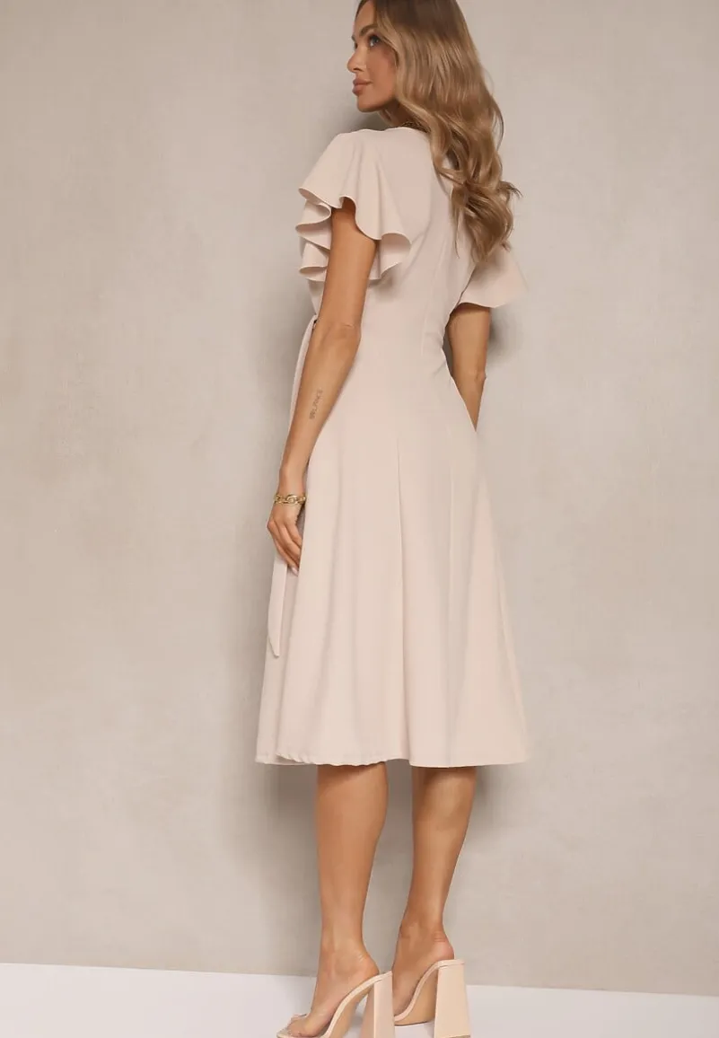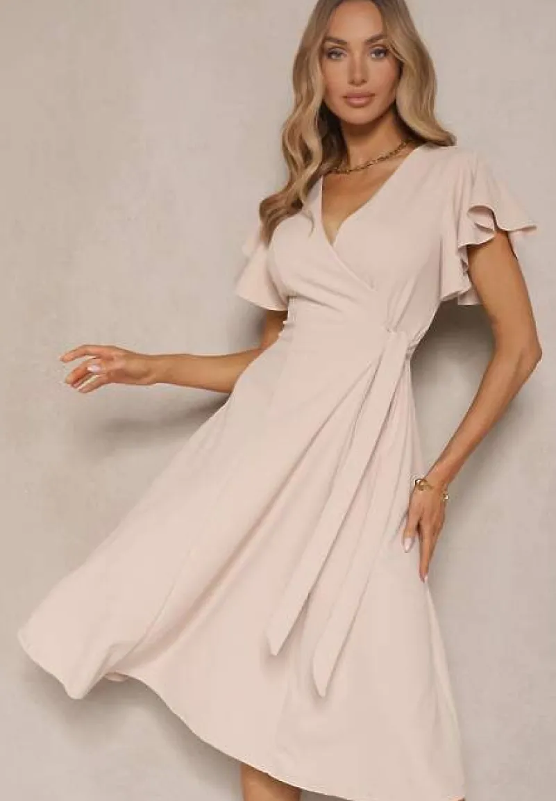 Beżowa Kopertowa Sukienka z Rozkloszowanym Dołem i Ozdobnym Wiązaniem Dannola