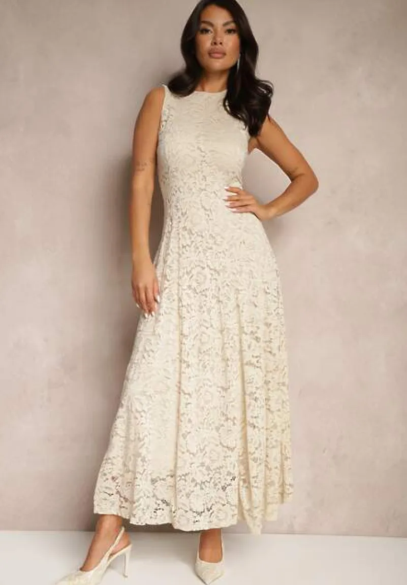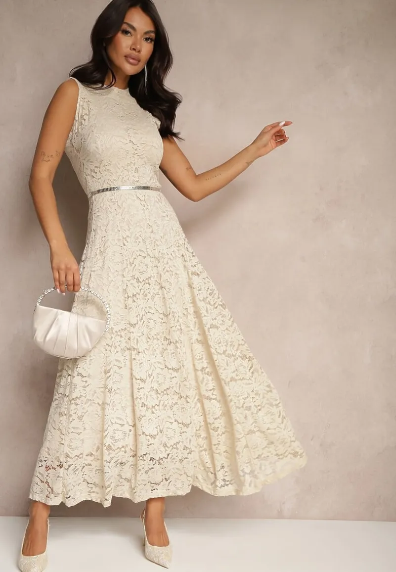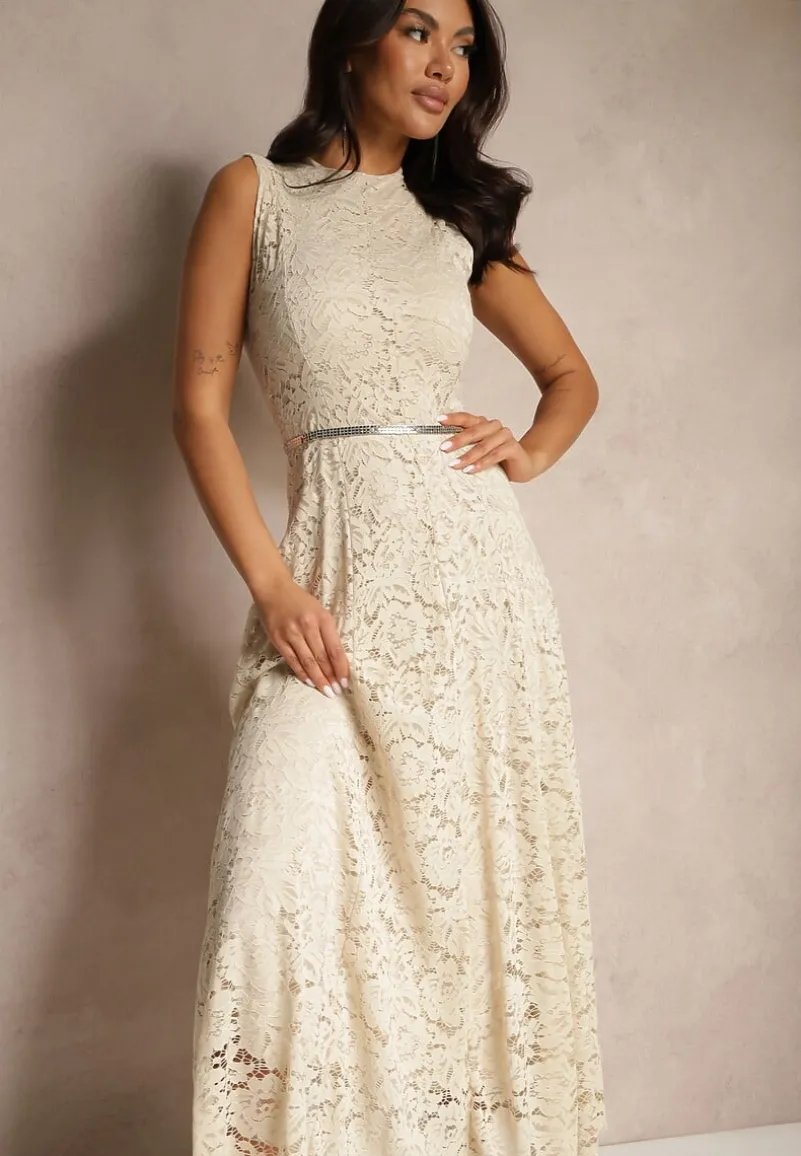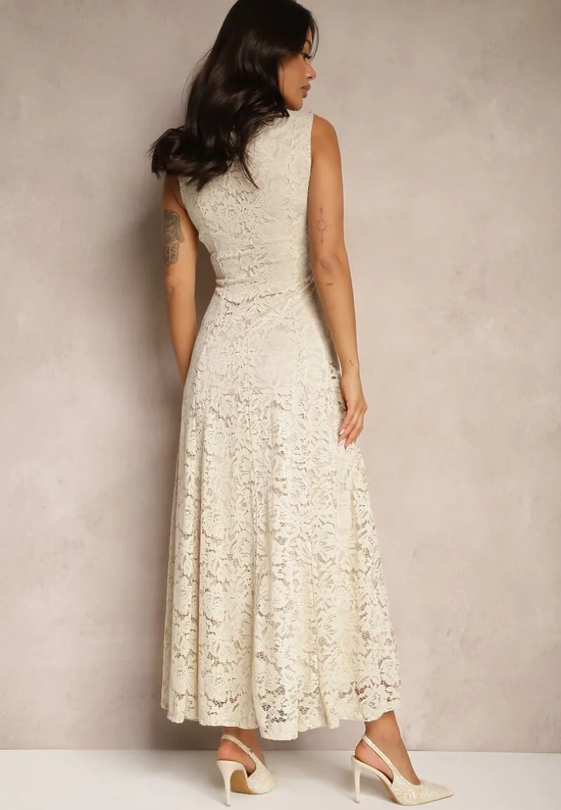 Beżowa Koronkowa Sukienka Taliowana Wilreti