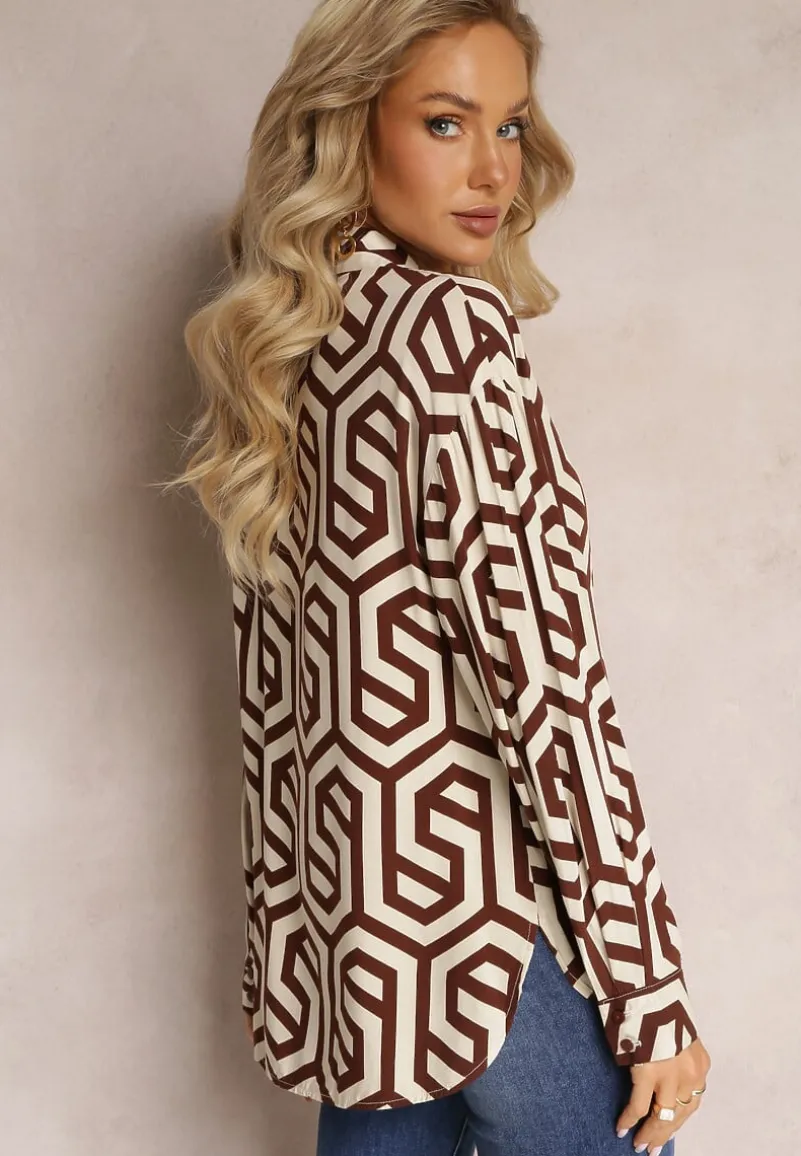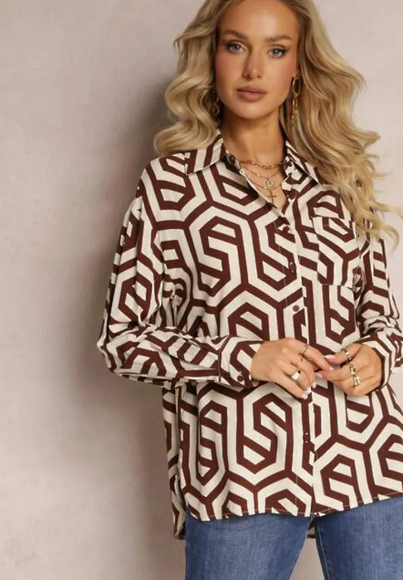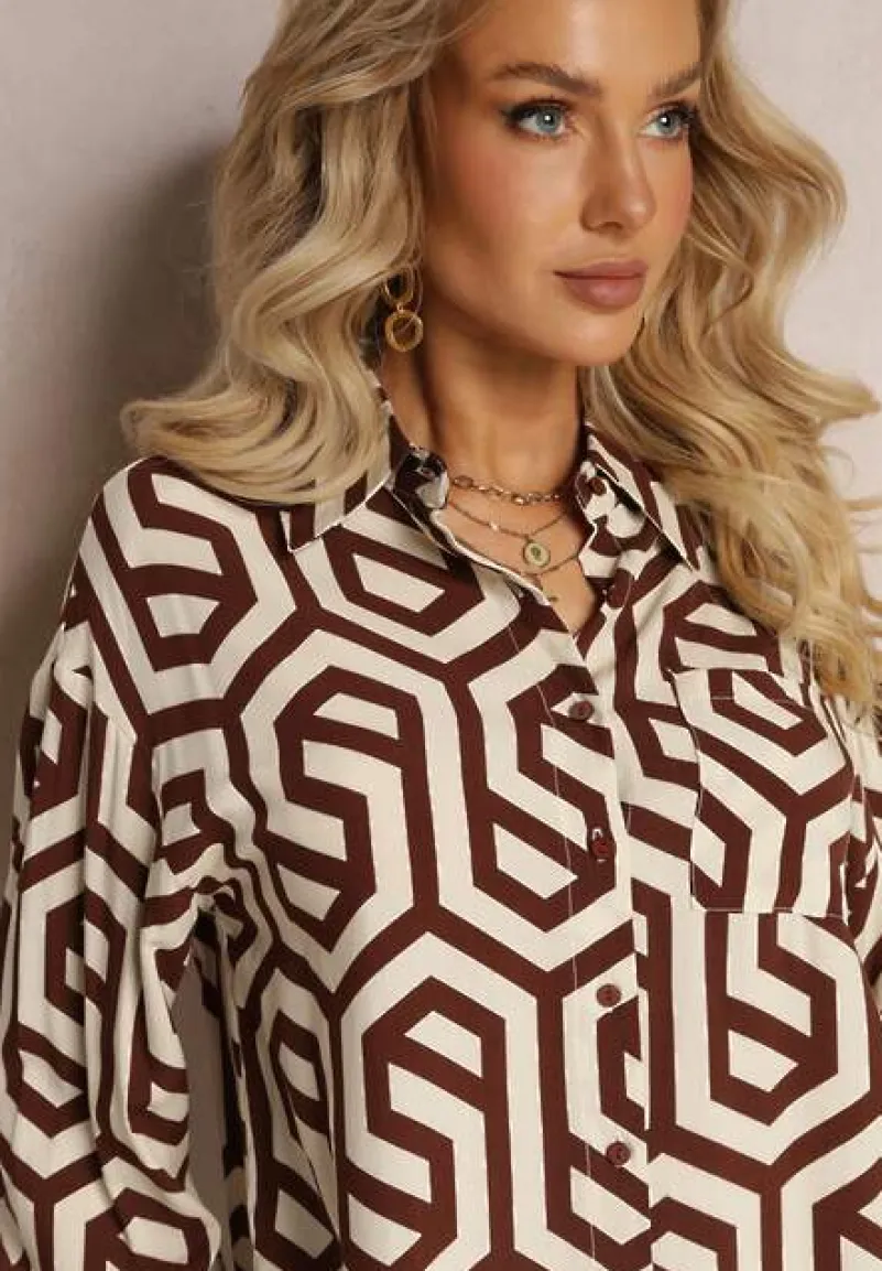 Koszula Bintas z długim rękawem zakończonym mankietem na guzik. Zapinana na guziki, wykonana ze wzorzystego materiału w geometryczne figury. Dekolt płytki, o okrągłym kształcie. Na górze, na wysokości klatki piersiowej znajduje się mała kieszonka. Idealna koszula na wyjście na randkę lub do pracy, w komplecie z butami sportowymi lub na obcasie.