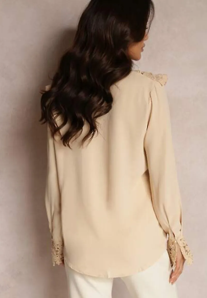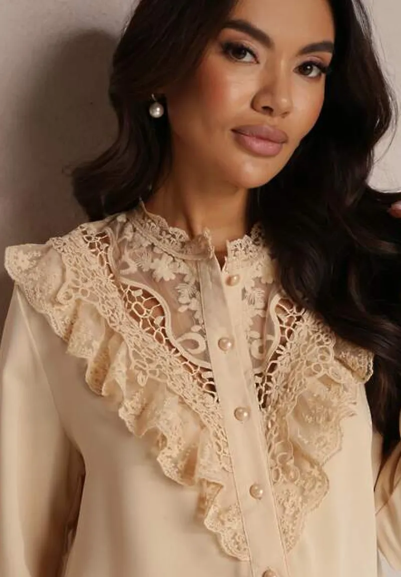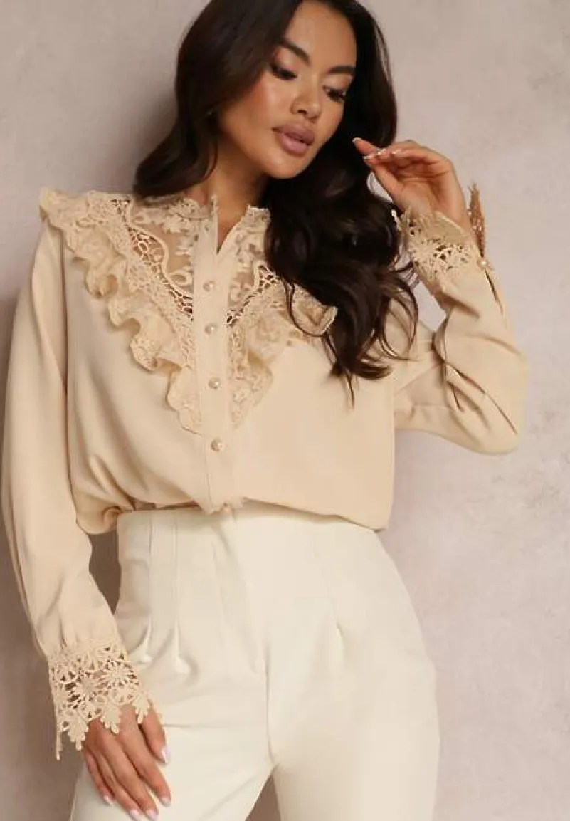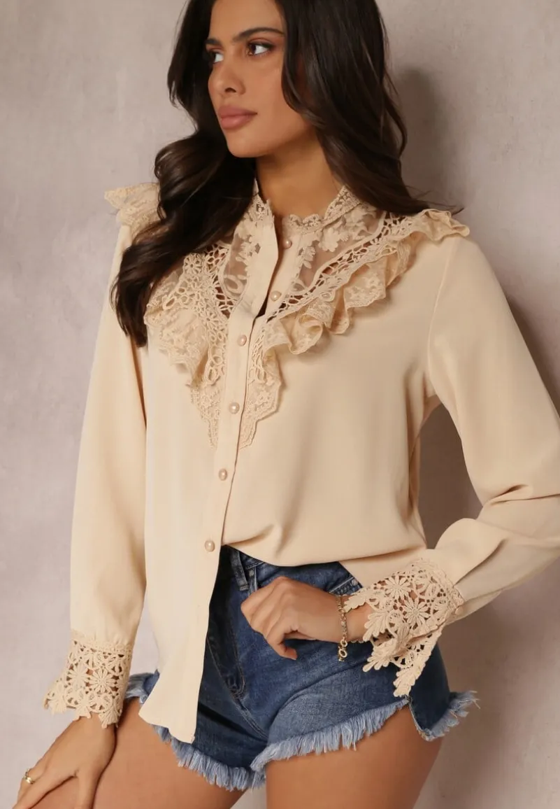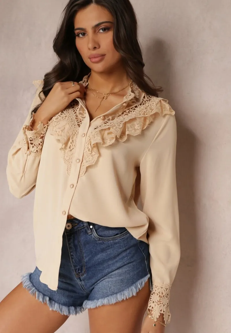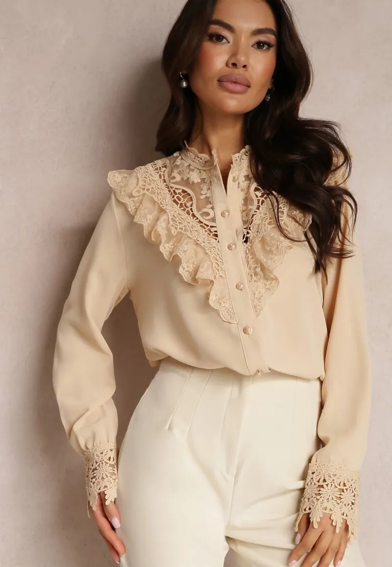 Koronkowa koszula Hassei zapinana na ozdobne guziki w kształcie pereł. Ozdobiona piękną koronką wszytą przy dekolcie oraz na końcu długich rękawów. Modna koszula Hassei sprawdzi się w stylizacjach o każdej porze roku.