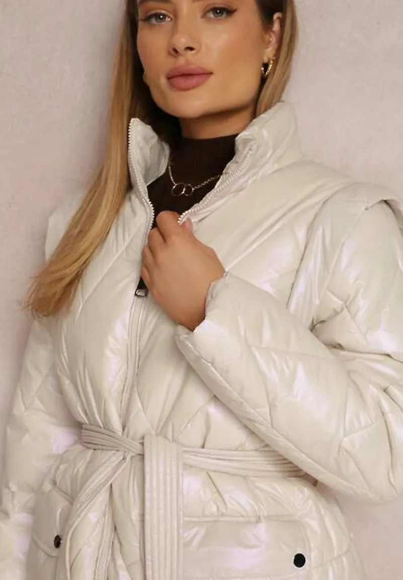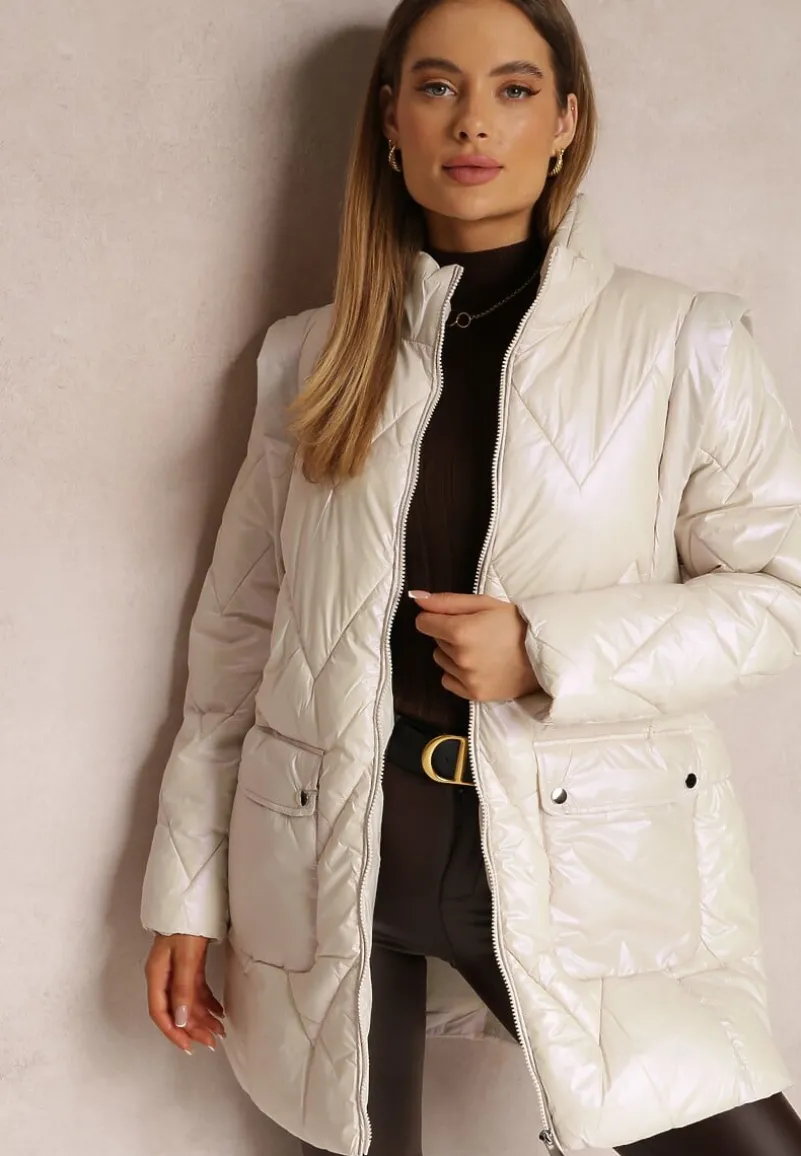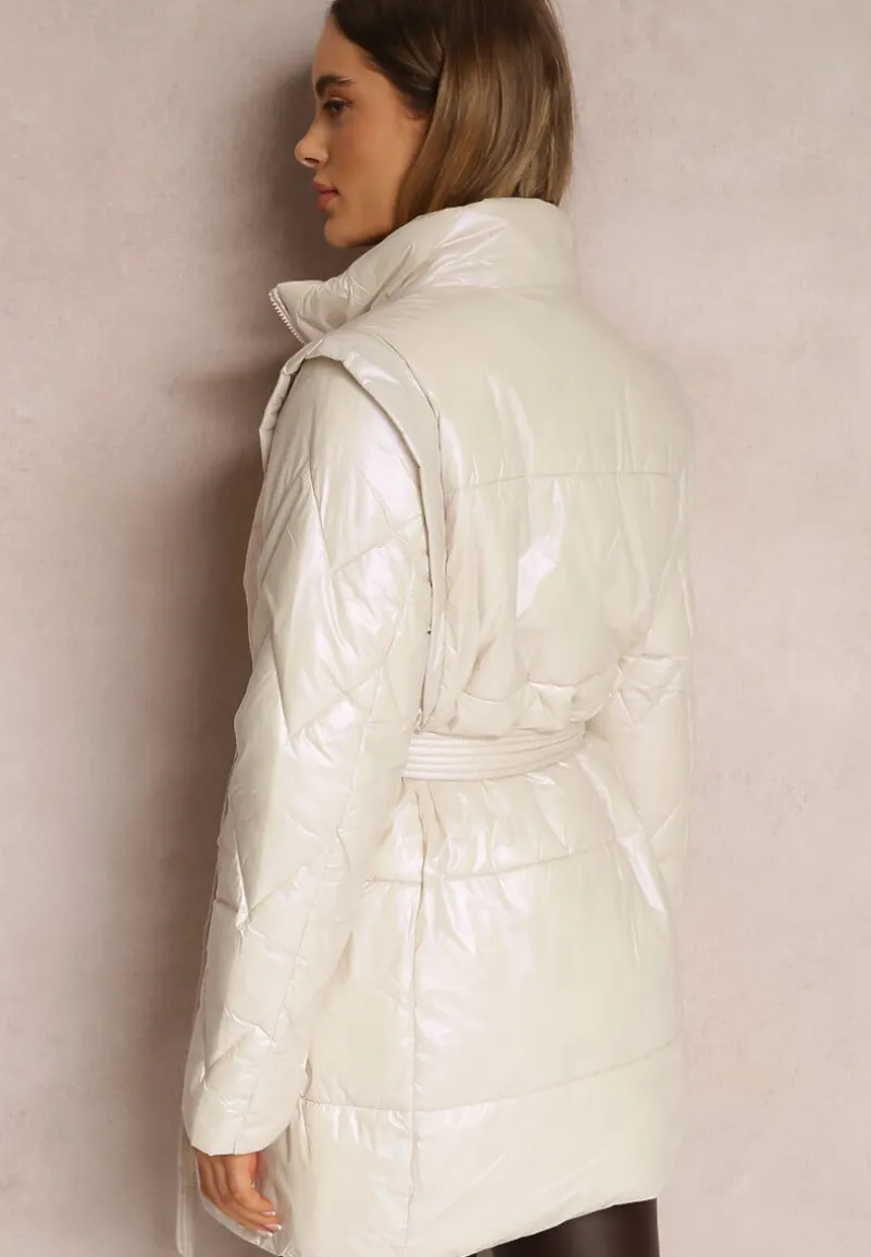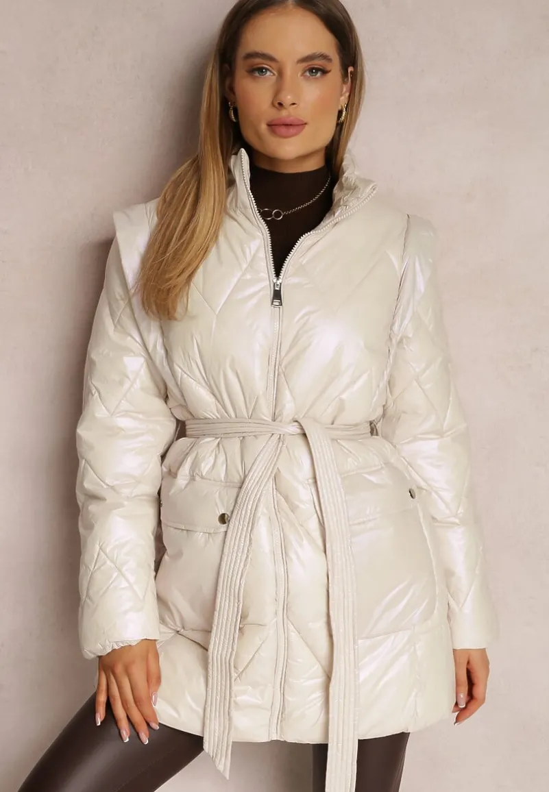 Kurtka Chozi pikowana, o lekko przedłużonym kroju oraz wiązana w pasie materiałowym paskiem. Długie rękawy z możliwością odpięcia. Zasuwana z przodu na zamek błyskawiczny. Bez kaptura, wokół szyi wysoka stójka. Po bokach kieszenie z klapami na napy. Średnio ocieplana.