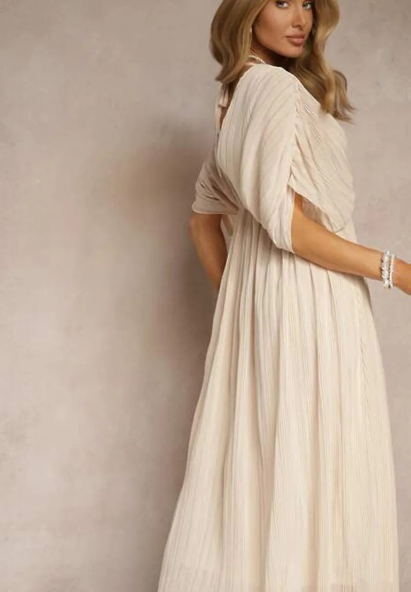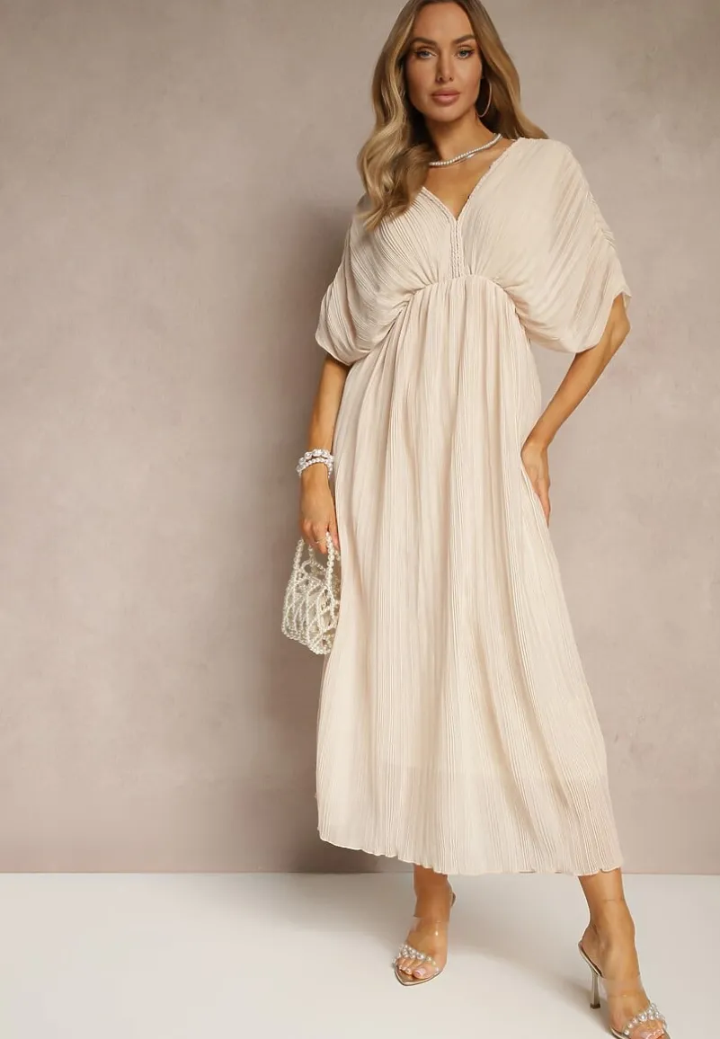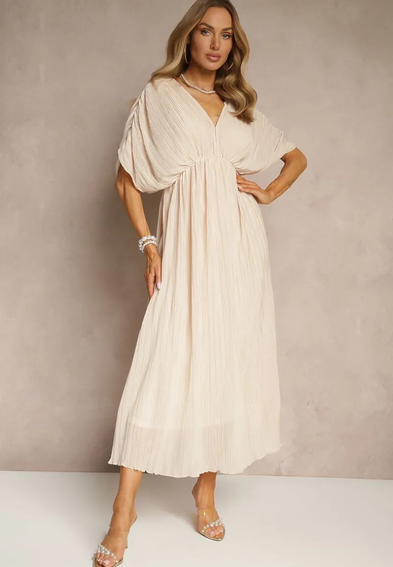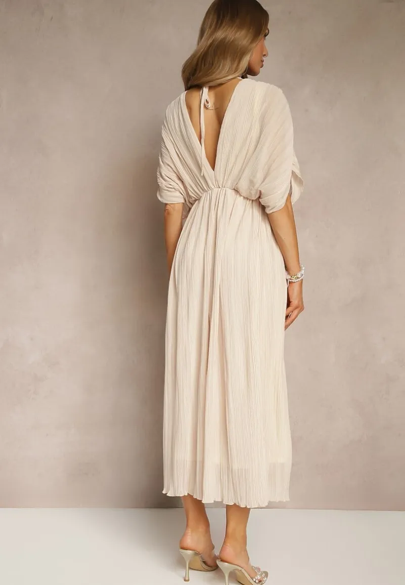Beżowa Luźna Sukienka Wiązana na Szyi Taliowana z Rozkloszowanym Dołem Napovira